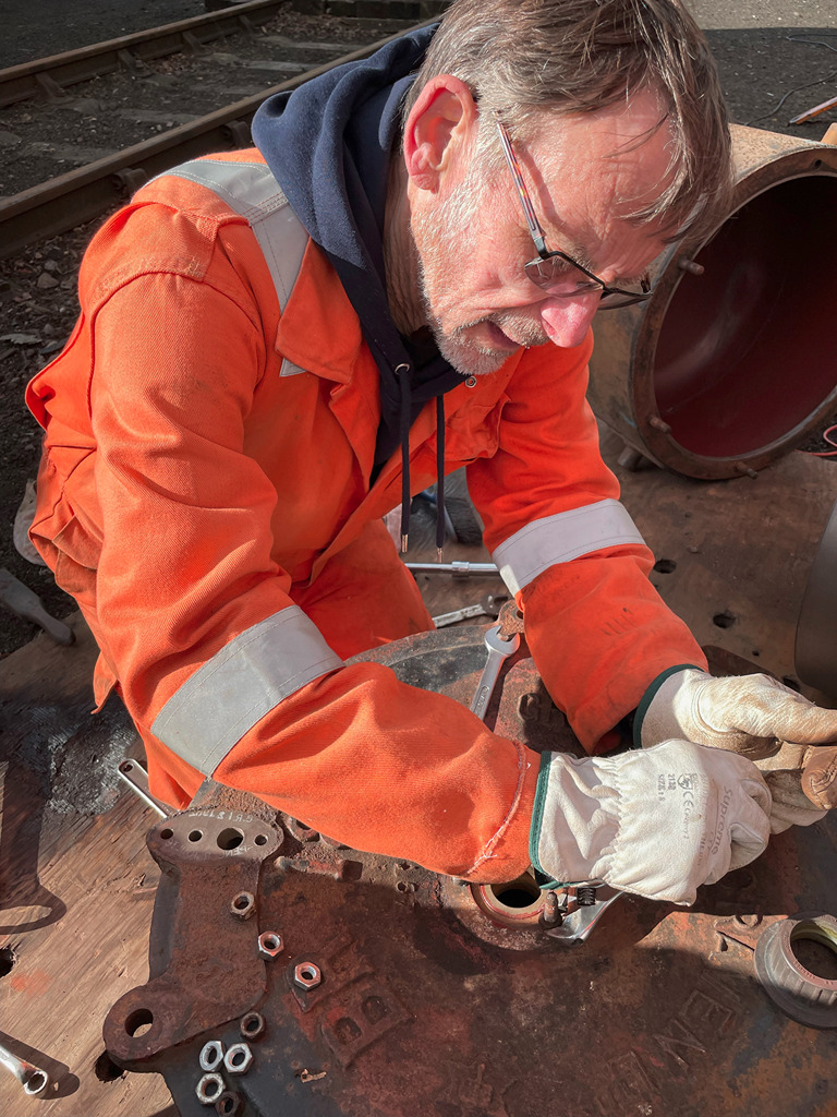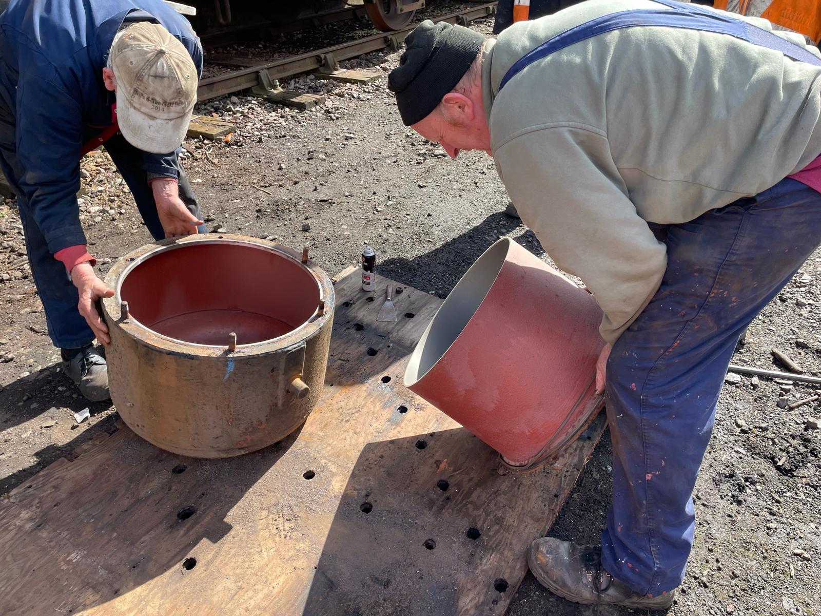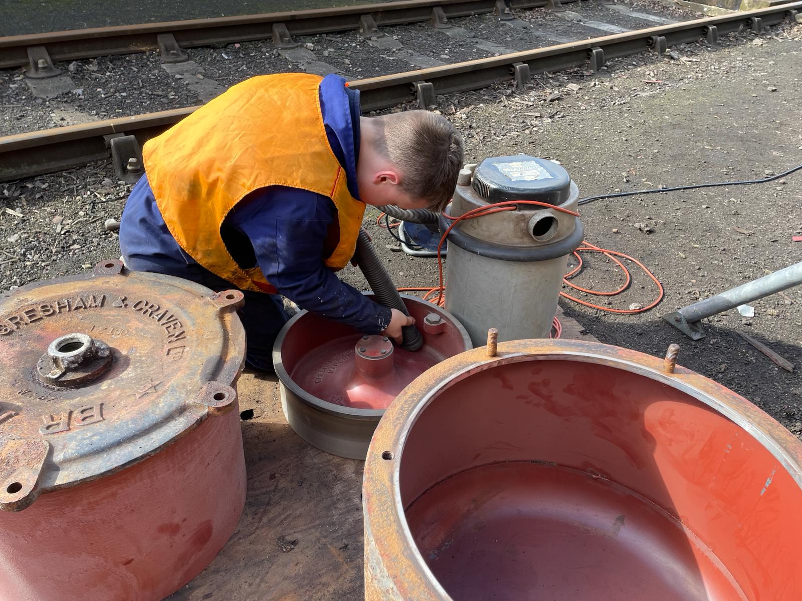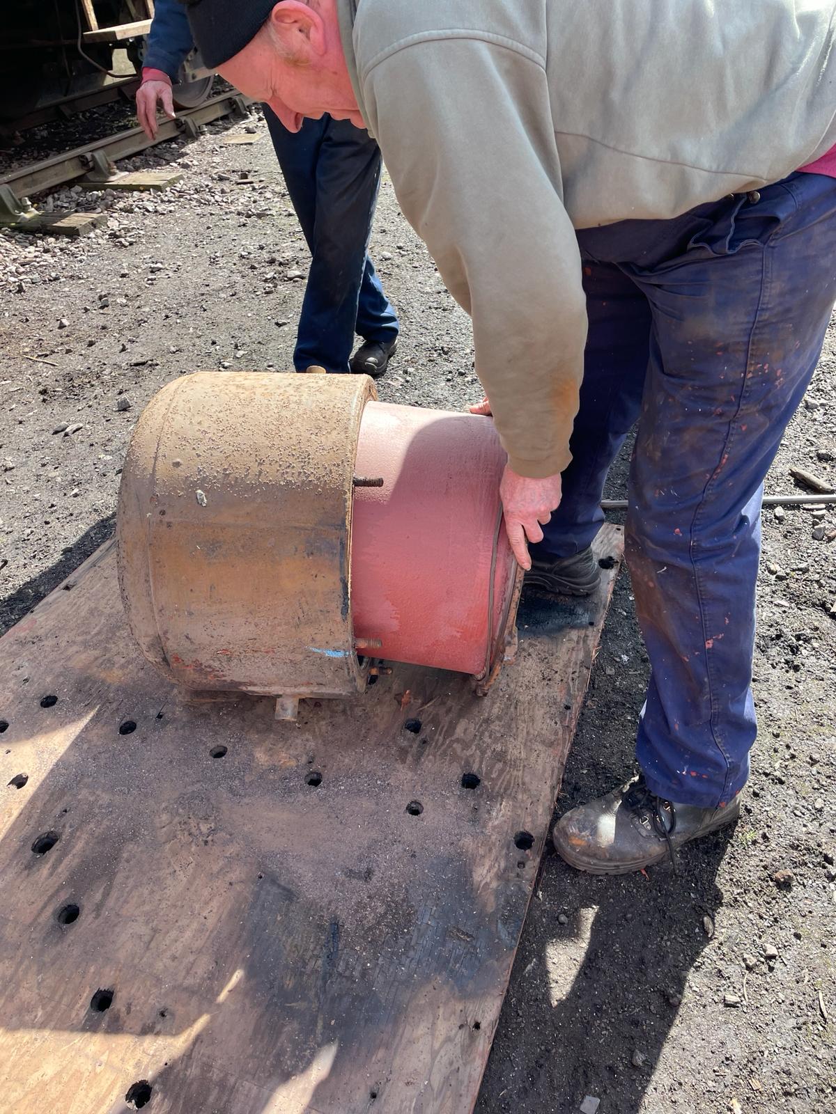 Ernie and Richard made a start on removing and refurbishing the vacuum cylinder, removing the release valve and lowering the cylinder before dismantling and cleaning it out. Oliver made a fantastic job of cleaning up the piston rod.