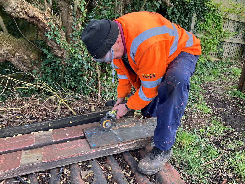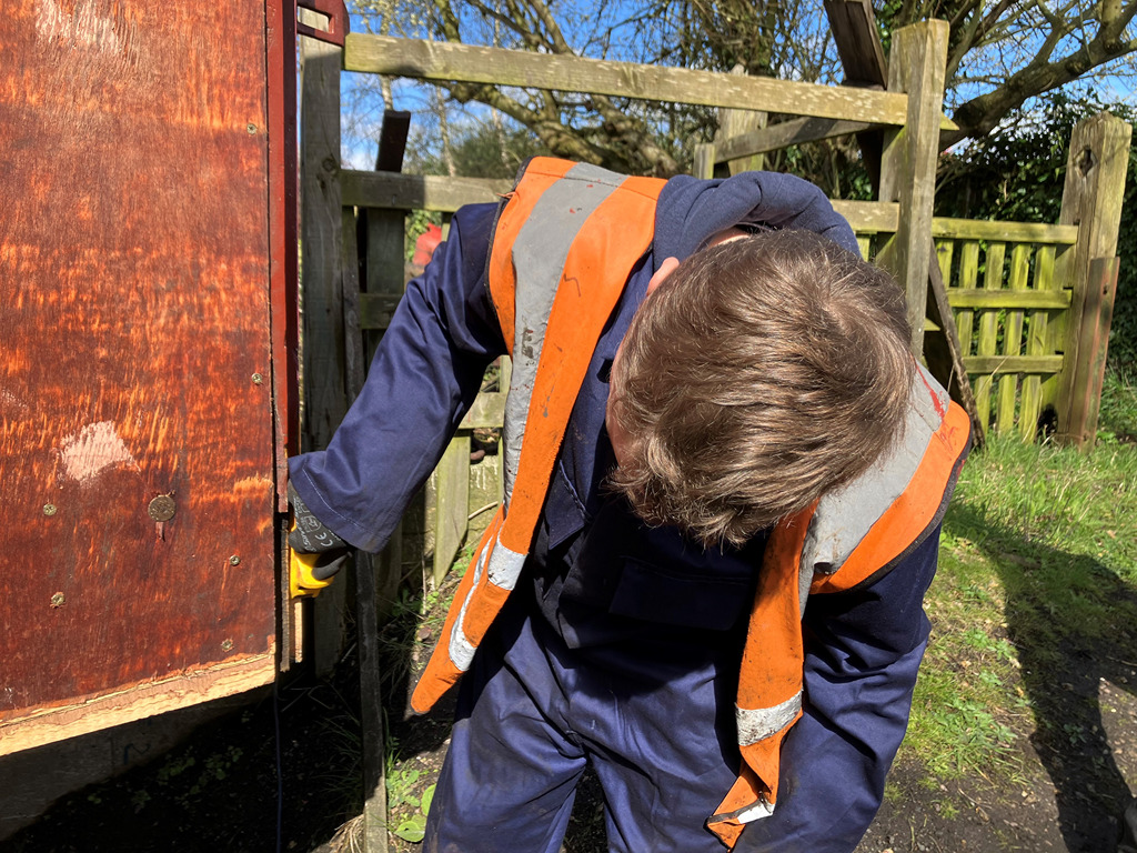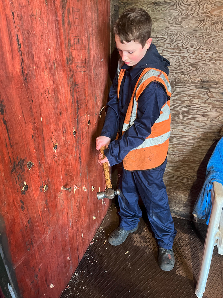 Saturday saw the team prepare the roof for the roof covering to be finally attached. some of the wood required fettling so the end hoops sit on the van correctly. The roof sheet was drilling using the hoop as a guide. This was then bolted down. Oliver and Dan spent some time removing the reflective stickers from the sheet’s previous life.