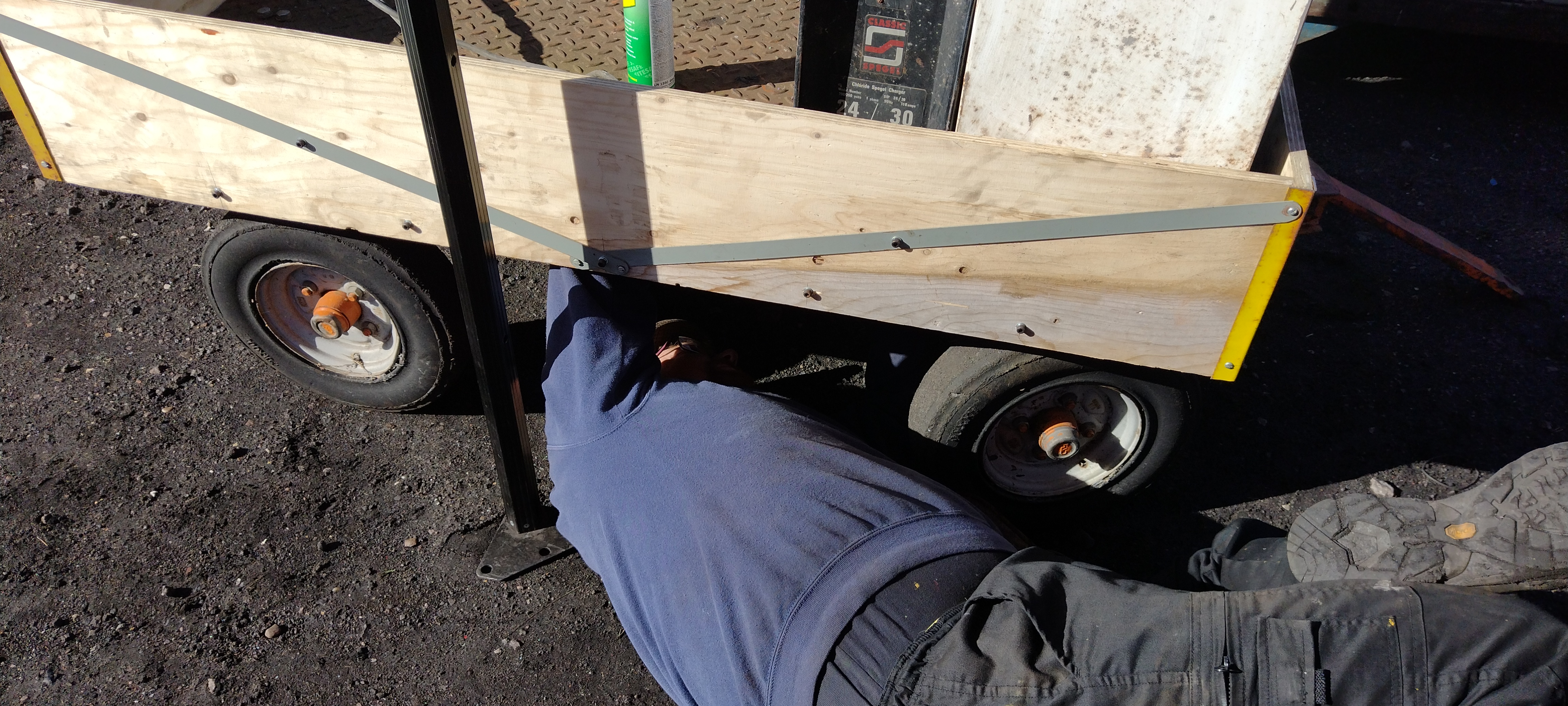 Matt started by taking the trolley that he and I modified last week, striping it a apart and applying primer to all the upper surfaces.