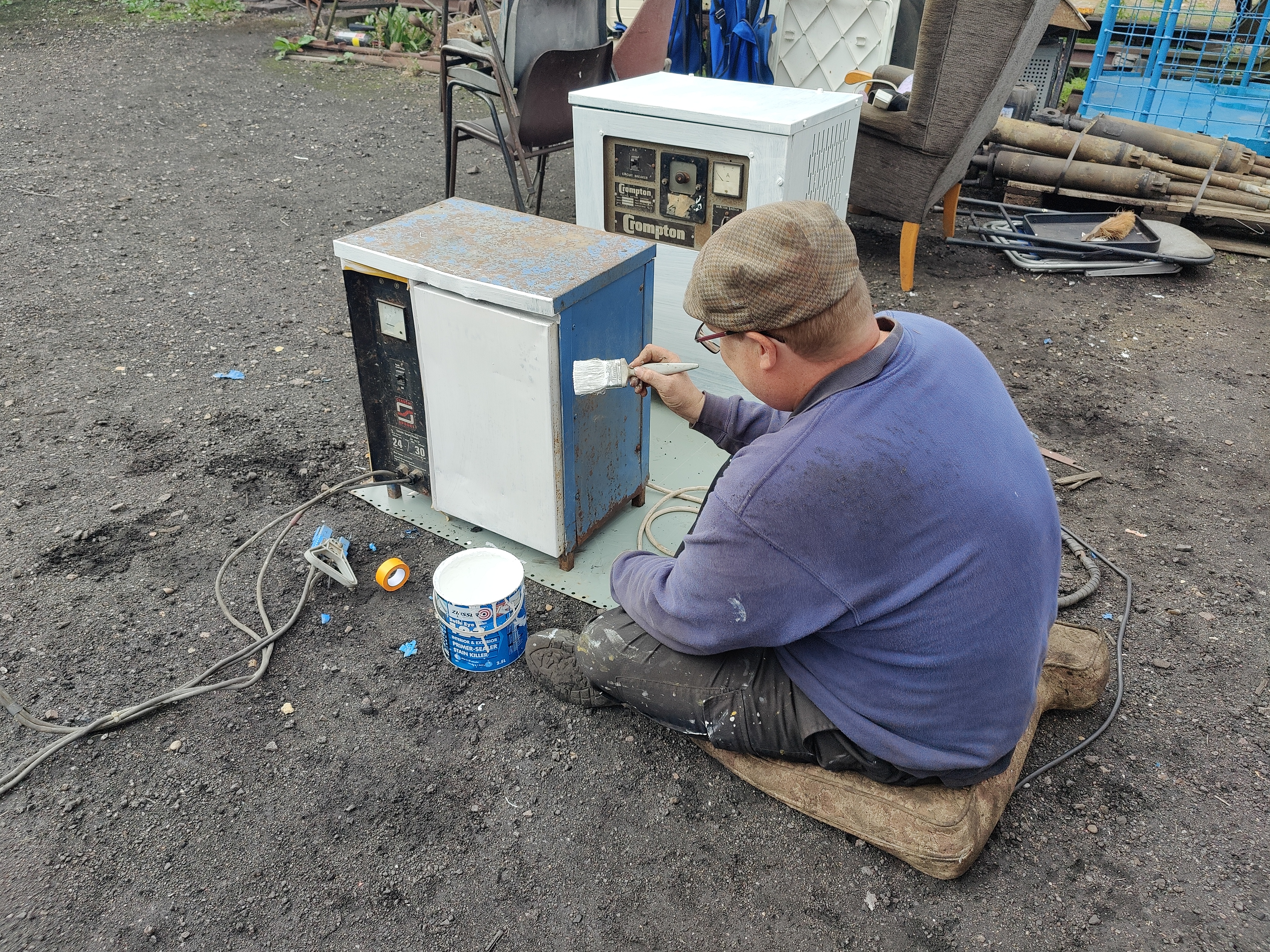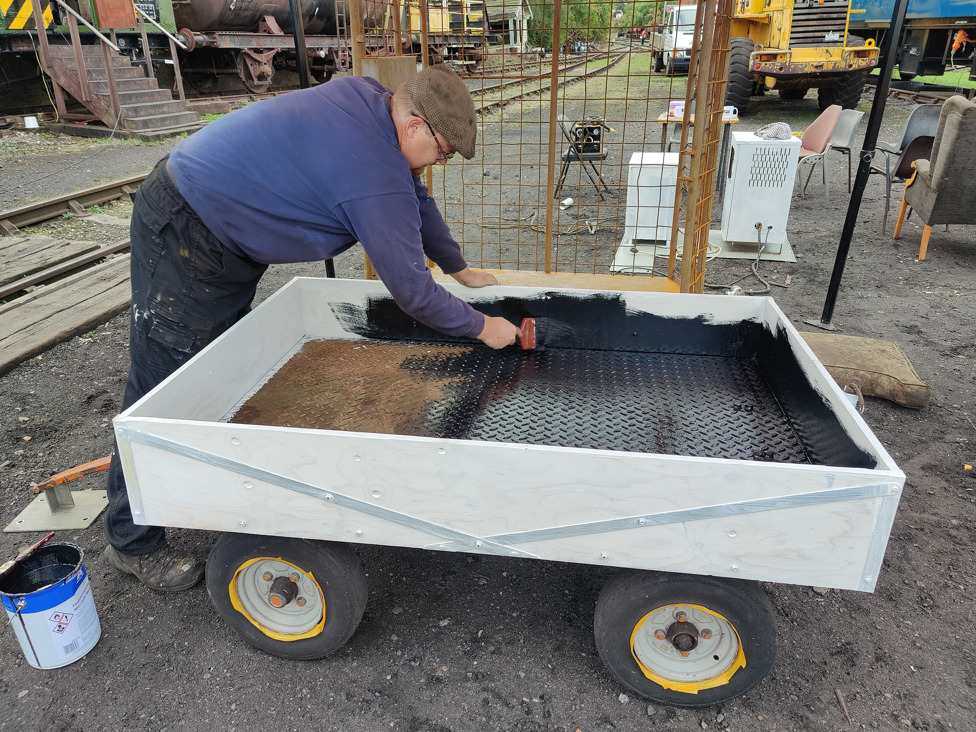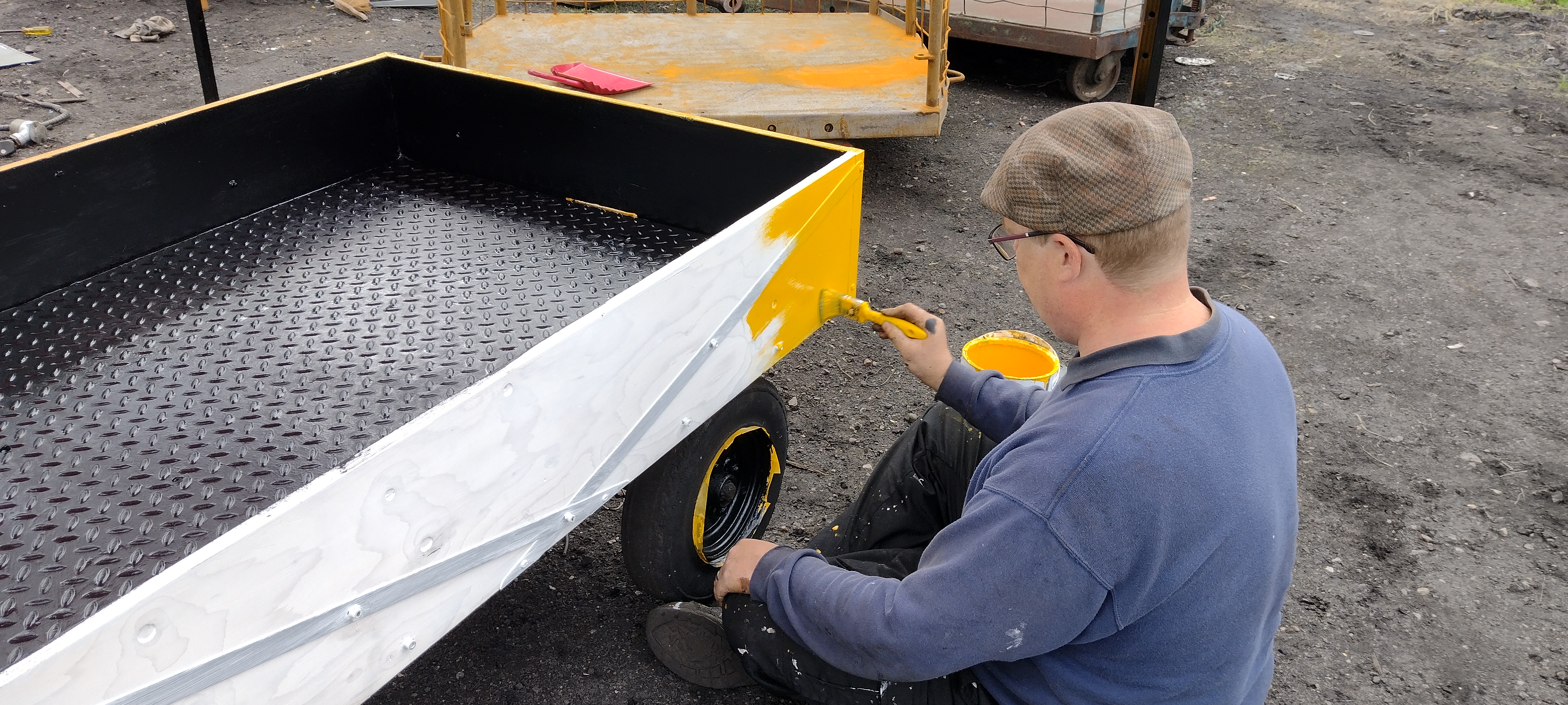 Once the primer was dry, Matt then got the black paint out to paint the floor and chassis of the trolley followed by the Yellow for the body work. The chargers also got a coat of yellow as well.
