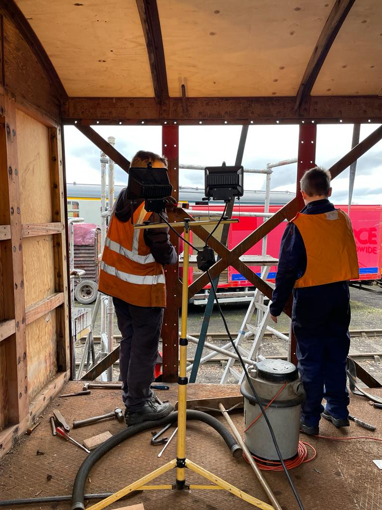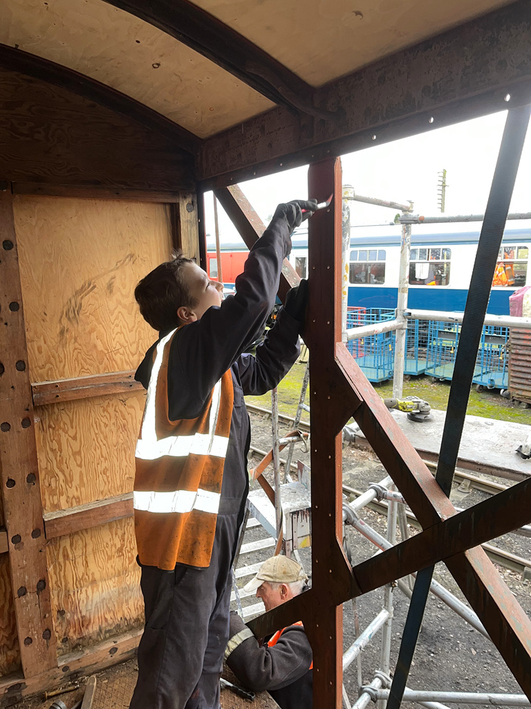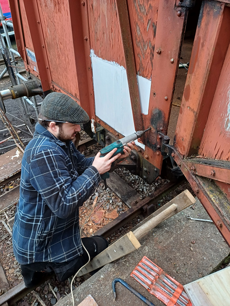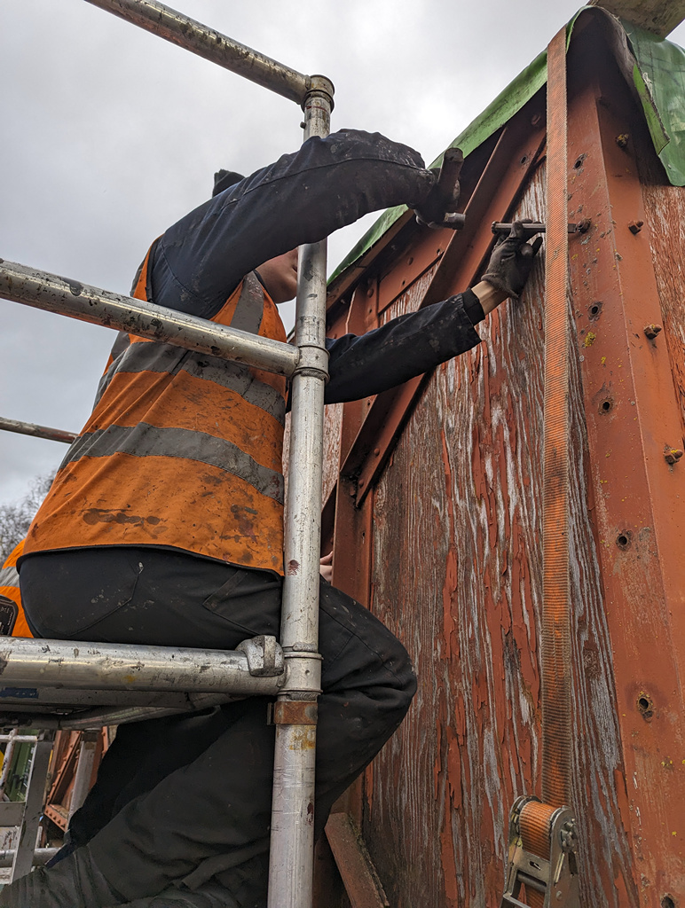 Once the side panels had been removed, the team split into two. One side focusing on cleaning down the metalwork and priming it while the other half fitted the side sheets that had been cut last week.