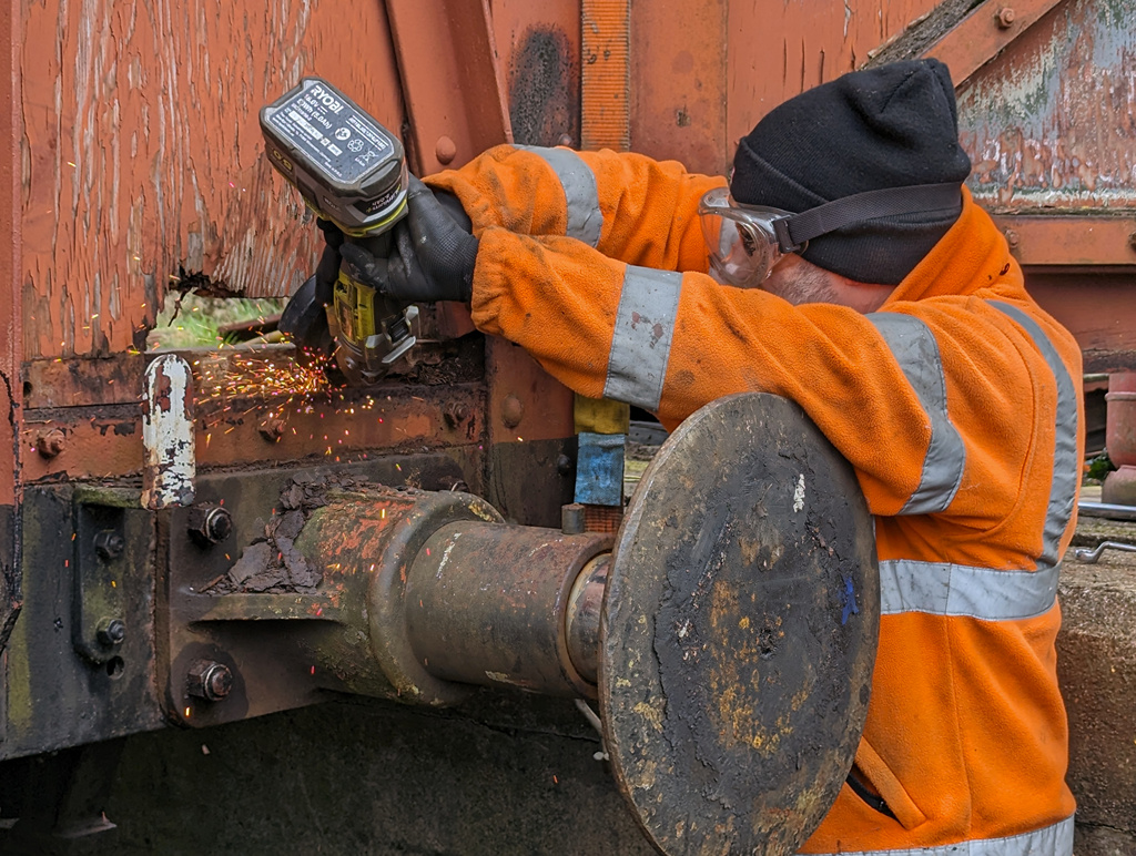 Now that all bolts could be accessed, the team made quick work of cutting the nuts in half with the grinder and then splitting the remaining portions so that the bolts could be removed. Some bolts had to be split using a chisel due to a lack of grinder access.