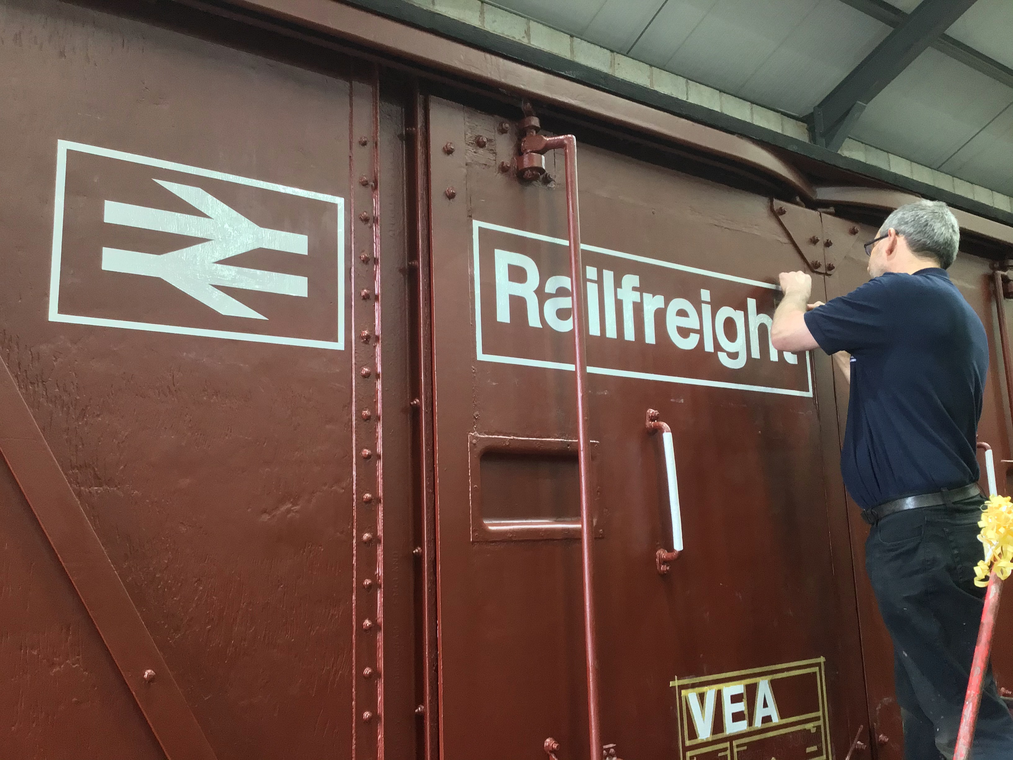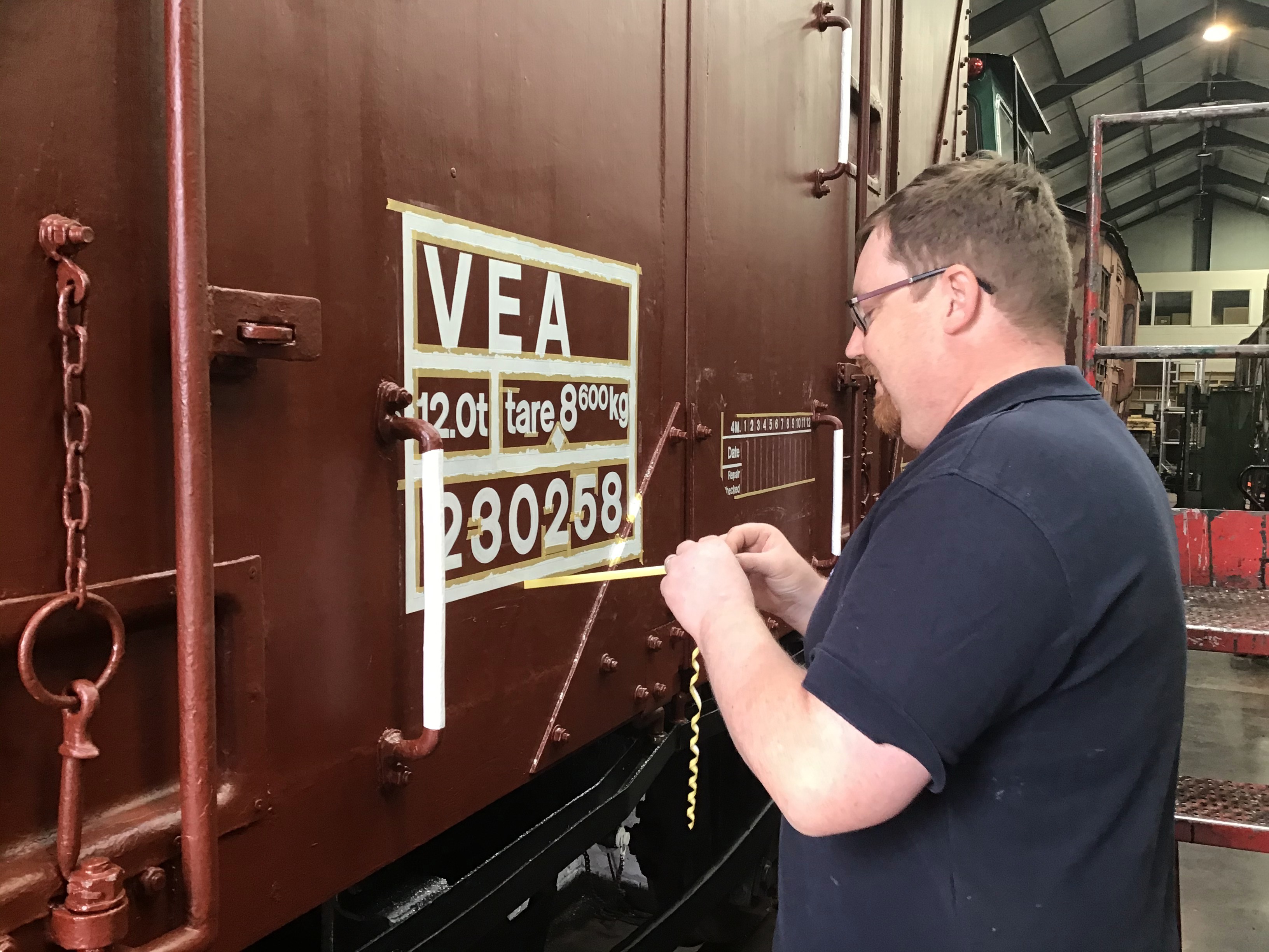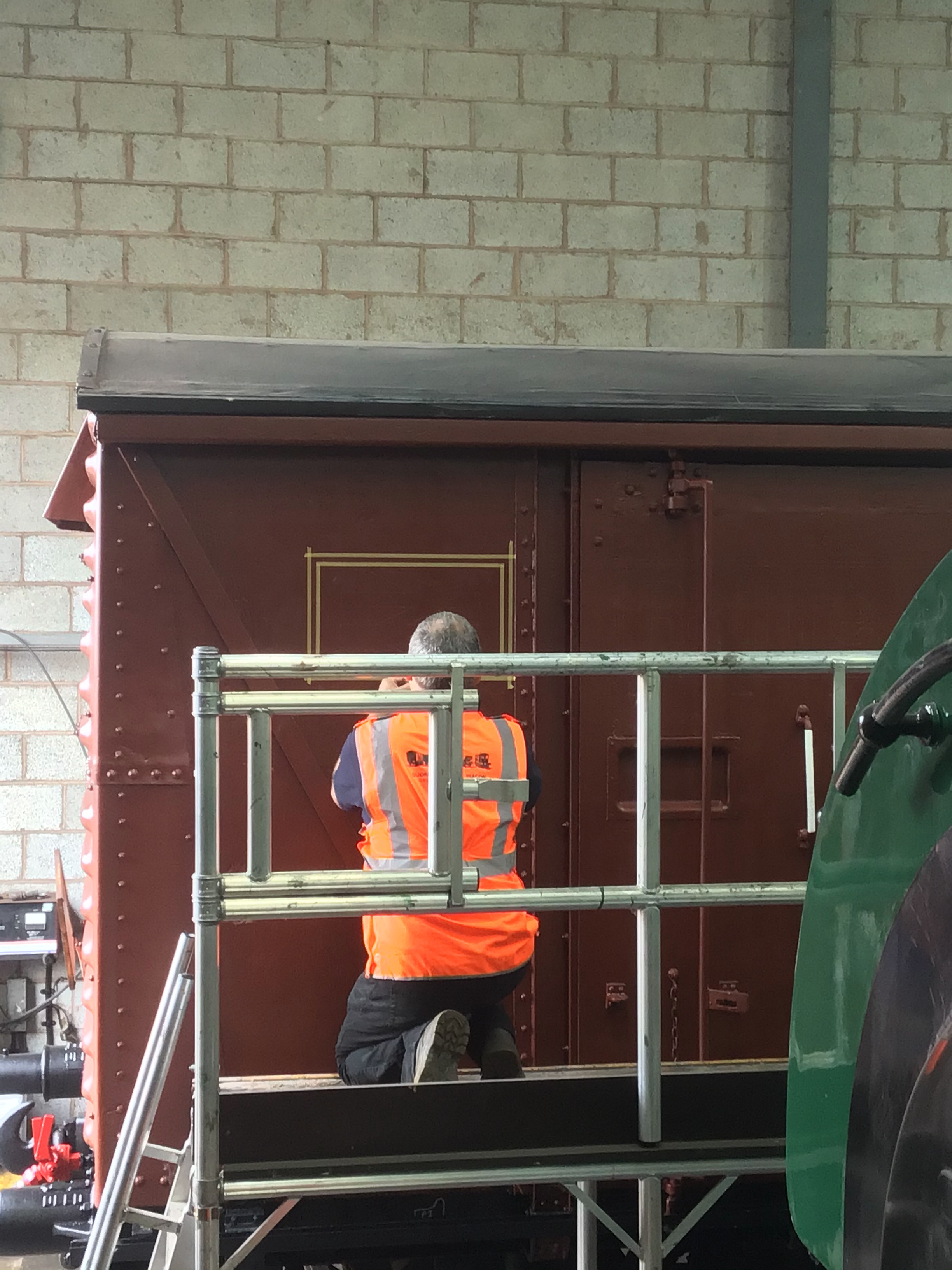 Last week, we left you with a coach that was cosmetically and bodily repaired and repainted, leaving just the varnishing to go. Before I get onto the varnishing though, I need to mention some work Matt and Dave did for the wagon group at Chasewater. Their group has been working on a VEA van, much similar to our own 230097 (B784409), and asked Matt and Dave if they’d signwrite the van into an early Railfreight Livery. Dave did 2 days (Wed/Thurs) and Matt just Thursday. The van really looks excellent, and Matt and Dave enjoyed themselves. Matt also enjoying seeing an original Master Cutler headboard!
