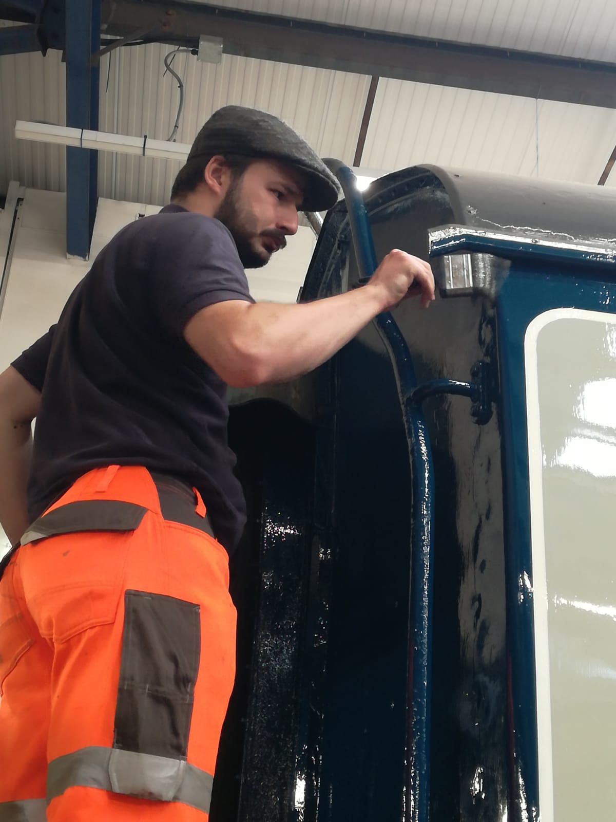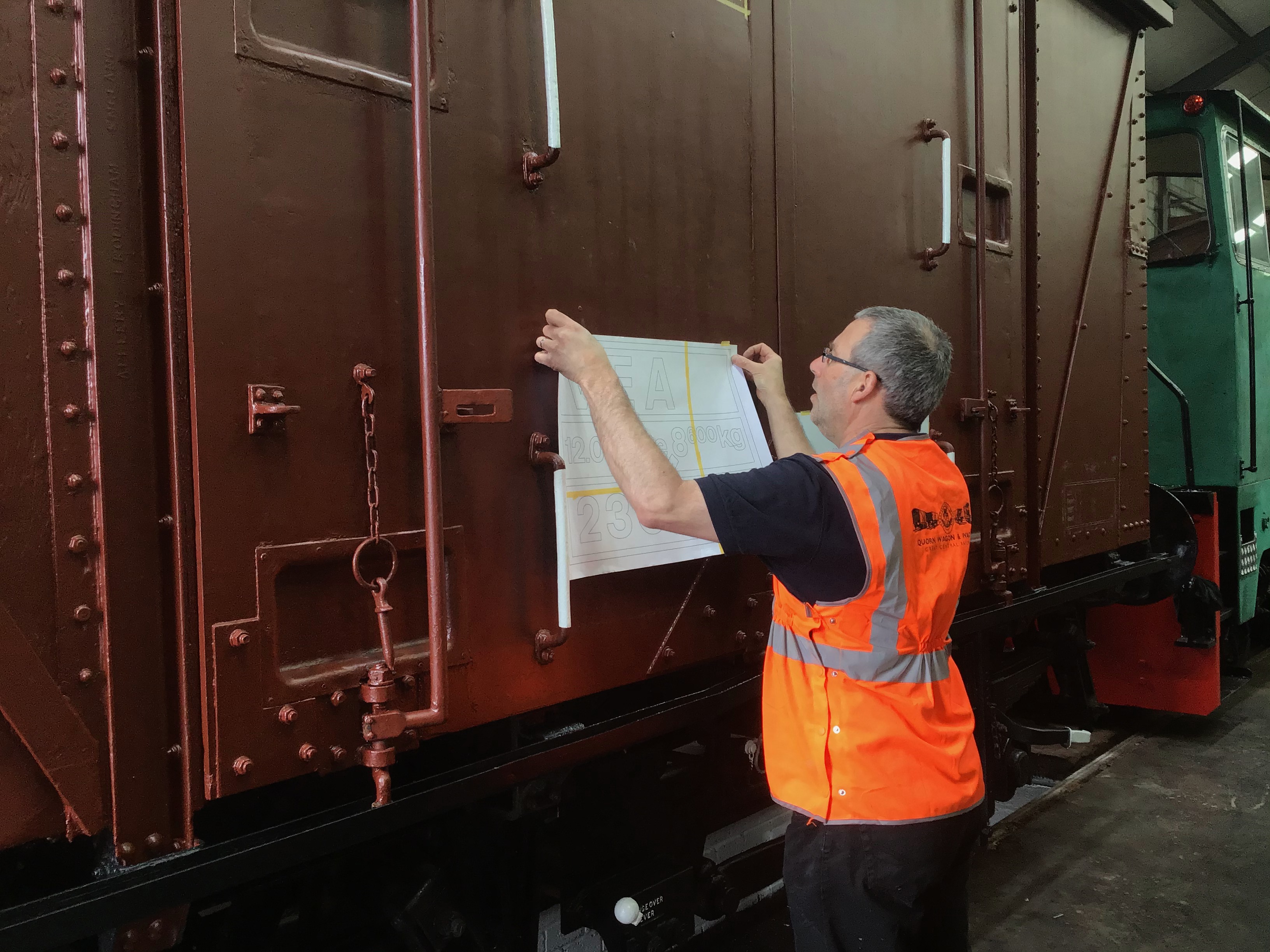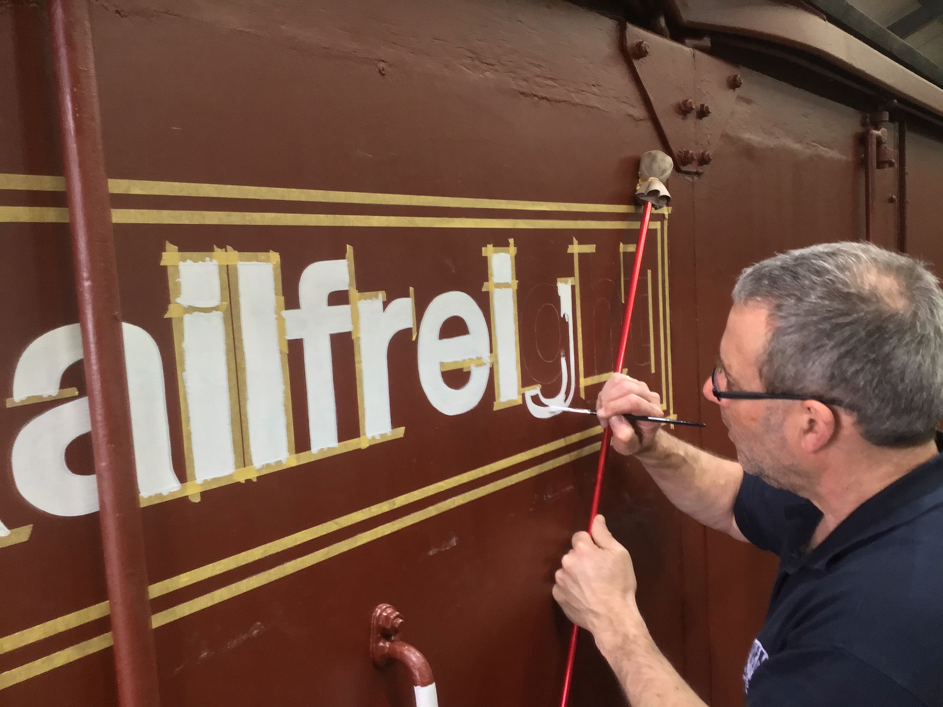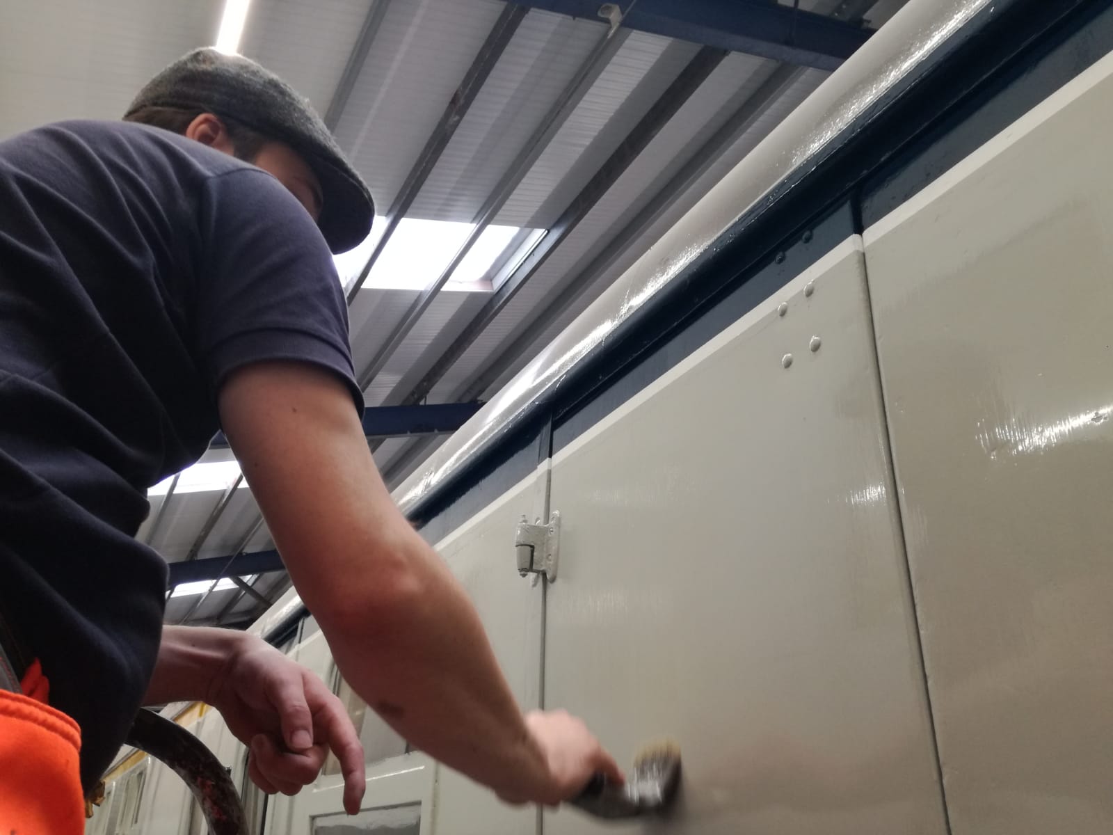 Last week, we left you with a coach that was cosmetically and bodily repaired and repainted, leaving just the varnishing to go. Before I get onto the varnishing though, I need to mention some work Matt and Dave did for the wagon group at Chasewater. Their group has been working on a VEA van, much similar to our own 230097 (B784409), and asked Matt and Dave if they’d signwrite the van into an early Railfreight Livery. Dave did 2 days (Wed/Thurs) and Matt just Thursday. The van really looks excellent, and Matt and Dave enjoyed themselves. Matt also enjoying seeing an original Master Cutler headboard!
