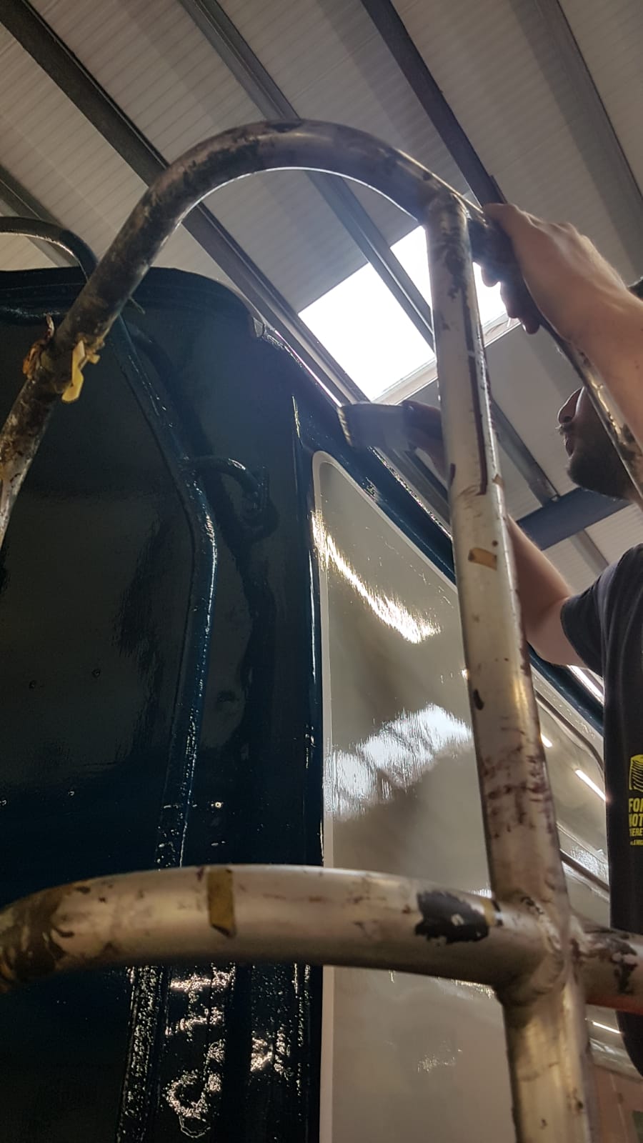Onto the weekend and working on both the Living Van and the Ferry Tank. The team began on Saturday by wiping down the coach. Richard and Jake then moved onto applying undercoat to the tank barrel and bodywork. Unfortuantely a bit of a patchwork as we didn’t seem to have enough grey undercoat to finish the tank. The gloss black will cover all the same though.