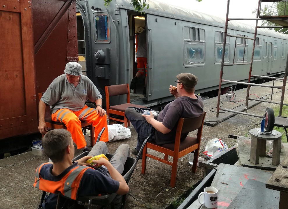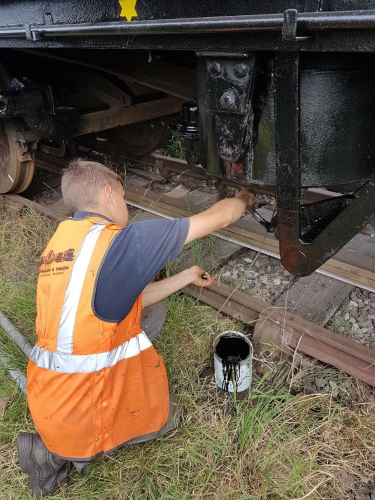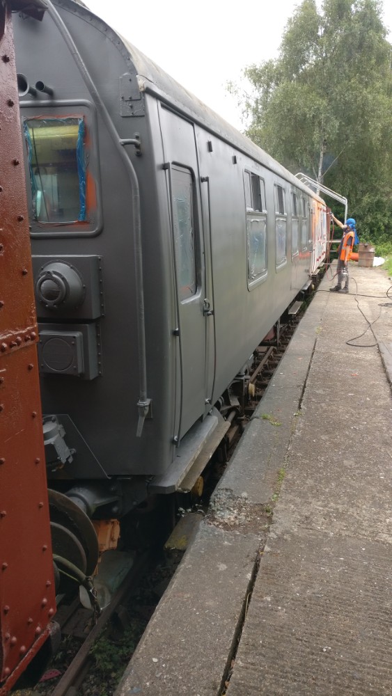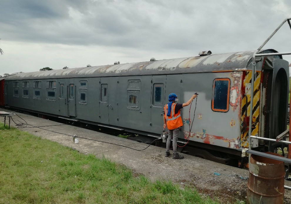 The coach got undercoated today, with Jake applying once I’d shown him how to assemble and use the pressure pot I’d recently bought. We thinned down the undercoat, and I set Jake on his way. Jake has been the first of us to use Test Car 2’s compressor to spray paint. Dave continued his work at the gangway end by brush painting inside the gangway, and the gangway faceplate.