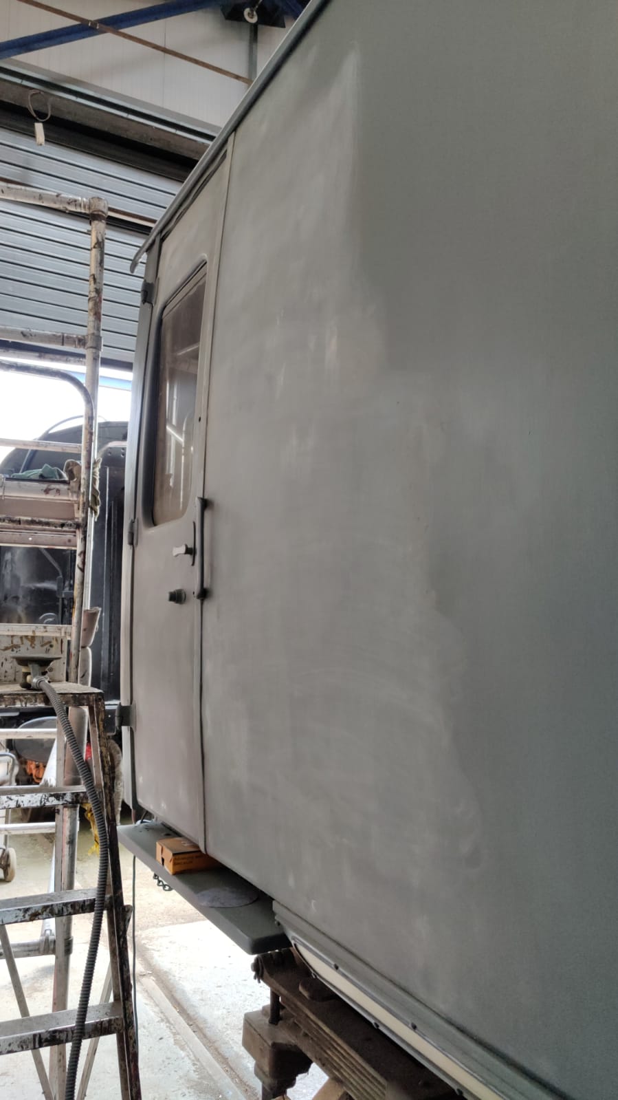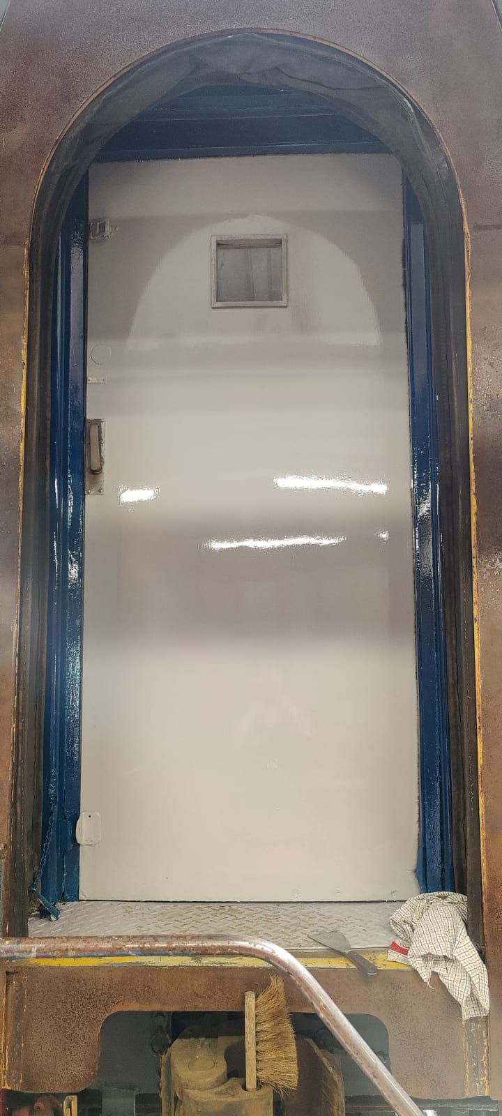 As Matt mentioned in last week’s update, I’ve had the past week off work and have spent it working at Rothley on the Living Van (we can’t really call it the Yellow Coach anymore!) Tuesday was spent painting the two sliding gangway doors into their first coat of gloss. Wednesday was spent sanding the undercoat on the bodysides with 400 grit paper, which left Thursday to finish off the sanding by hand in areas that couldn’t be done with the air sander and then to clean the coach down, ready for glossing at the weekend.