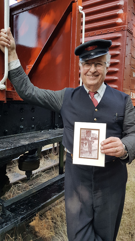 After an email to the GCR and being forwarded on to us at “Quorn Wagon and Wagon”. Robert came and visited on the 1st September 2018. We had spent a number of weeks repairing and carrying out a full interior and exterior repaint to M730562. We also added extra items that Roberts farther would have instantly remembered. Guards Bag, Tea Can, Paperwork, Newspaper, Railway Observer, Lamps, Shunters pole, Brake Stick along with other items. We also lent Robert a BR uniform identical to his fathers including the Midland Region Staff association tie he is wearing in the photograph. This allowed Robert to recreate the image of his farther. The artifacts in the vehicle brought back a number of further memories for Robert, playing with his father’s handlamp rotating the handle between Red, Green and Clear. His father sat fettling a wooden implement one end square the other round. With that description we handed Robert a Brake Stick and demonstrated its use as well as the use of a Shunters Pole.