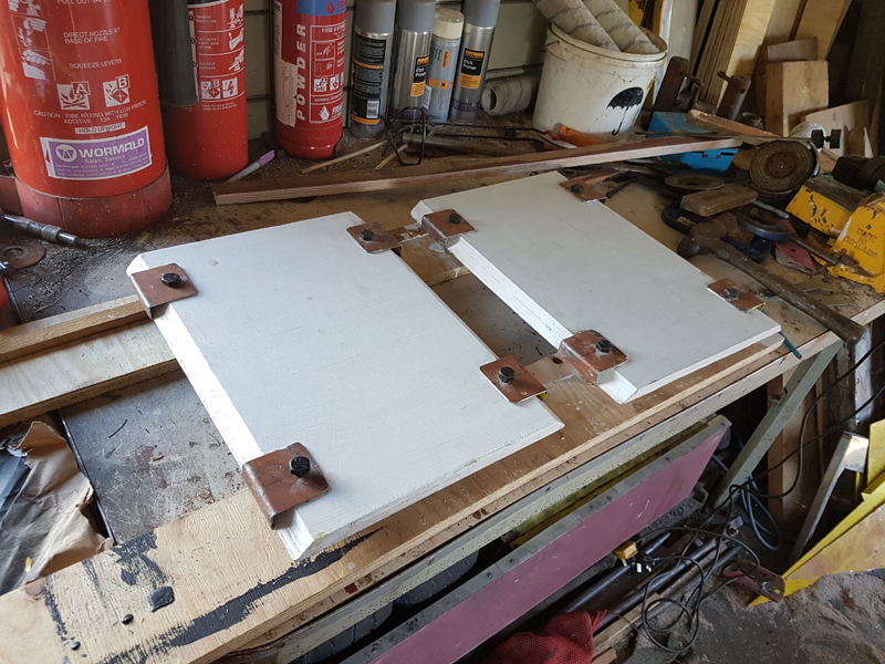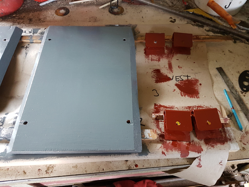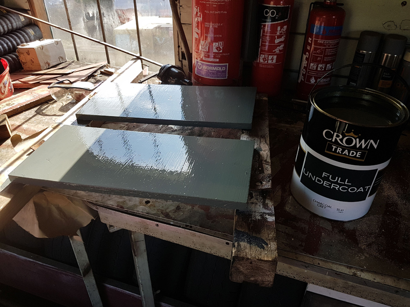 With the holes drilled I applied Red Oxide and Gloss to the brackets and undercoat to the chalkboards.
