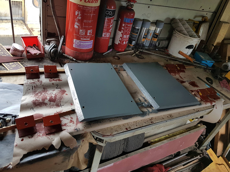 With a break in the weather I applied details to 280364s data panel and drilled holes for 281882s chalkboard brackets, these would originally have been welded but this is a facility we do not have due to power constraints. Red Oxide and Gloss was applied to the freshly drilled holes.
