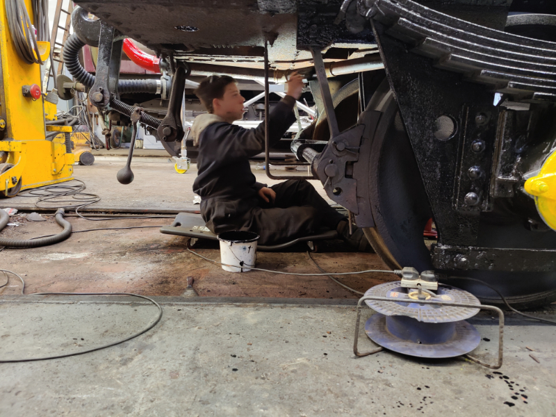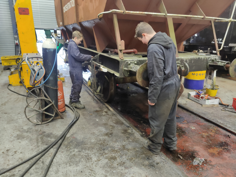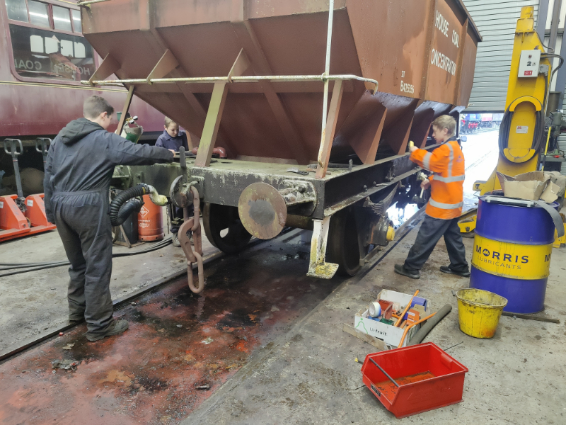 Dan, Tom and Oliver made a start on the next wagon, the 21t Coal Hopper. Out came the scrapers and the wagon body and underframe was scraped to get it ready for paint.