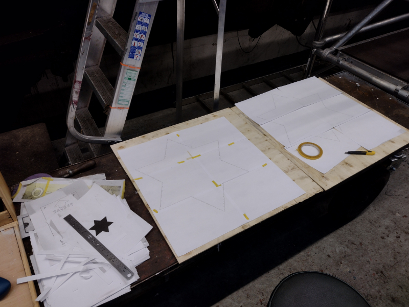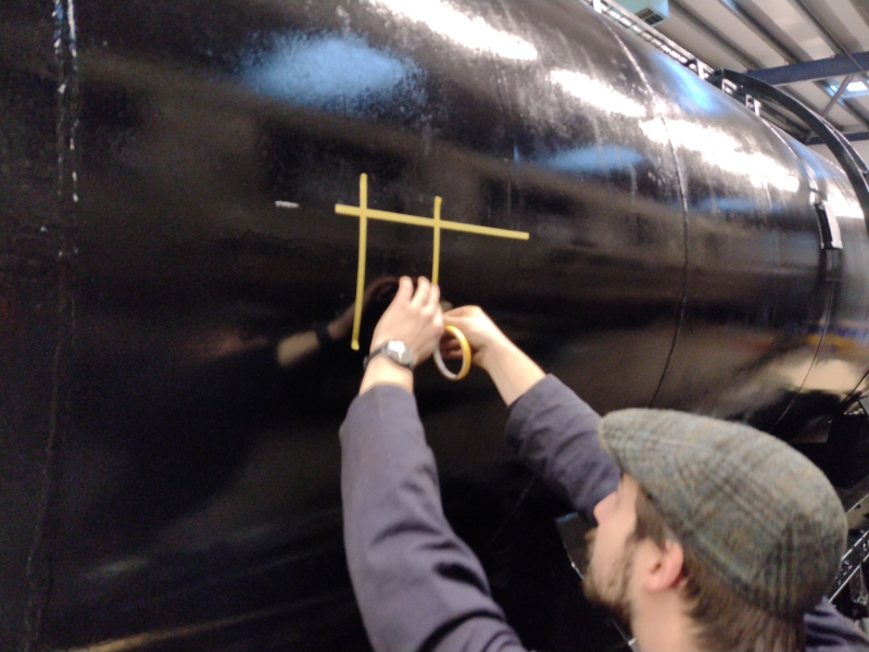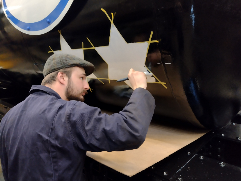 While Dave was signwiritng, I taped up the big stars, keyed the paint and applied the first coat of white on both sides of the tank. This will need another coat on another day. I also taped up and applied some undercoat for the Commuted Charge symbol.