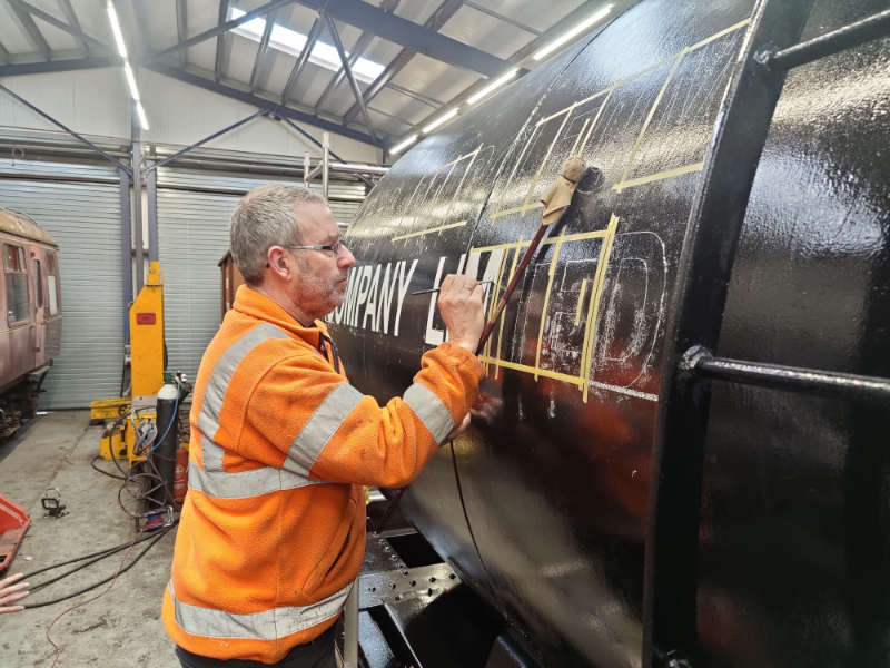 Tuesday saw Dave and Matt on site. Matt concentrating on the Esso plates, with Dave setting up the other signwriting and making a start on the east side solebar.