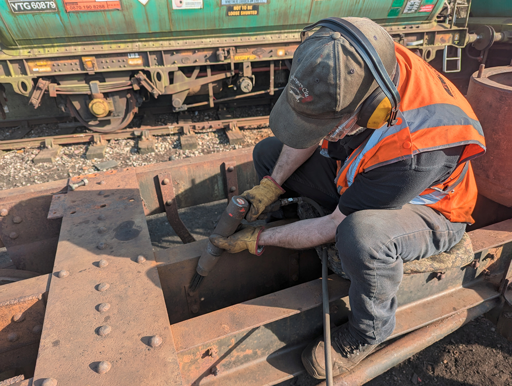 We’ve continued the push on the tank wagon chassis, CEGB 48521, with Dave, Harry and Ernie making good progress on needling gunning and scraping the scale, corrosion and old paint from the chassis.
