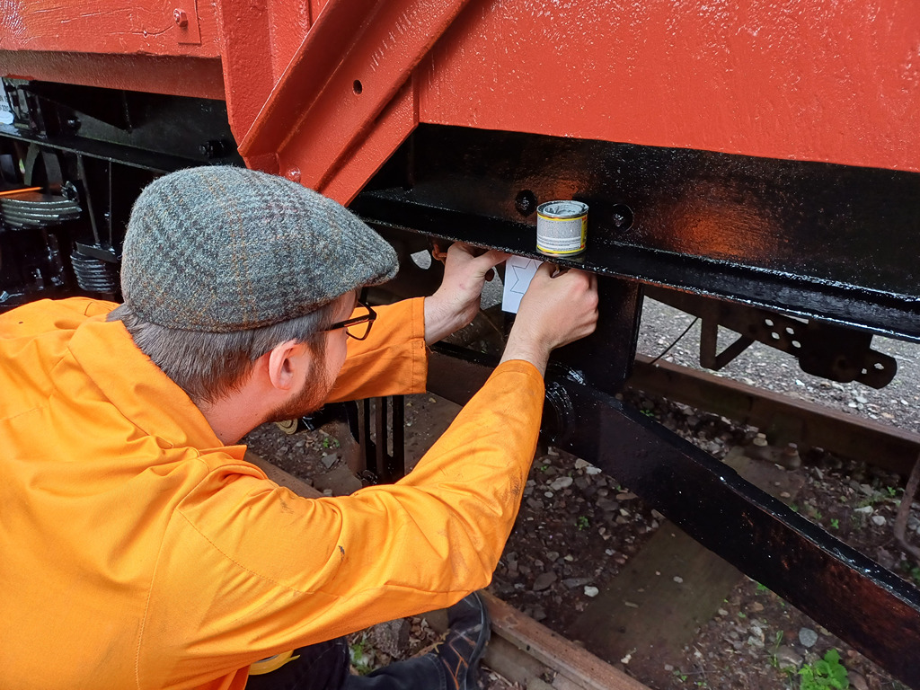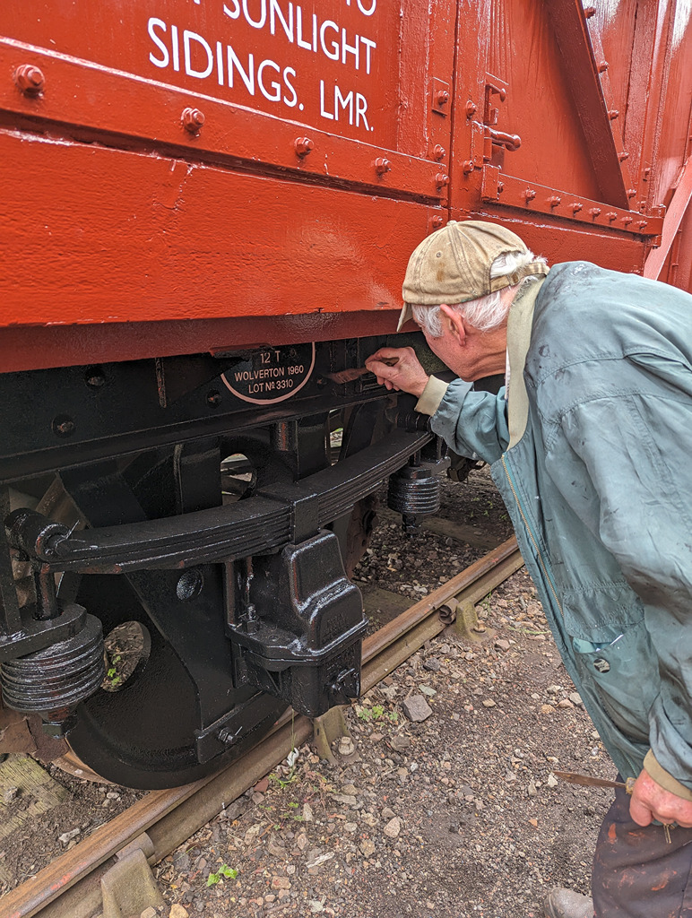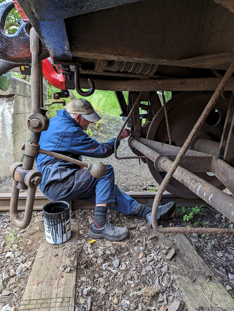 Ernie concentrating the under-frame details and touching in the black, including scraping and painting the bottom side of the headstocks.