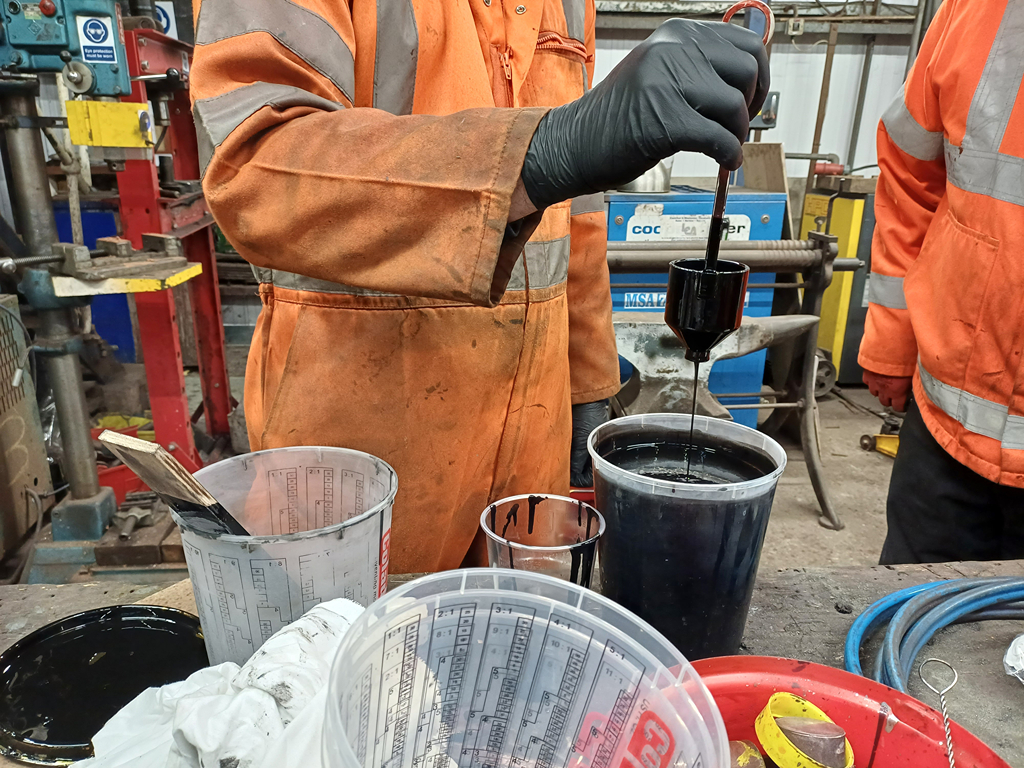 I treated us to a new spray gun, and made good use of it on Saturday. I spent some time getting the equipment set up and talking Barry through the set up. Dave put together the templates for A6090 so that we can make a start on the signwriting. Barry and I got to the stage of mixing the paint.