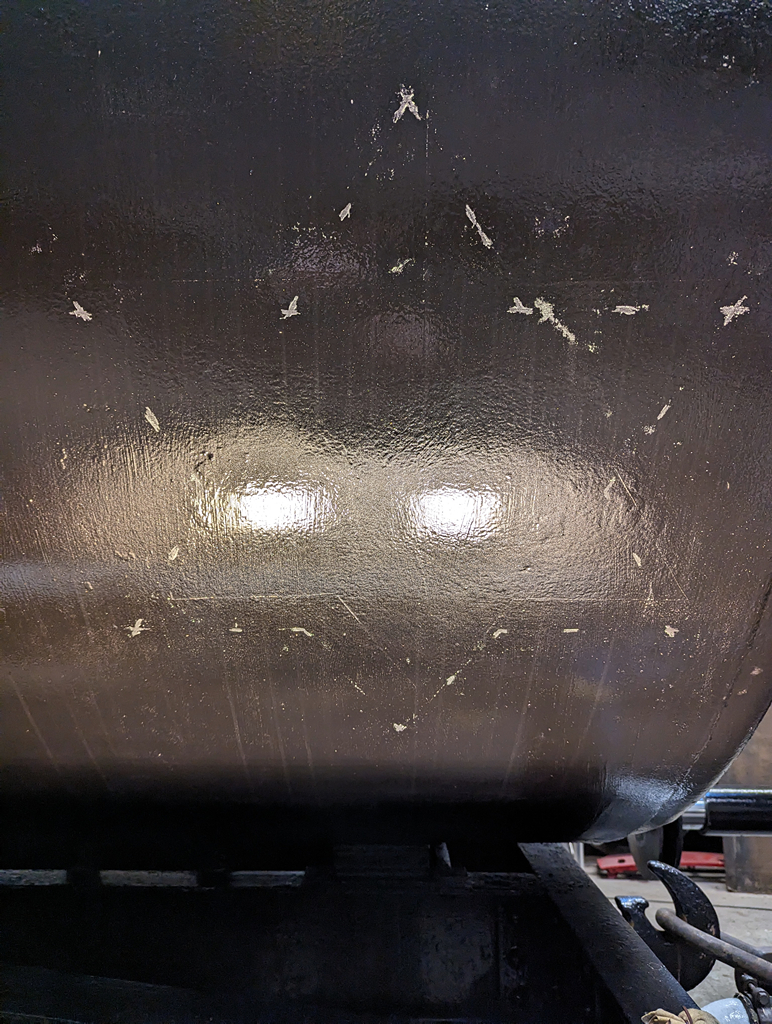 Barry very ably assisted me while I was spraying the tank, moving steps, carrying the pressure pot and making sure that I didn’t get tangled up in my own hoses. Dave avoided us and started to paint the W irons and underframe on the opposite side to where I was spraying.