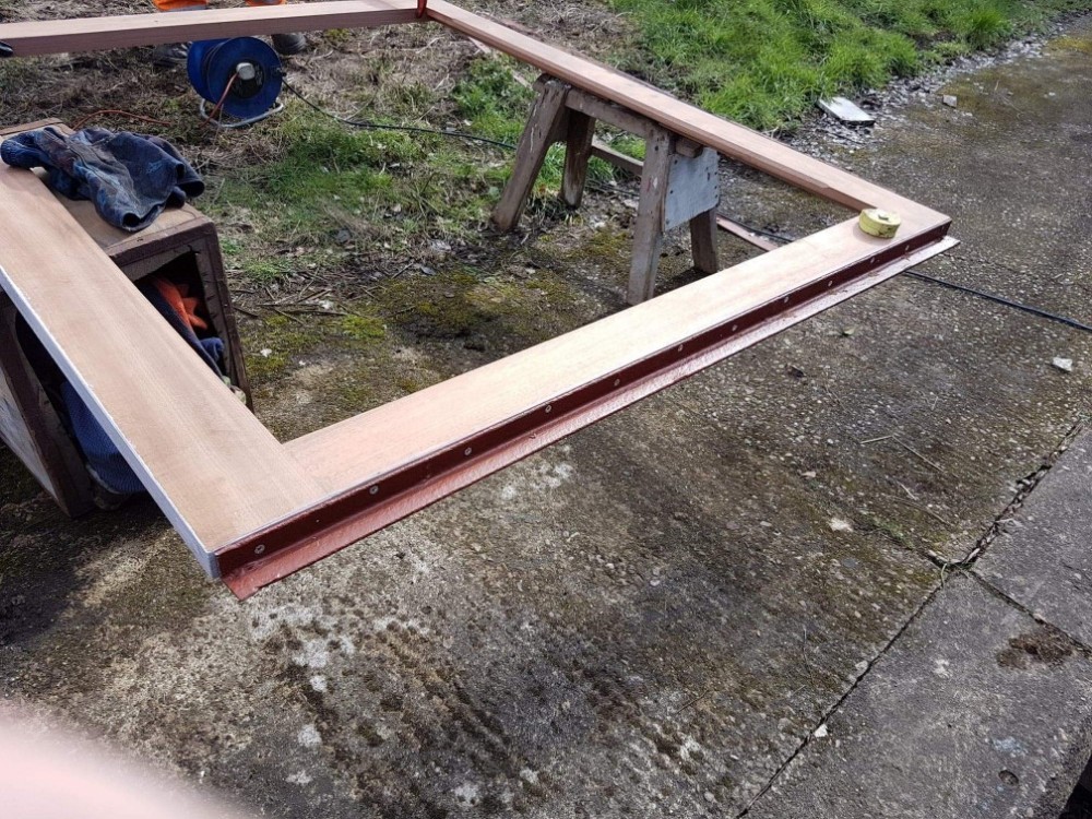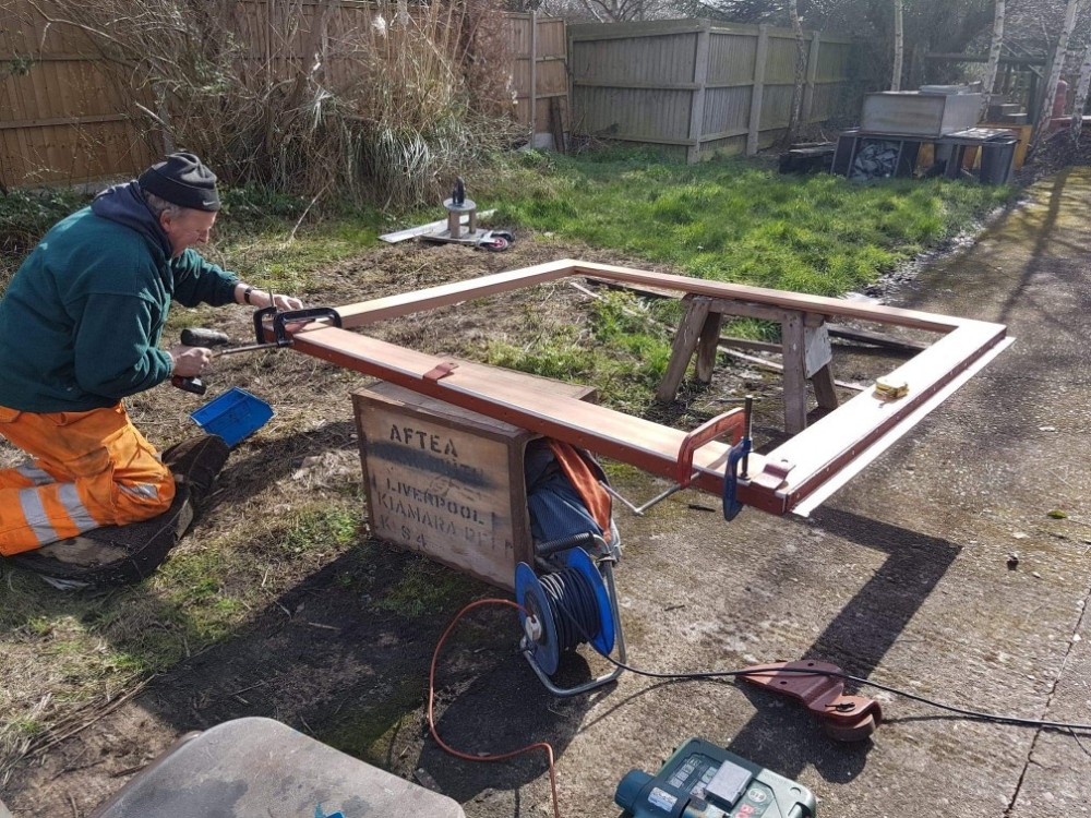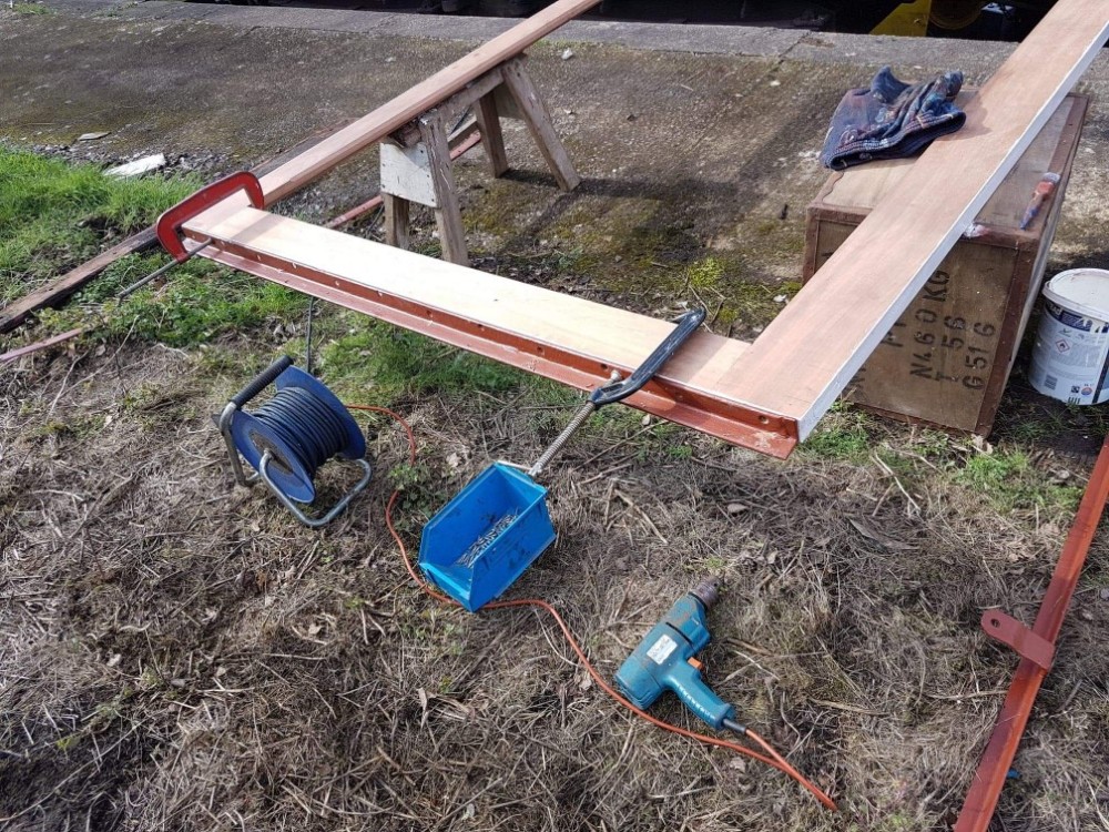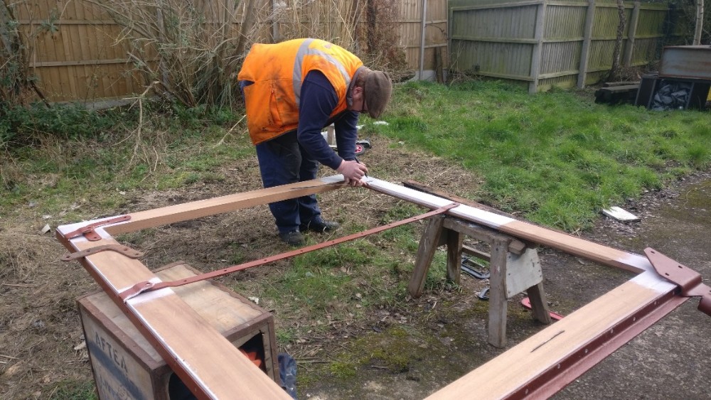So the day begins, we began by building up the door frame with all the bits of steel framework to enable the door to be refitted to the van. Taking advantage of the good weather, Matt and Nick set up shop on the dock. Before mounting anything to the frame, areas where things were to be mounted had a generous coating of wood primer. A tea was consumed to allow the paint to dry a little bit, and then the top and bottom angle irons were fitted.