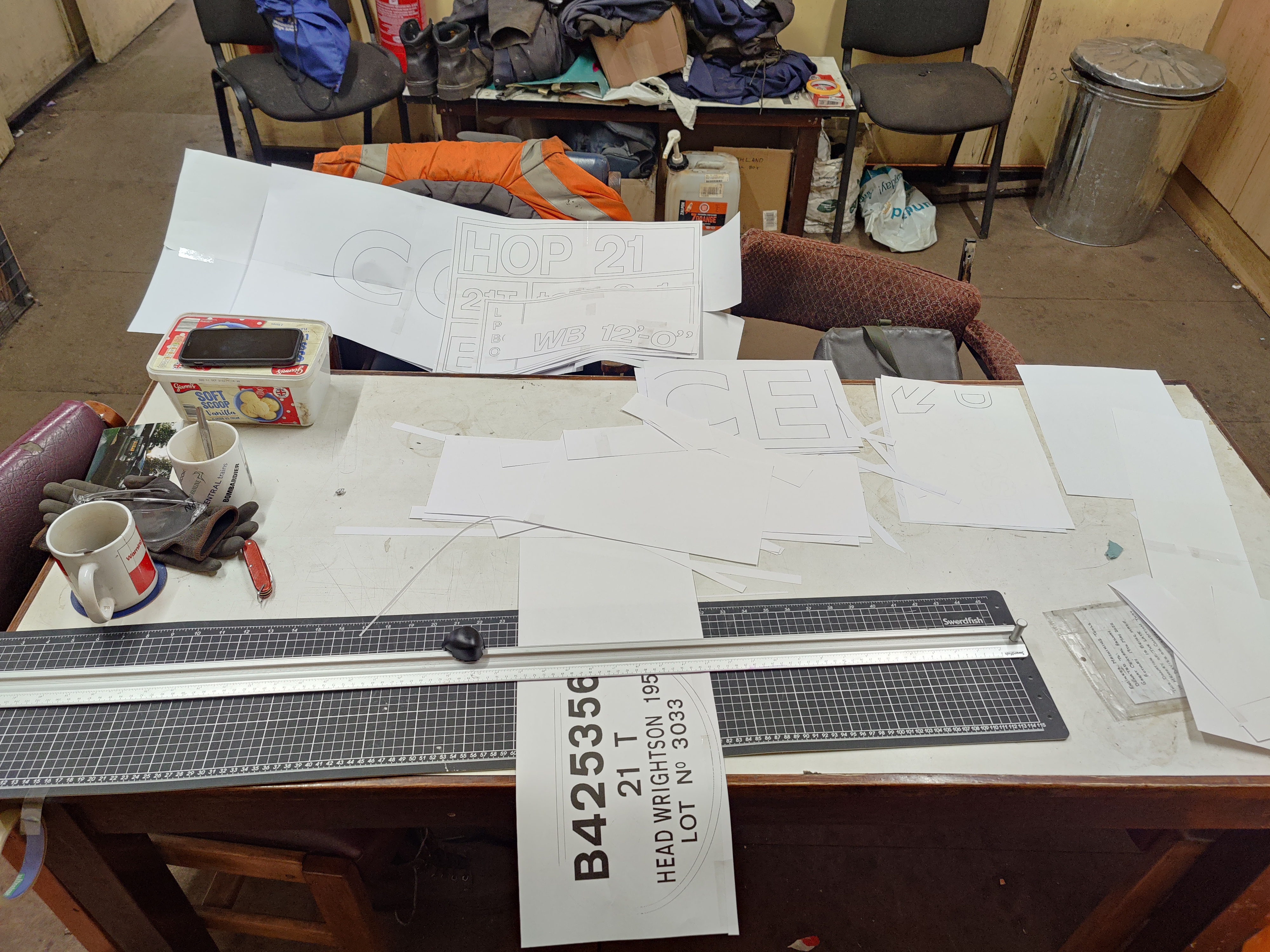 With Dave at Doncaster with West Hill Wagon Works, I was the sole signwriter this week. I started by assemmbling the templates from the A4 pages. After this I chose to start with the post-1964 number box, moving onto the data panel.