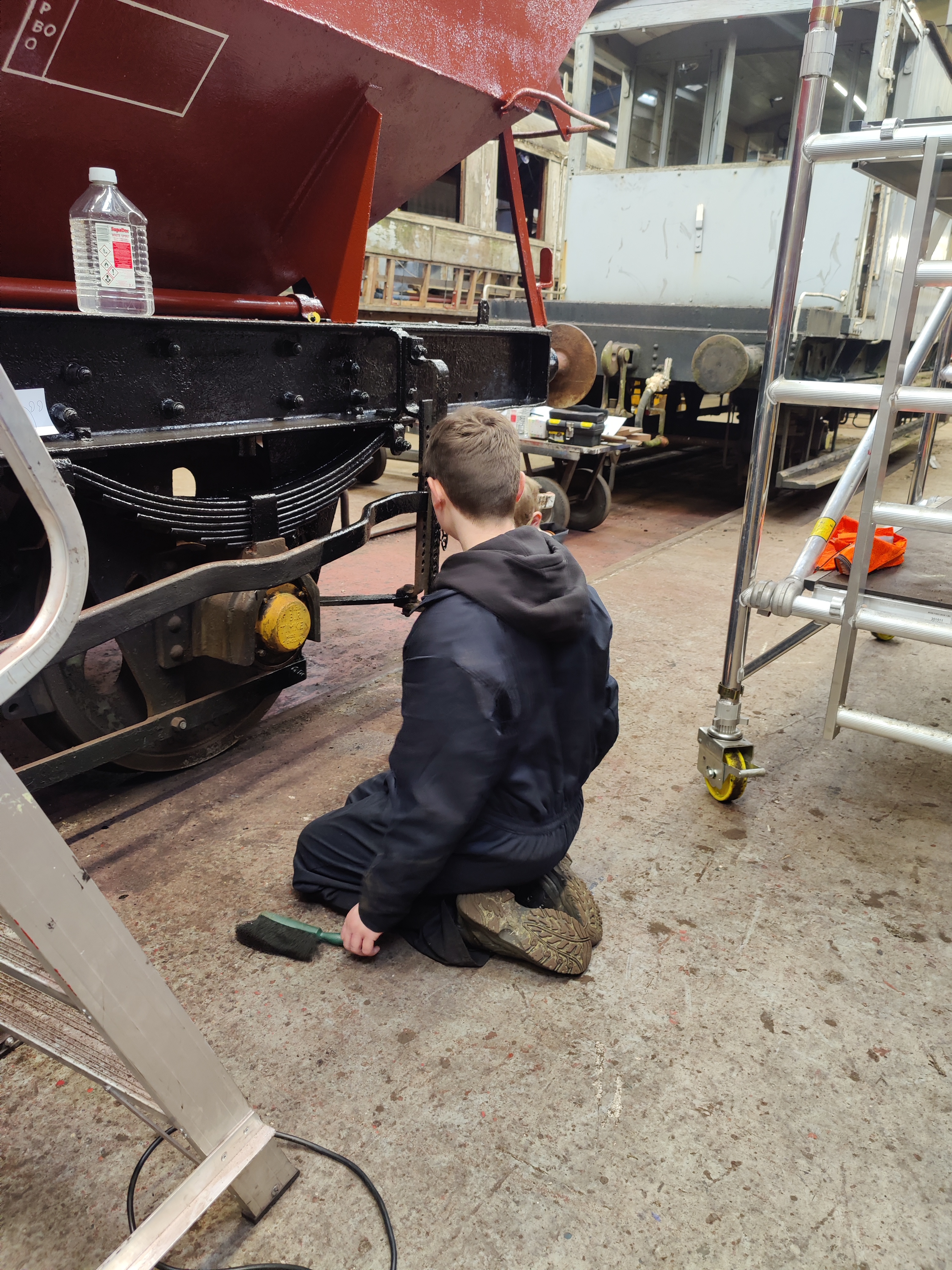 Sunday saw us joined by Tom and Dan, who also finished off some of the black underframe painting. Once this was done Thomas, Tom and Dan moved onto the white undercoat. Thomas took care of the end handrails and made a superb job. Tom and Dan made a good job of the handbrake lever ends, the door trip levers and the vacuum swan-necks. Nick kept hold of his black gloss brush and completed any areas missed on the underframe, and where I had finished signwriting.