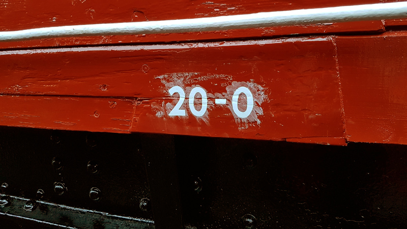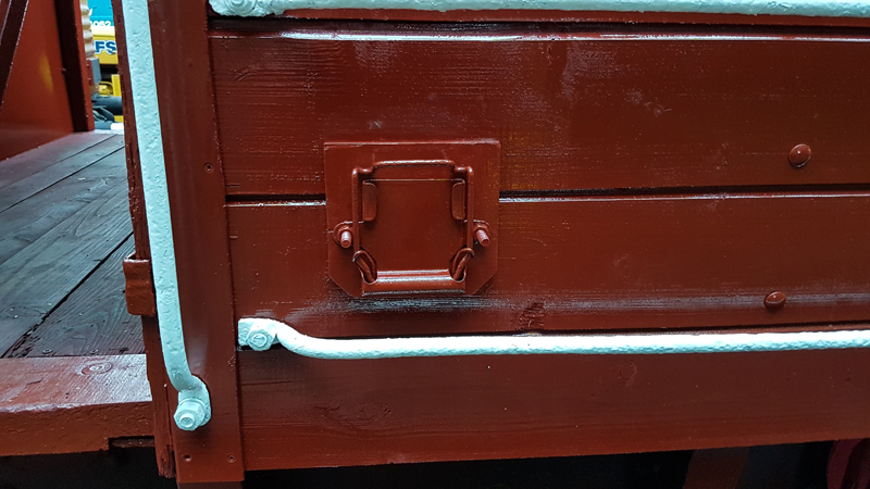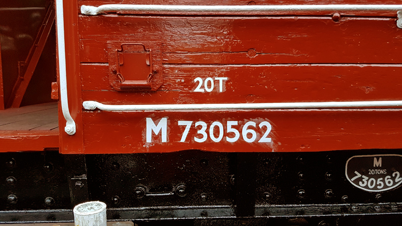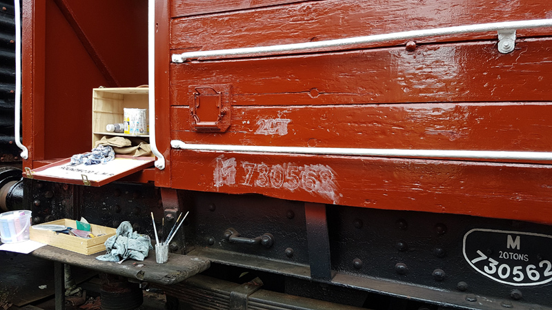 Between coats of white and the spots of rain, I chalked and painted the signwriting to the West side of the vehicle and Nick refitted the Wagon Label clip to the East side removed for planks to be replaced.