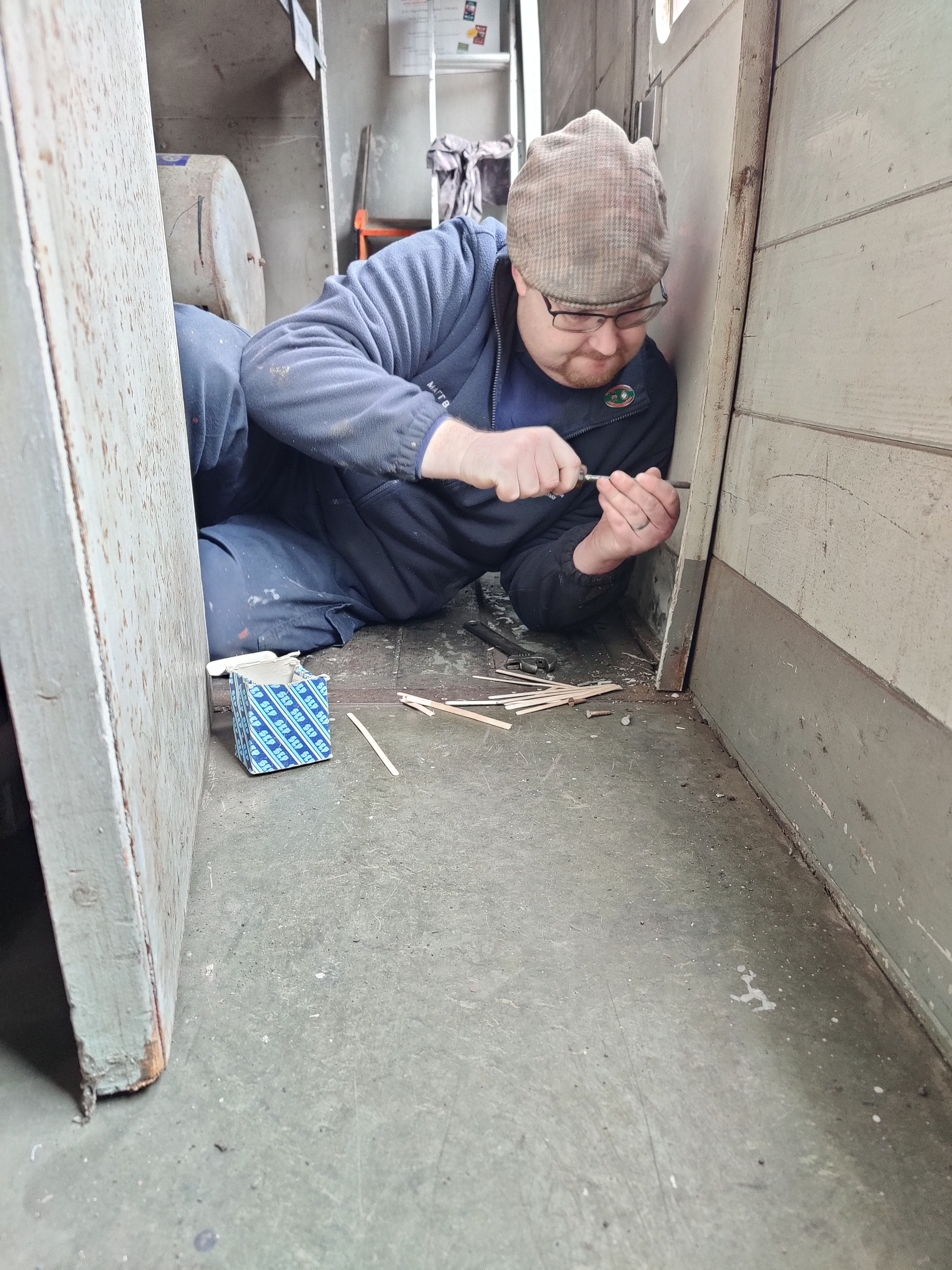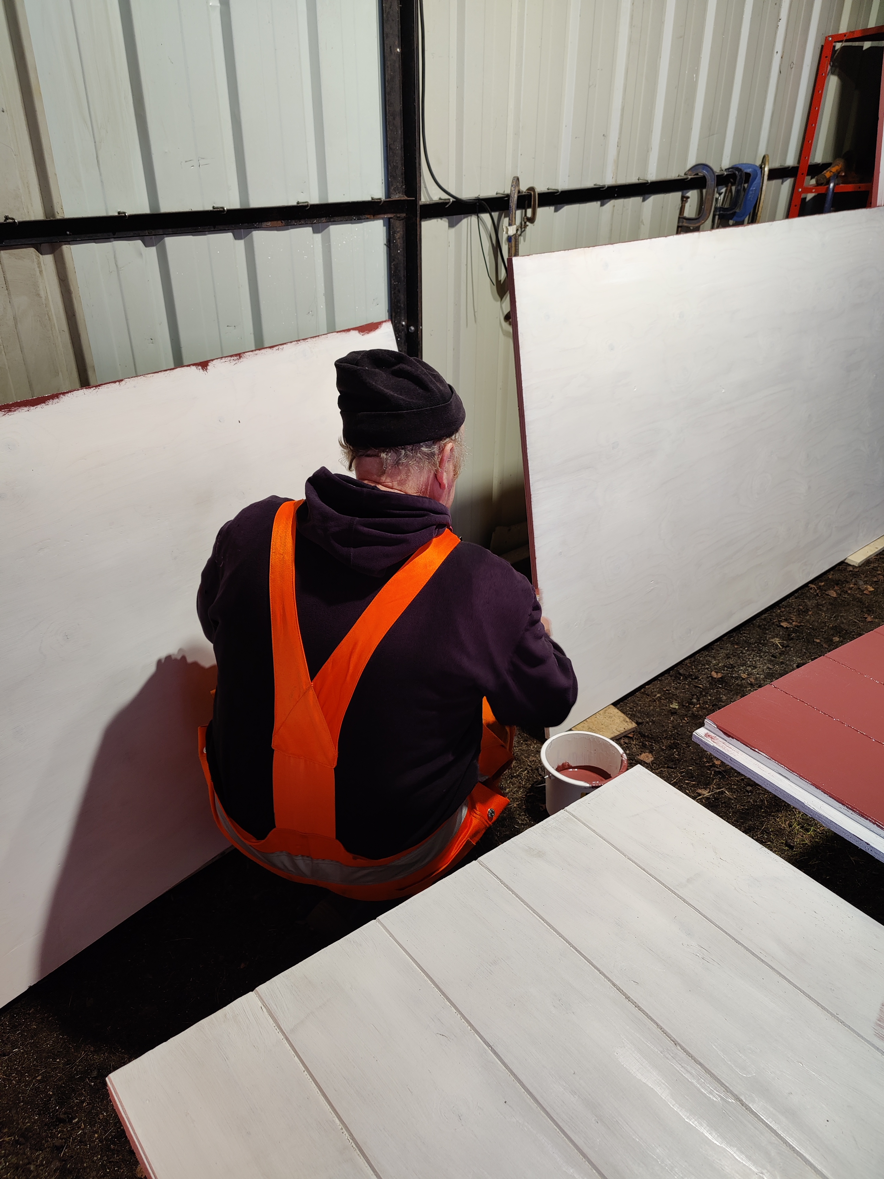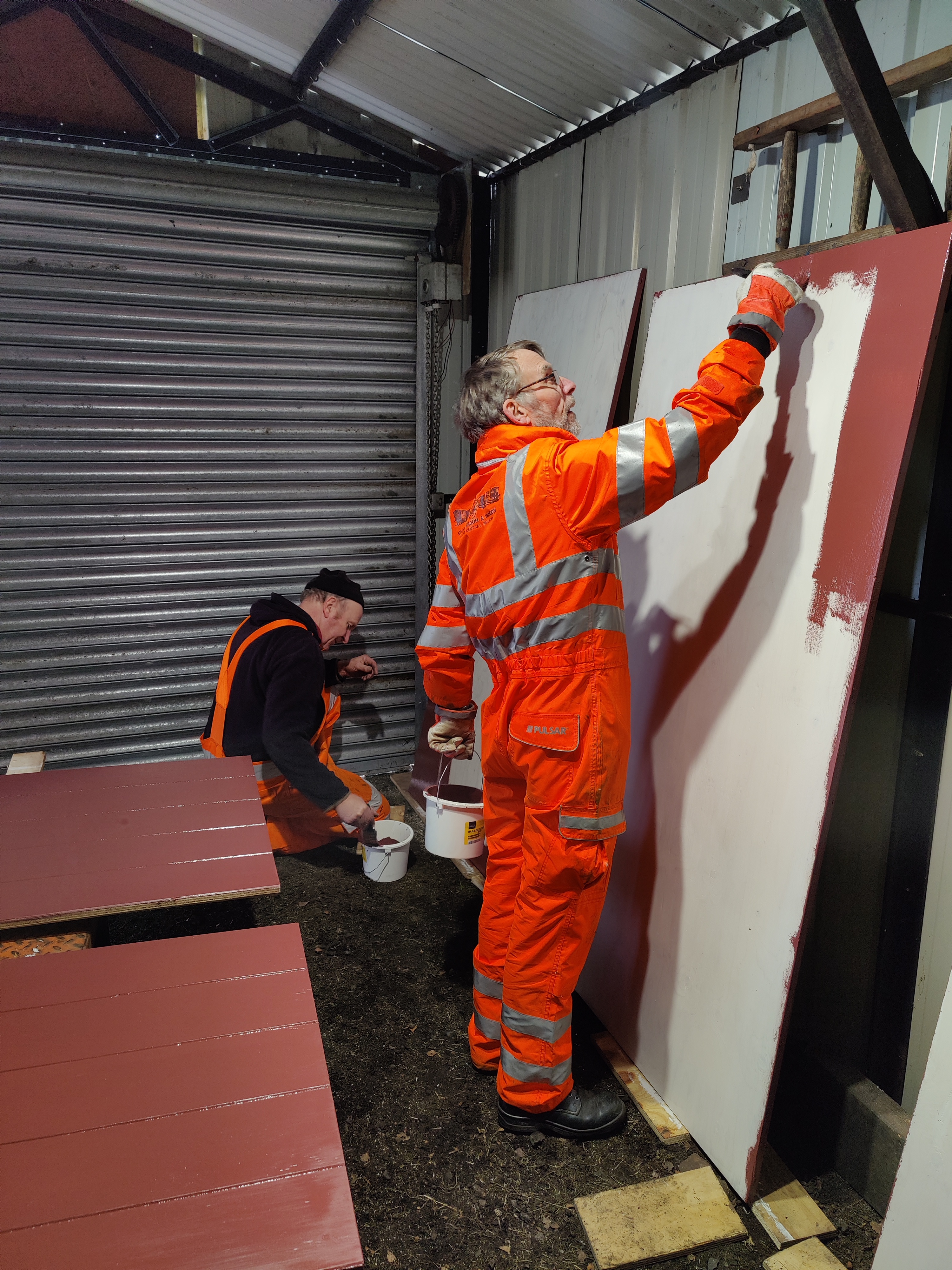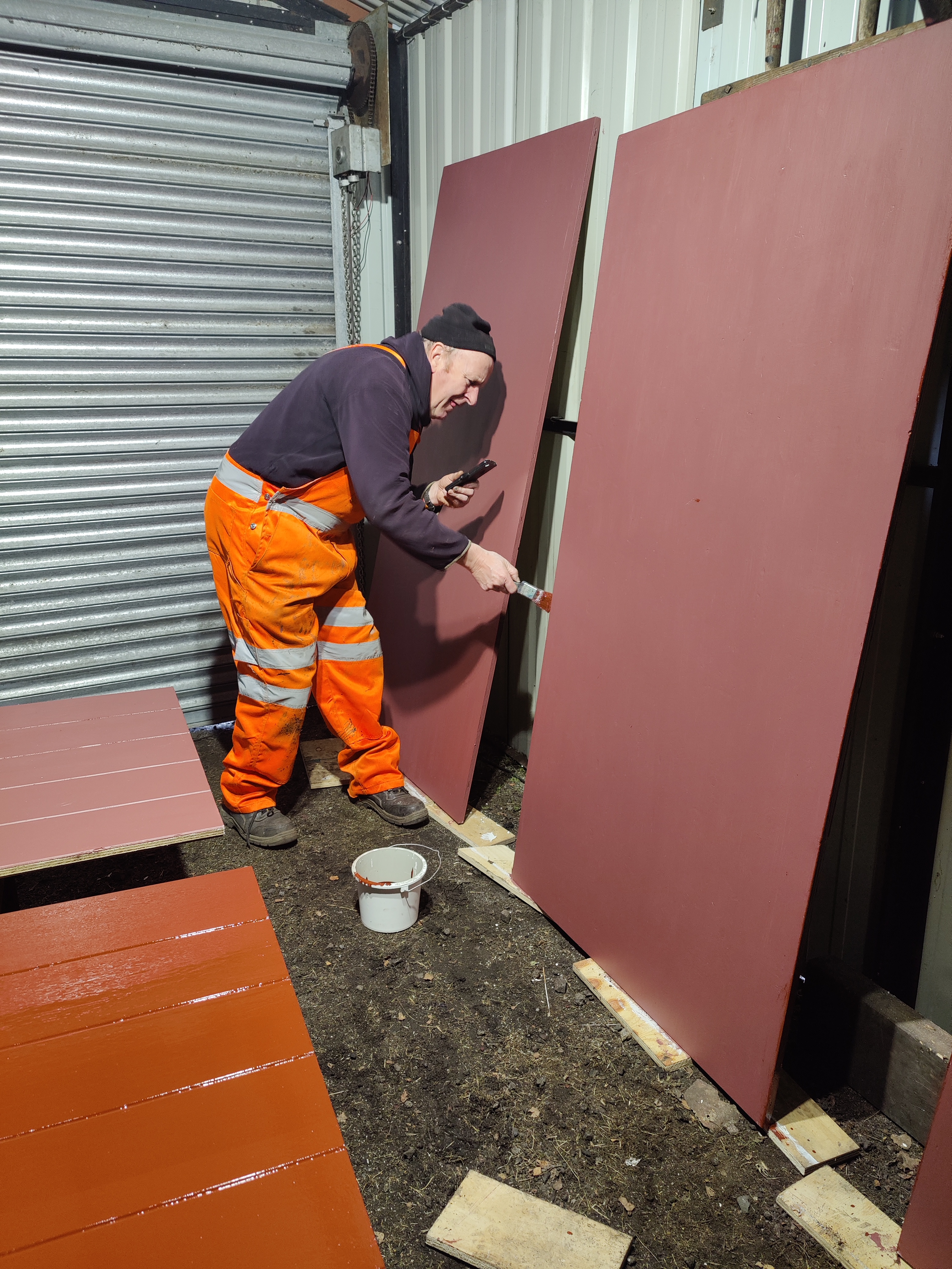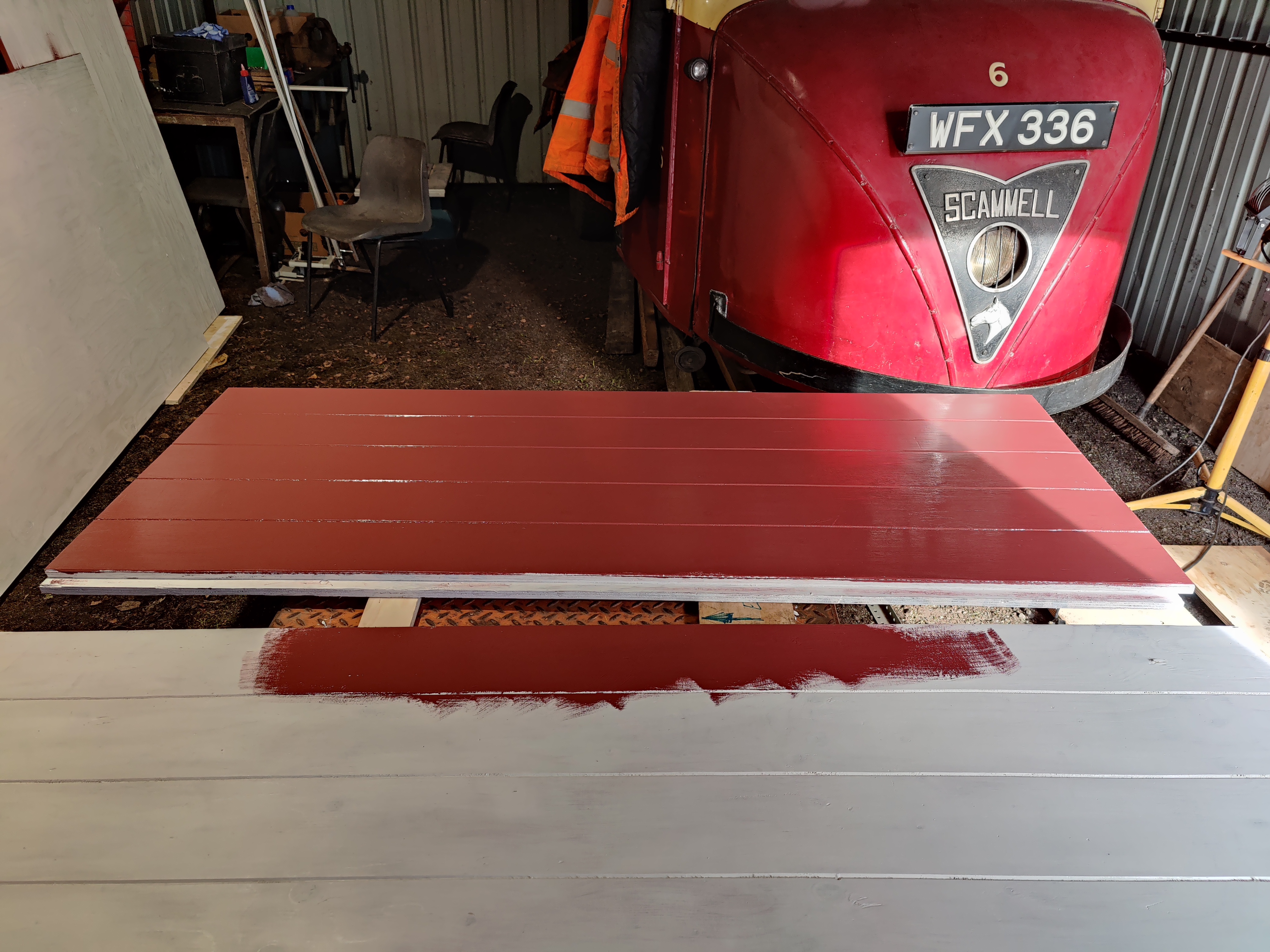 Right on to business, this week we’ve contiued painting the replacement doors and side sheets. Last week we got them all cut and primed, so this week was the turn of undercoat and top coat. On Saturday, Nick and Richard took care of undercoating the edges and I covered the fronts. The shed really helped here, keeping the sheets and us nice and dry while we were applying the paint.