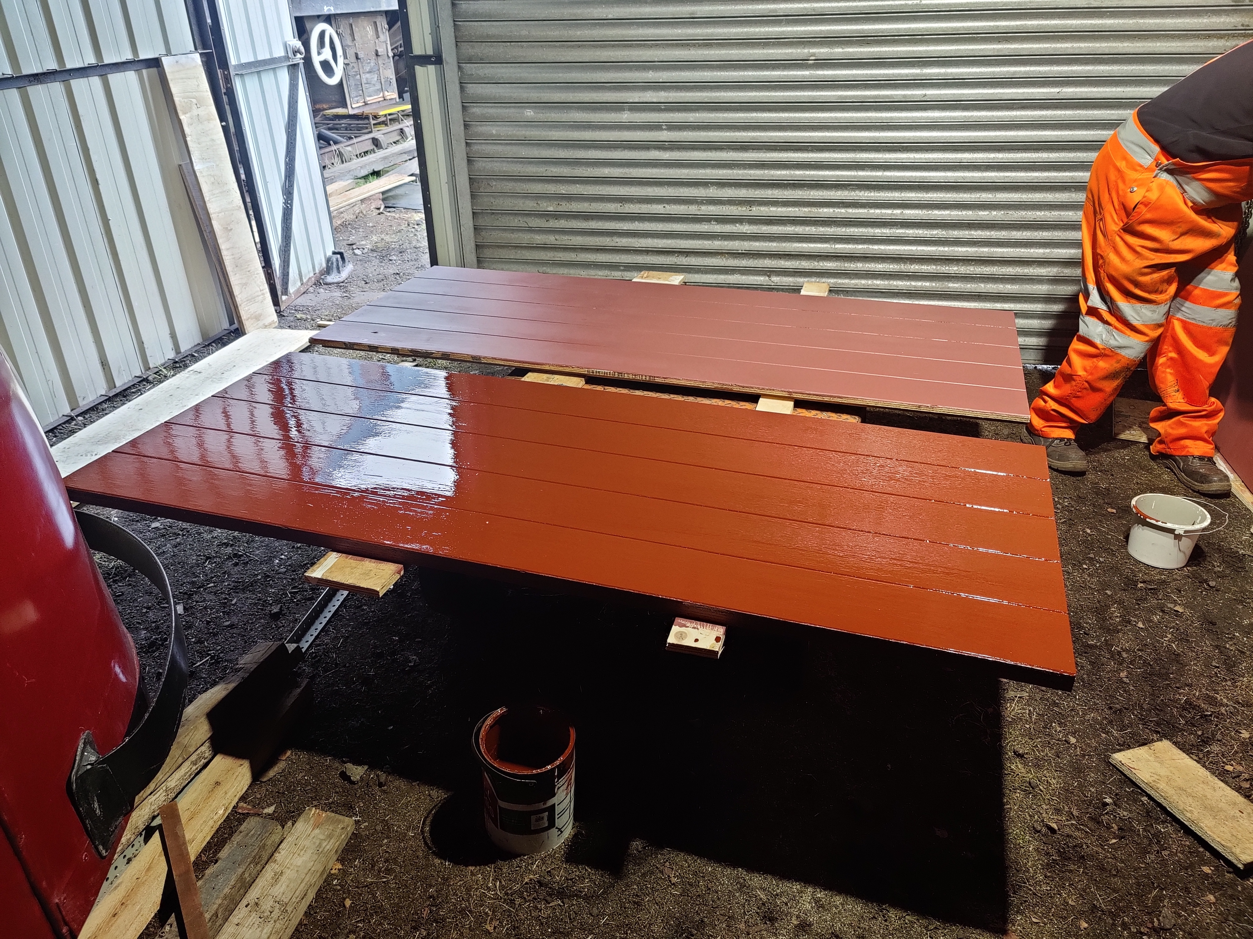 Sunday saw Nick and I apply the bauxite top coat to both doors and side sheets, and then continued the odd jobs. I sorted out the workbench in the Yellow Coach, attaching the magnifying light to the bench kindly donated by Richard. Nick continued the tidy up in the tool van. I fired up the Test Car’s generator and tested the air system tweaks I’d done for leaks. There is one small one to sort out, but nothing major.
