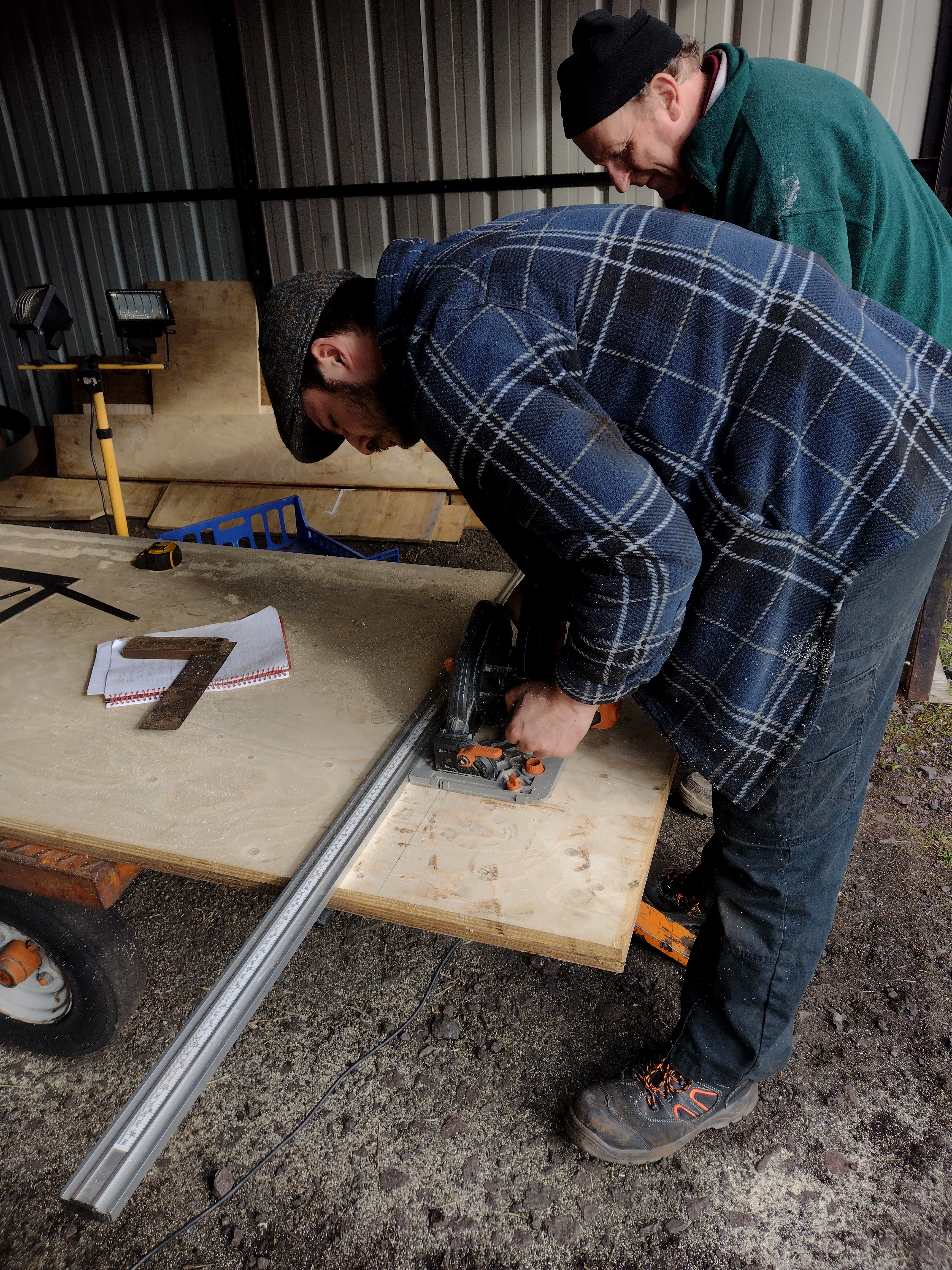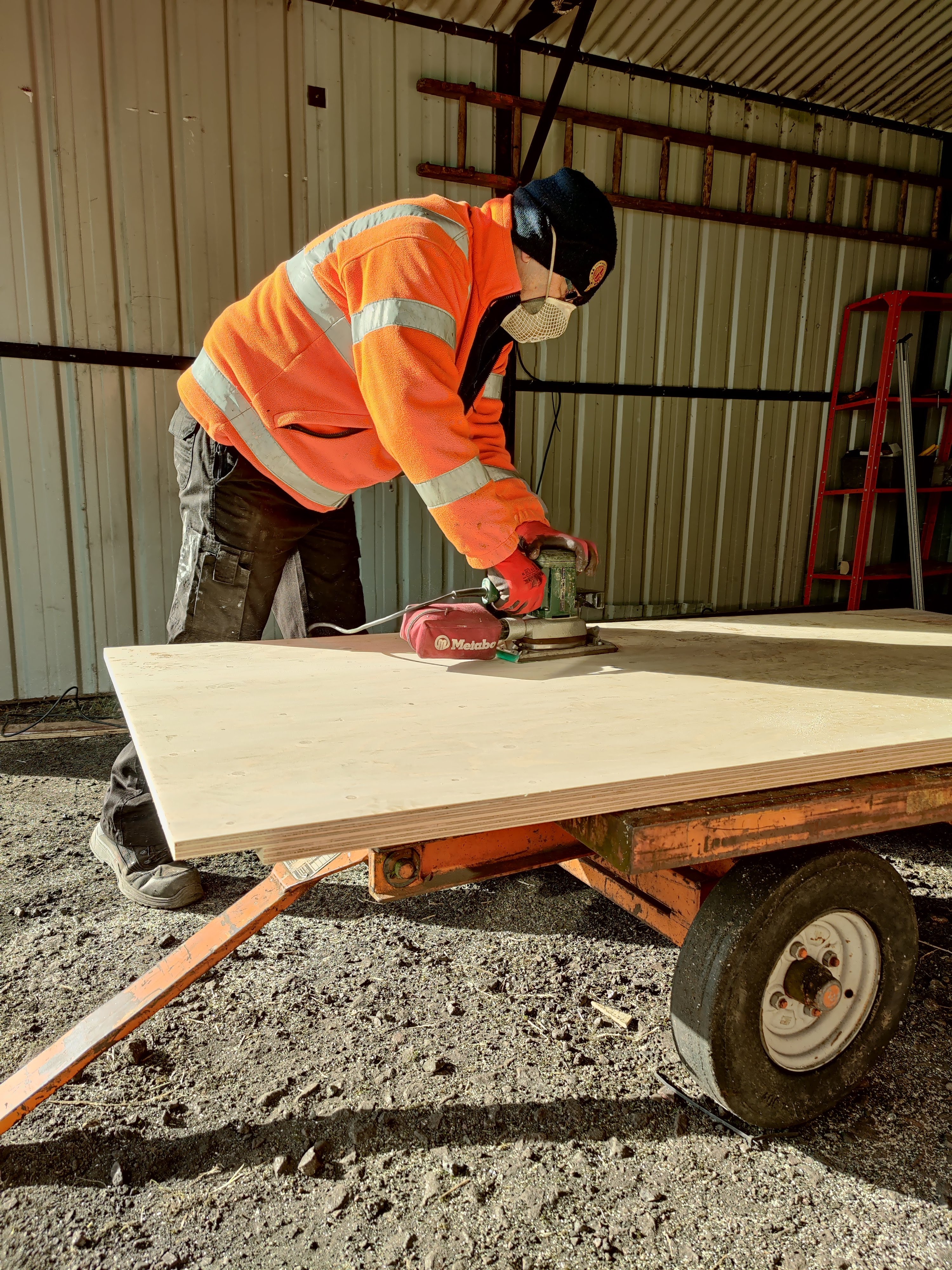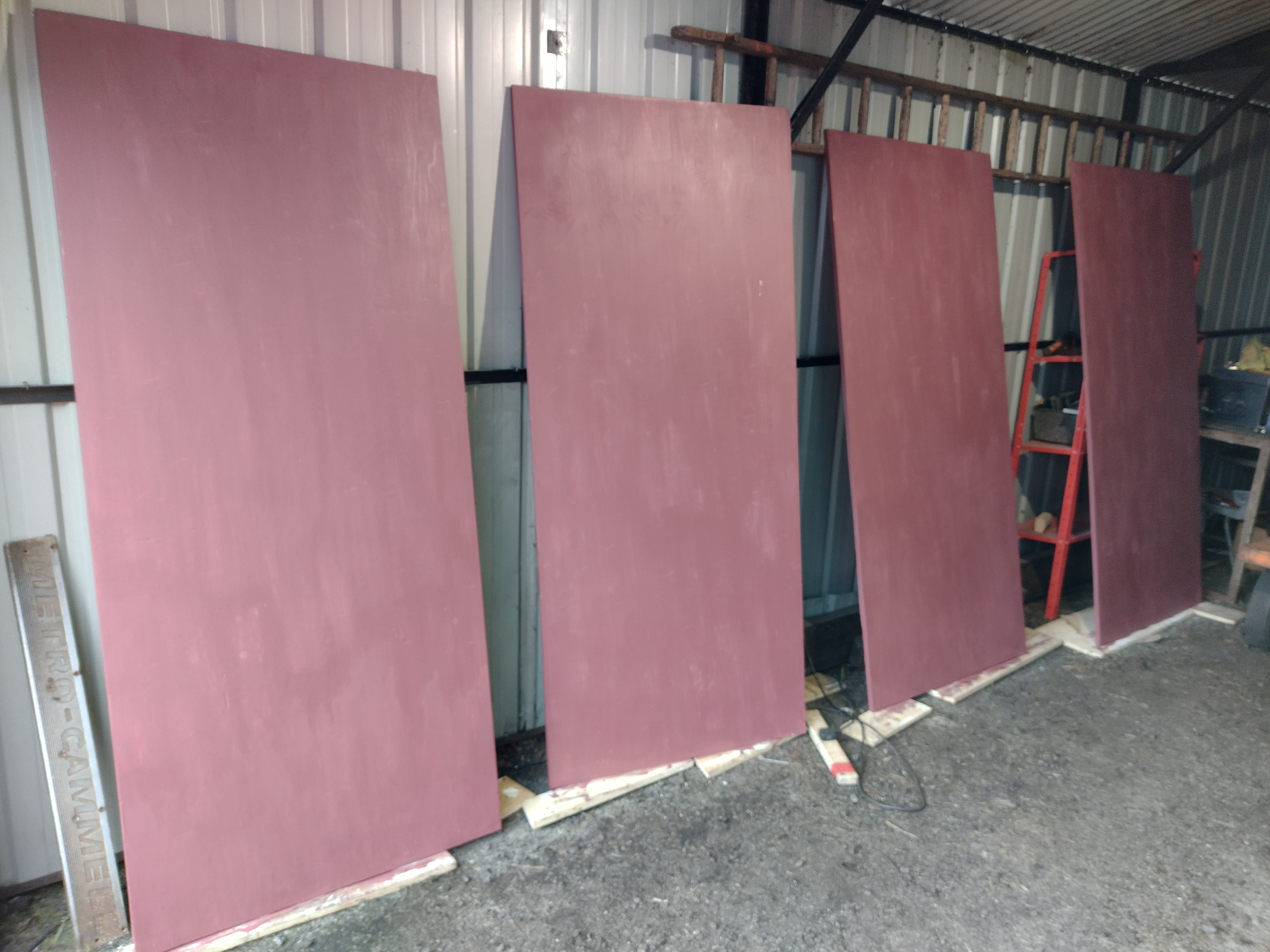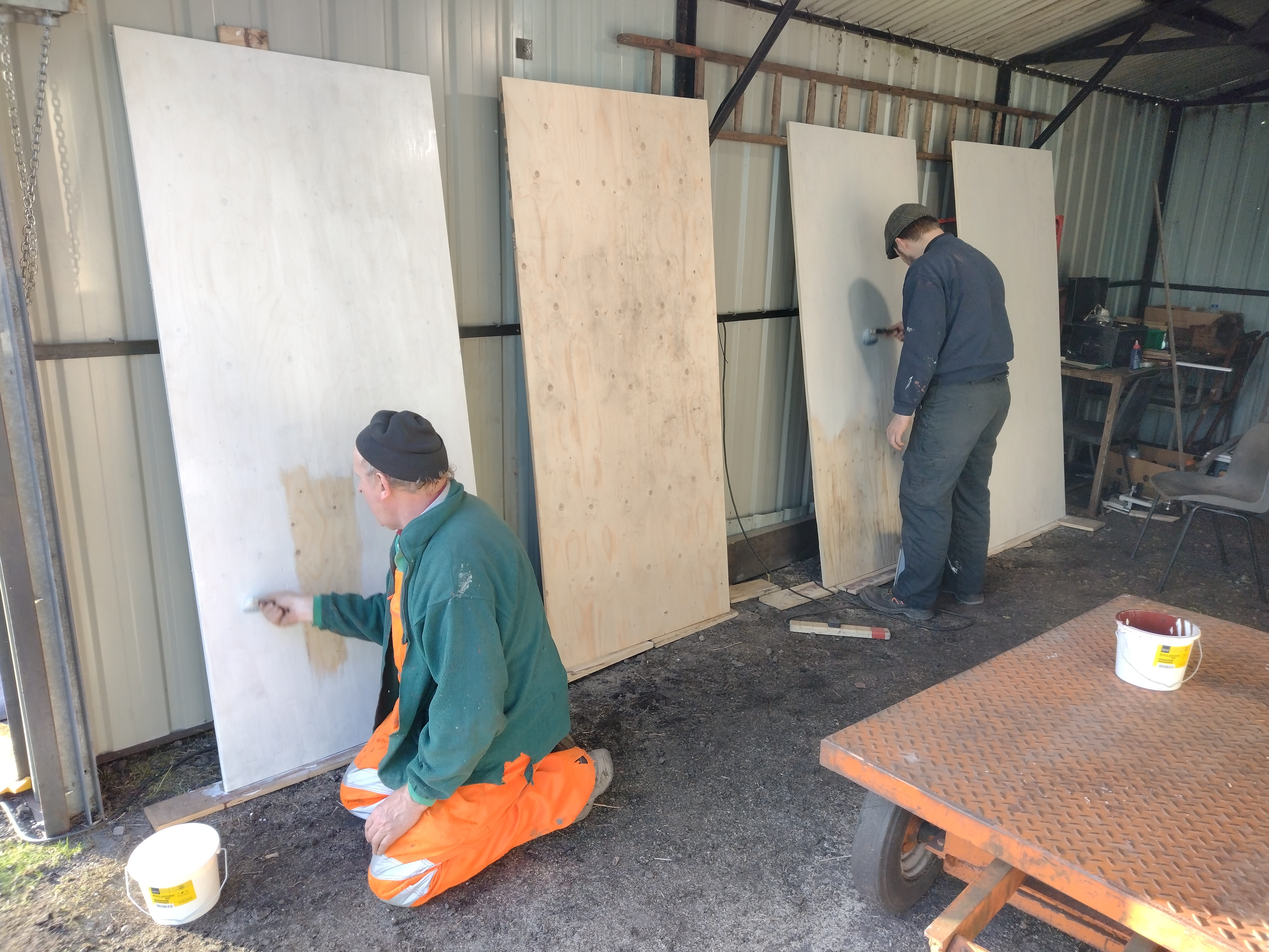 With four sheets of ply retrieved from storage, we set to work cutting them to suit the aperture. Once cut, Dave sanded the sheets then Nick and I treated them to a coat of wood primer, coating the front faces and the edges.