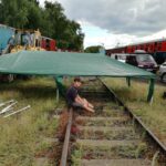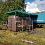 With the old repairs and damage prepared, Matt then went round with expanding foam to fill up the big holes. I’d struck up the Test Car’s Generator and compressor at this point to build air to blow down the dust from the container to continue with the repairs. By the time the air had built up and the container blown down, the sun had got quite hot. Matt had the idea of dragging out the £50 gazebo he’d bought for Madge and using it as a cover/sun shade to use while working on the container. With suitable leg extensions fitted, the gazebo was erected over the container.