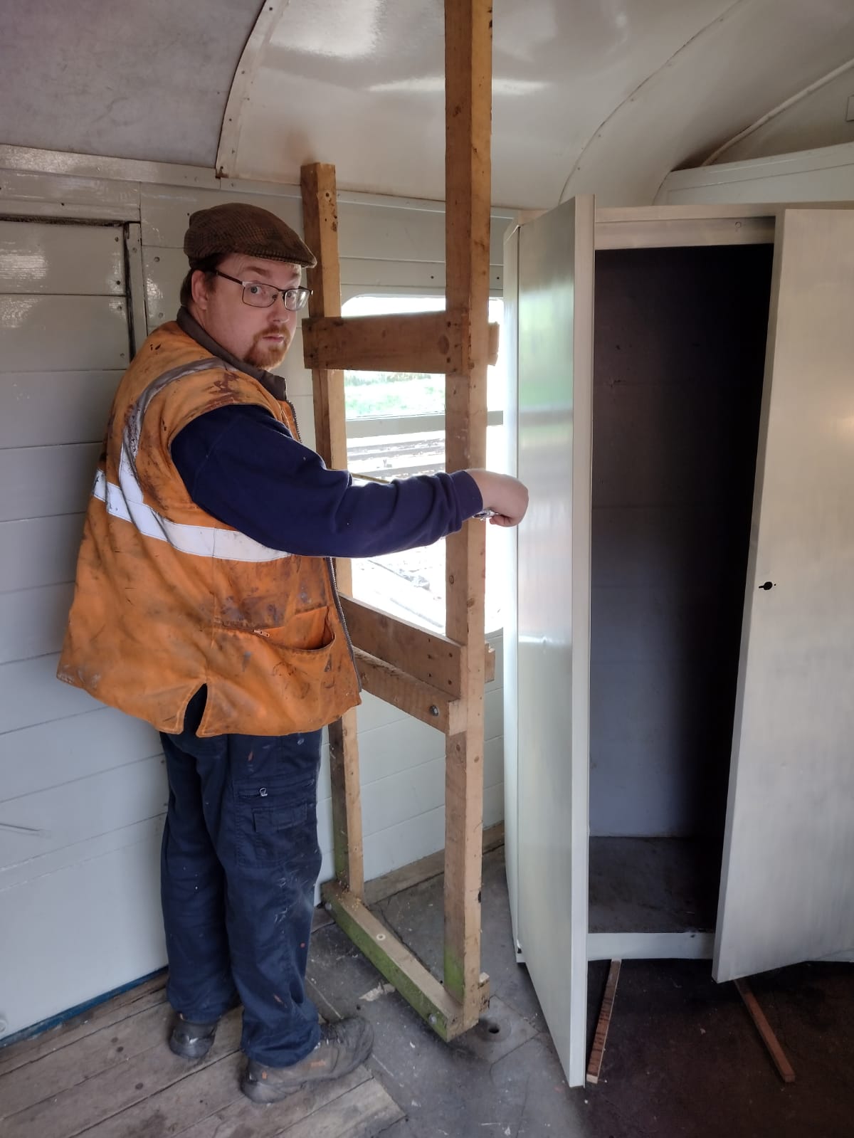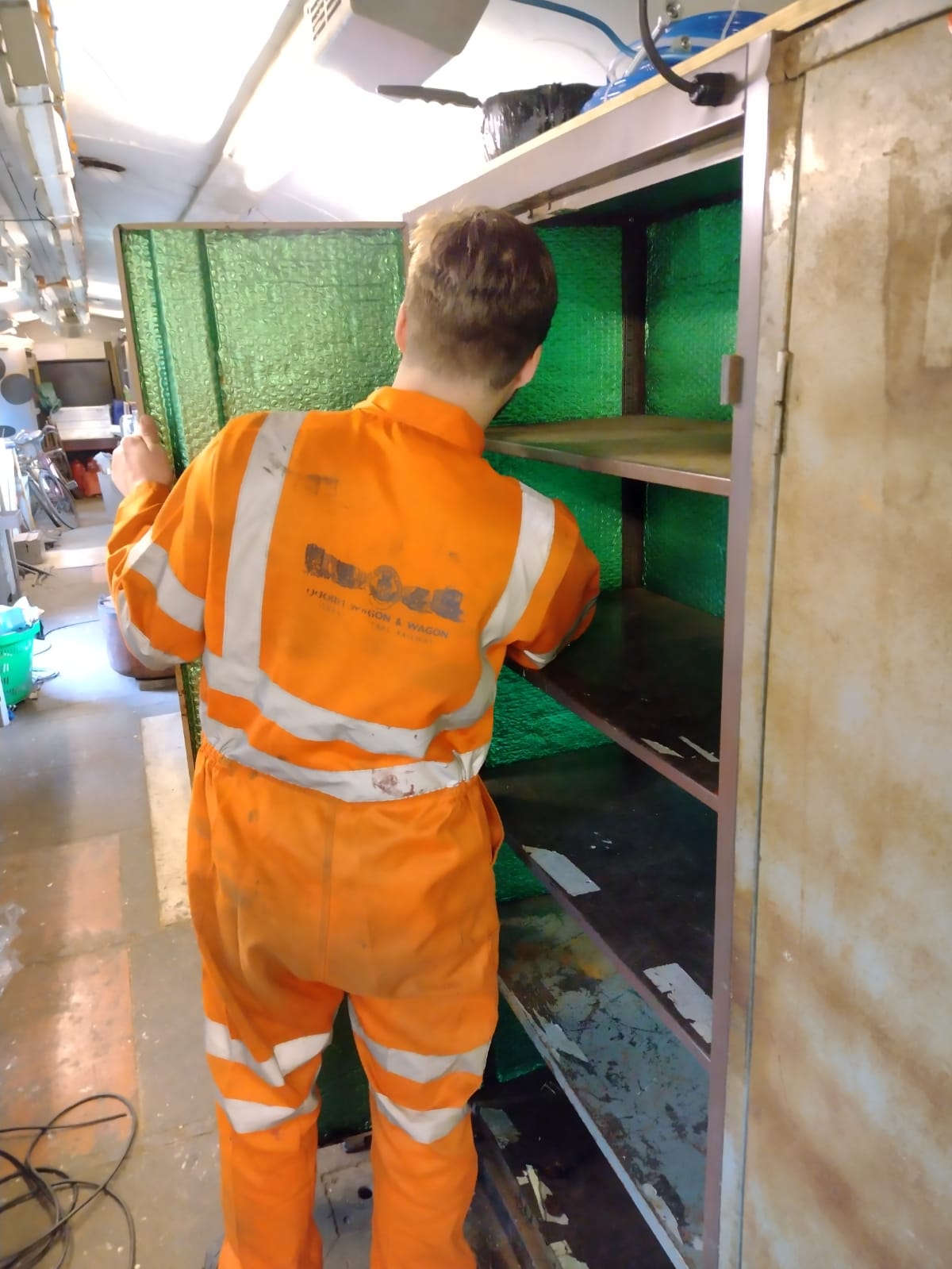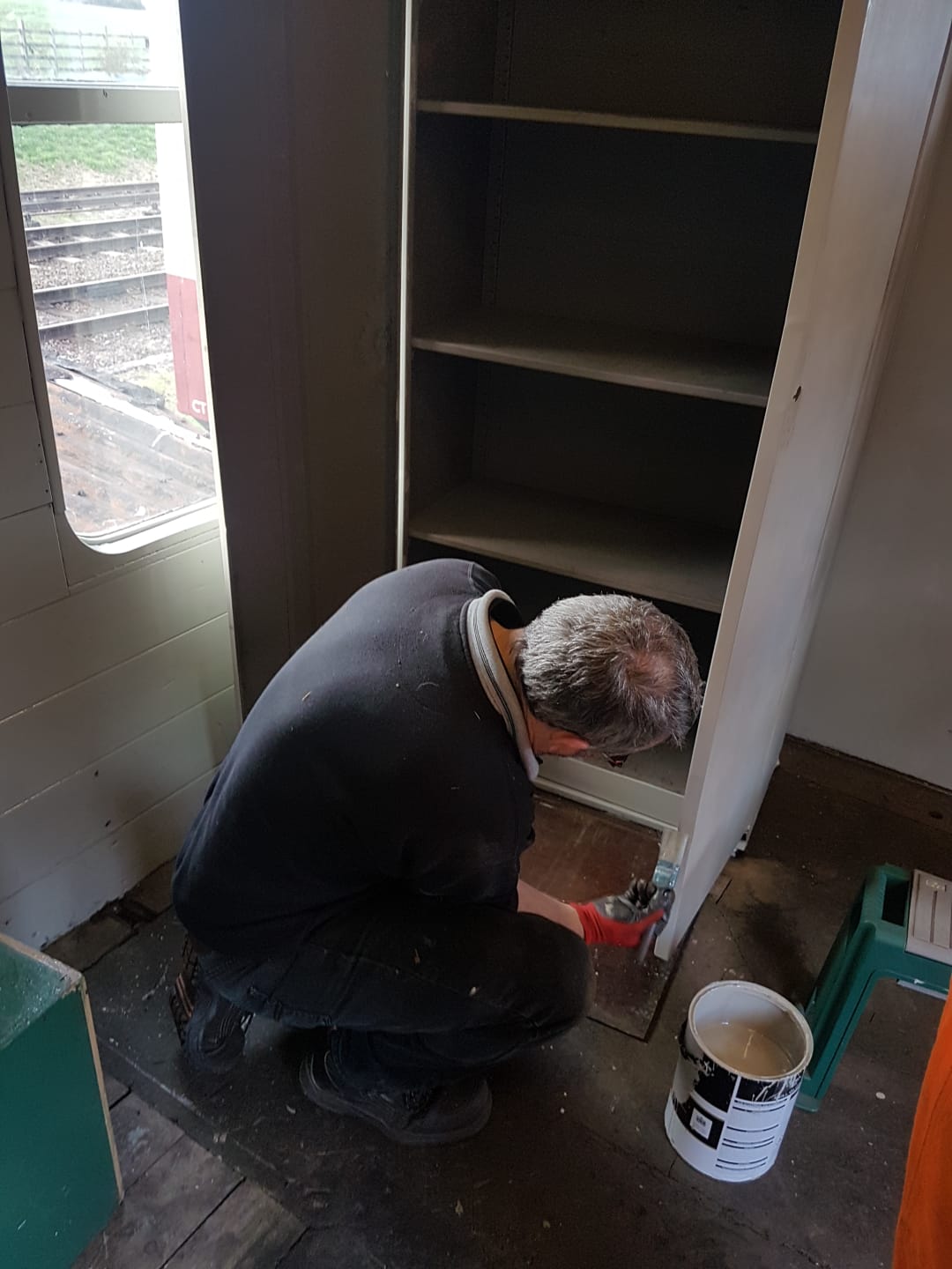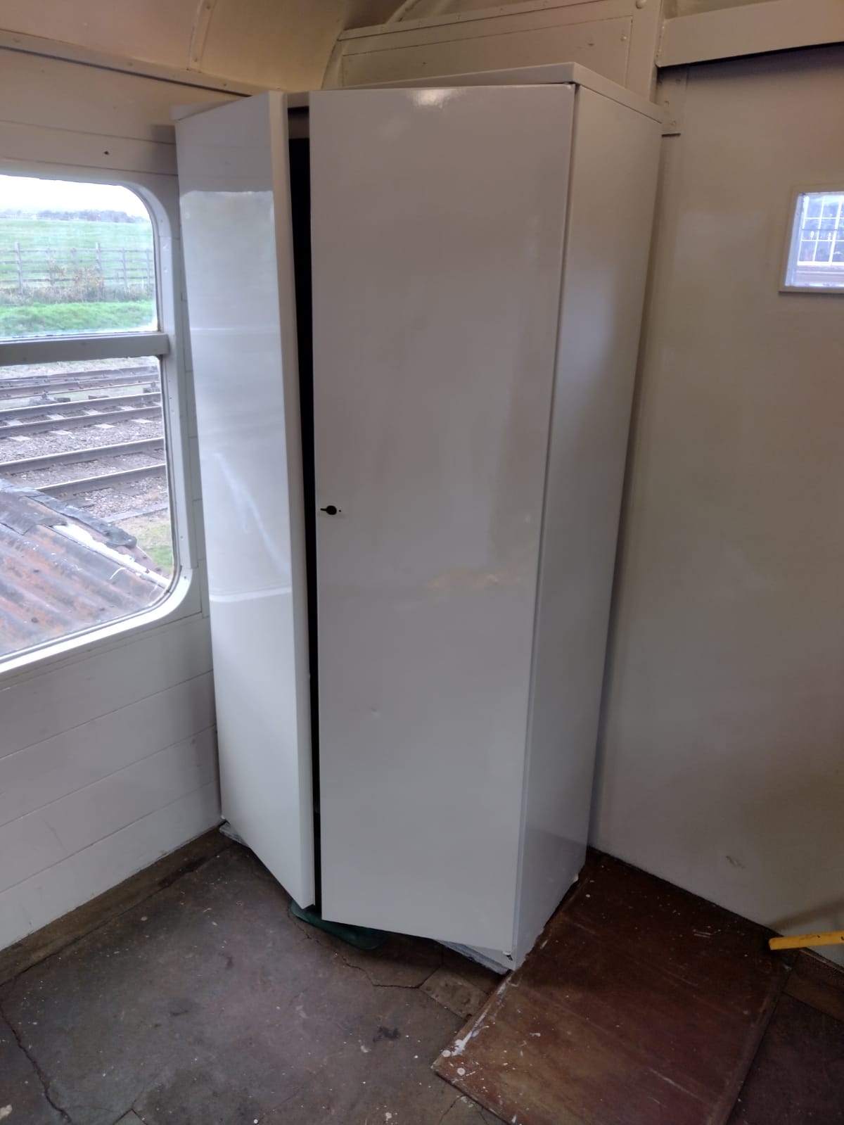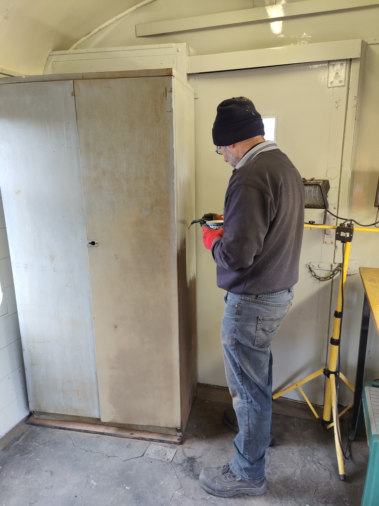 On Sunday, Dave and I moved our last steel cupboard into the luggage area of the mess van. Dave then sanded and painted this into an undercoat then BR Light grey gloss to match the walls in the luggage area. I sorted out a few extension cables and power tools that had cable issues.