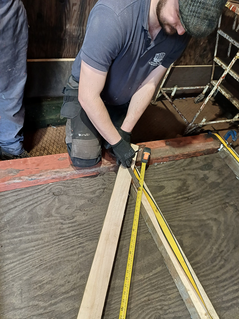 Nick, Charlie and Michael de-nailed some of the remaining planks from the loco shed roof to use as the bottom of the doors. These are the right deopth and thickness to use for a re-designed door bottom. We are having to do this as we have no pattern for the bottom of the door.