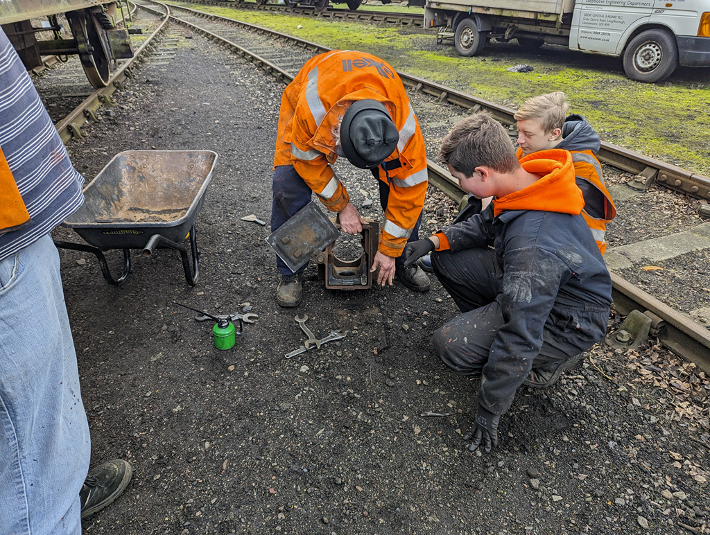 Nick, Mark and the lads began by making a kit of parts for one of the Catfish, which has a cracked spring pocket on the top of the axle box. The lads had a small lesson from Nick on how the axle box is assembled, much easier without the axle there!