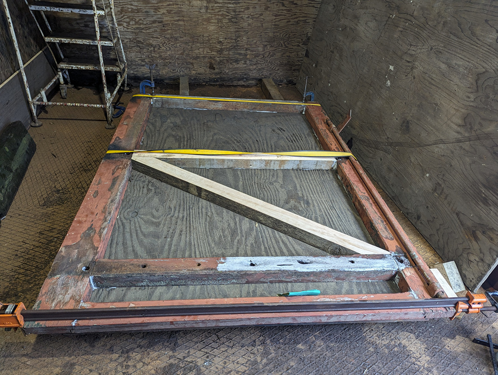 Barry and I managed to finish the day with the new horizontal members cut for the door, and dry fitted into the uprights. Dave and I started by measuirng and cutting the ply sheet for the back of the door. The frame was then glued together and the ply laid in and screwed down. The door was clamped together and then rolled over so the diagonal bracing could be cut and fitted.