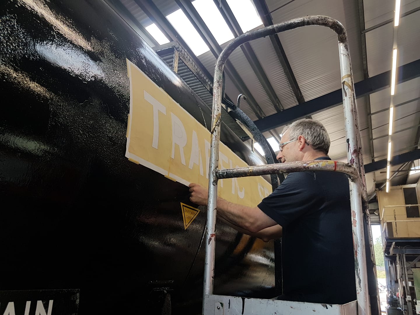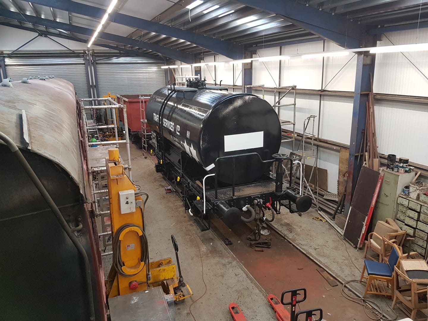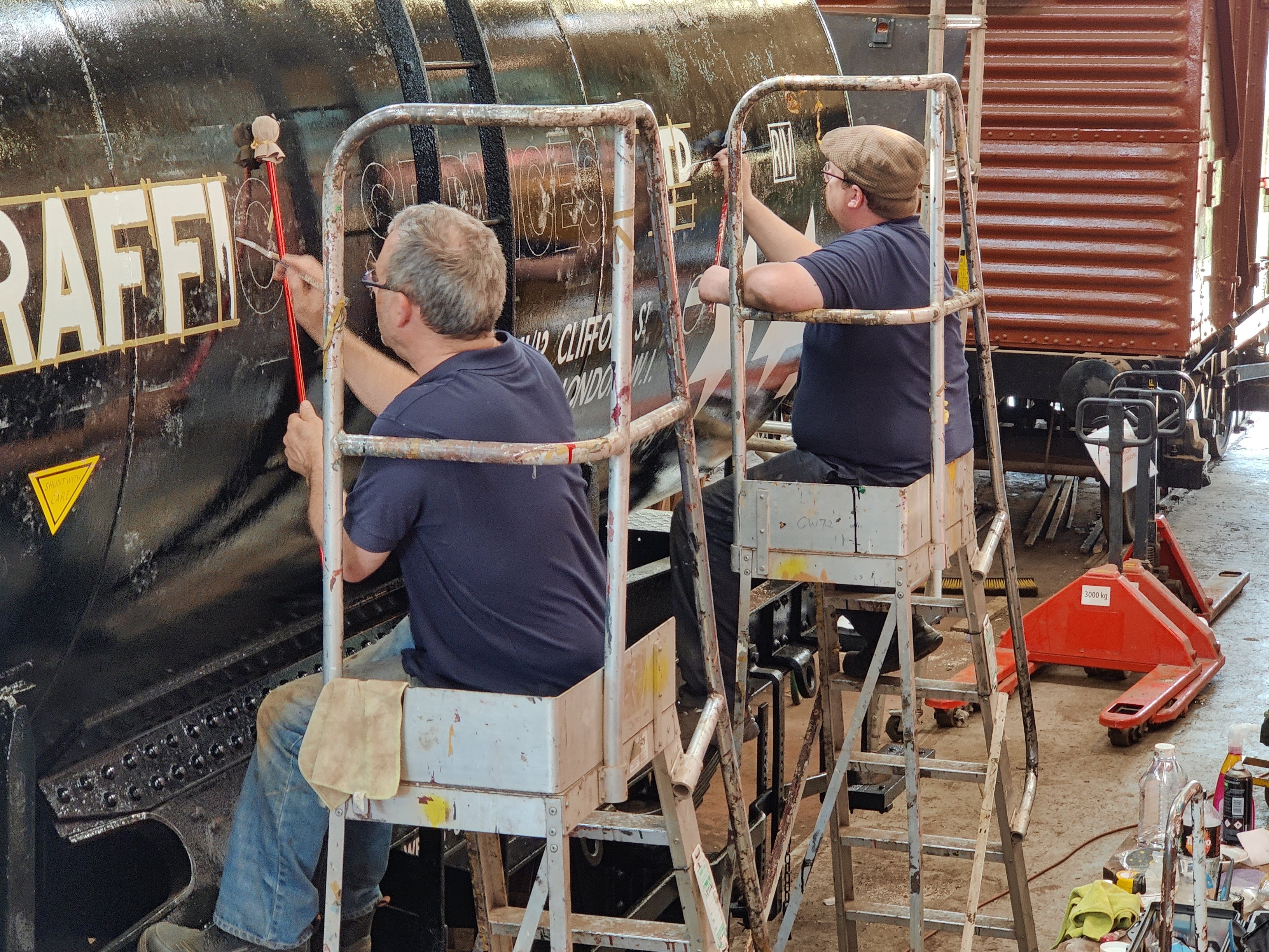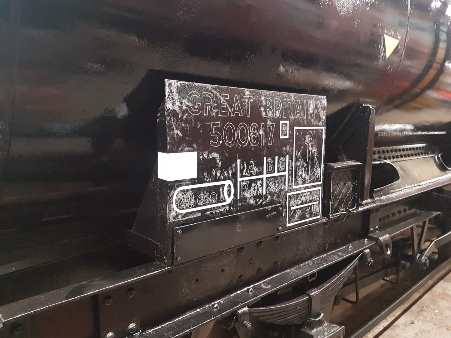 Richard and Jake painted some of the underframe of the tank, in behind the anchor plates that hold the barrel down. Richard then worked on some replacement wagon label clip backers for the tank.