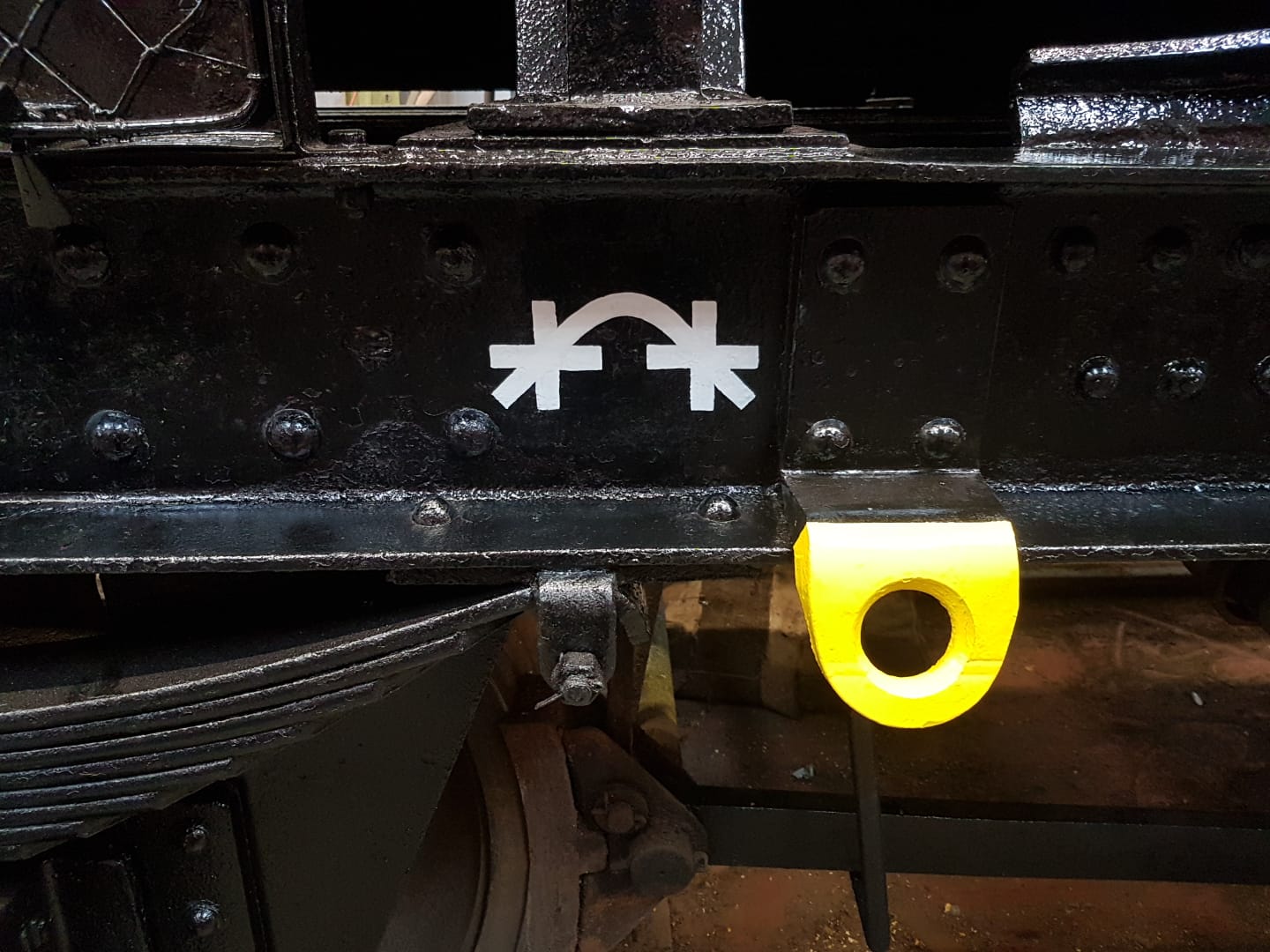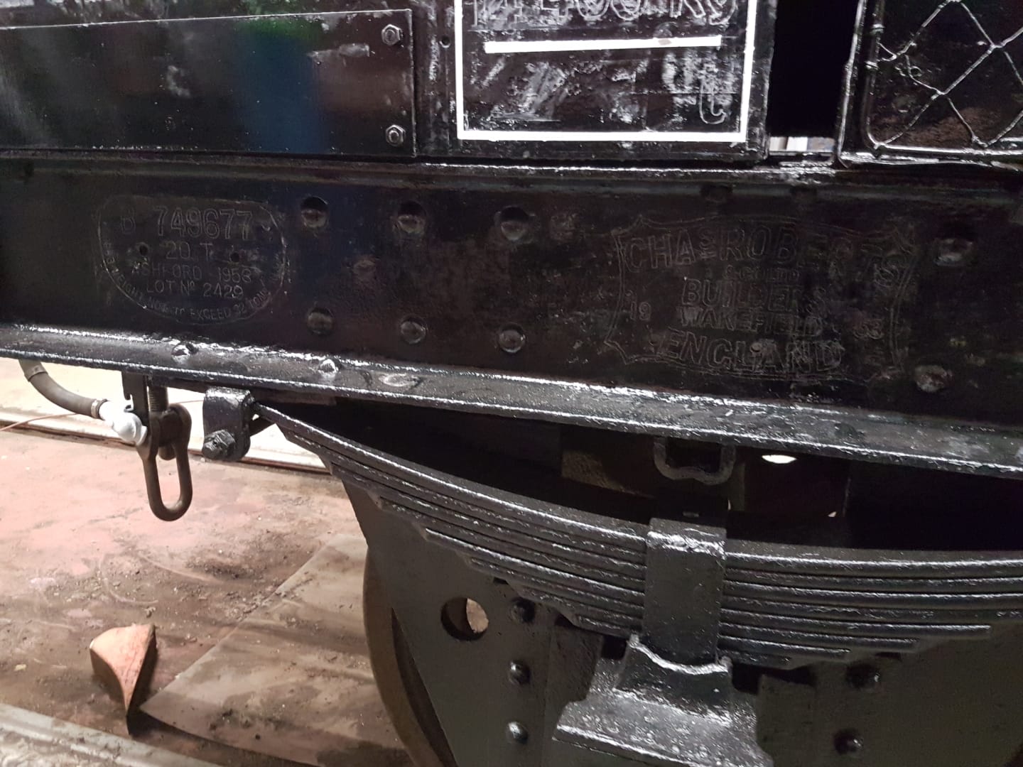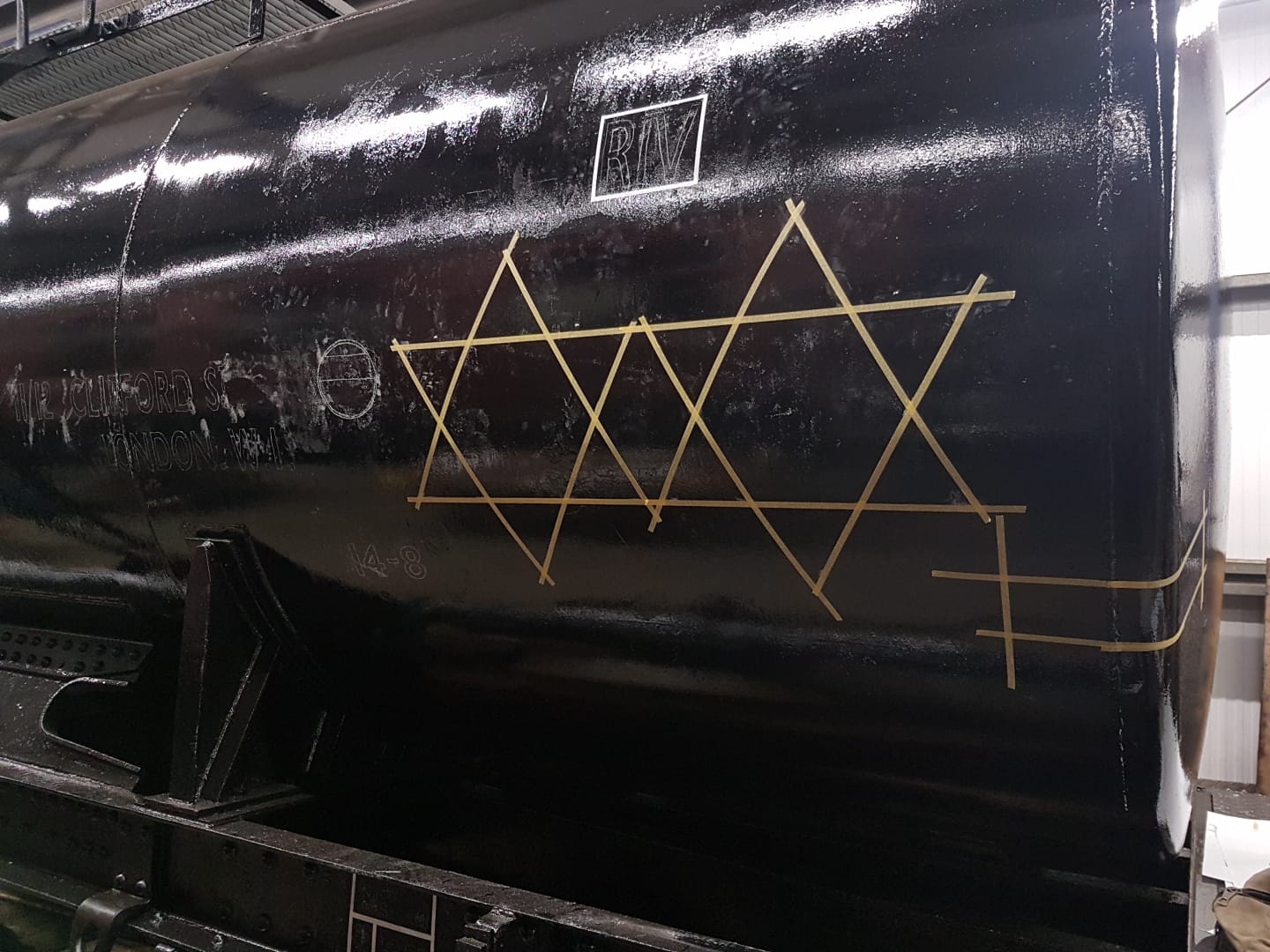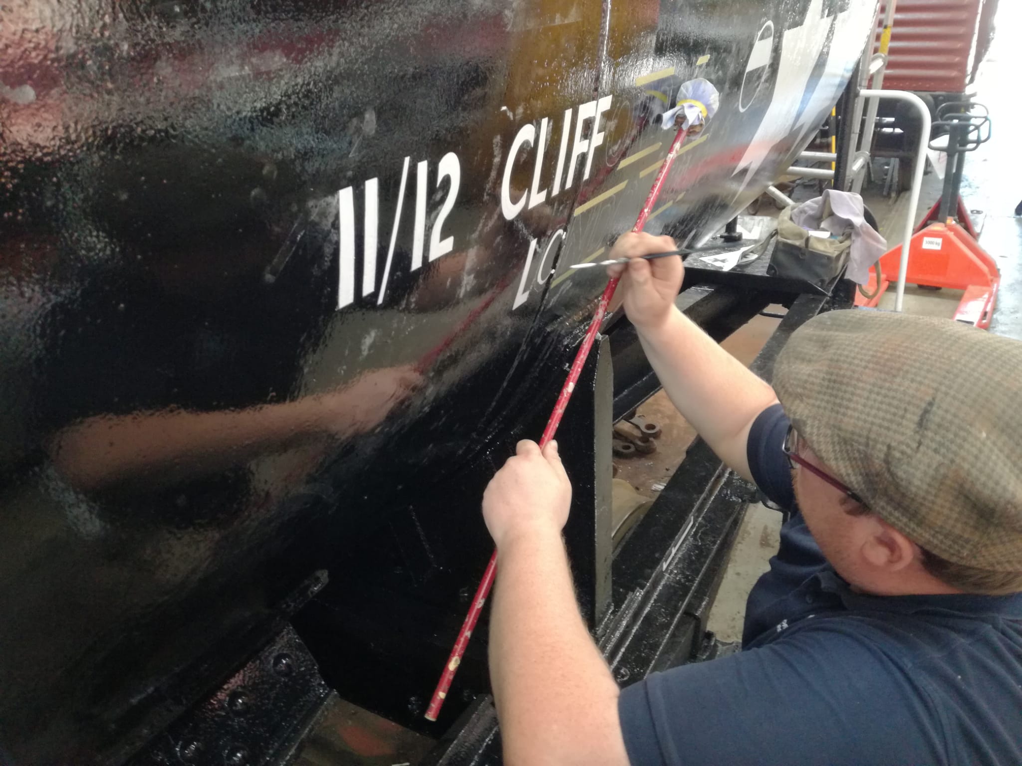 Richard and Jake painted some of the underframe of the tank, in behind the anchor plates that hold the barrel down. Richard then worked on some replacement wagon label clip backers for the tank.