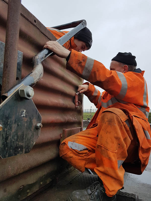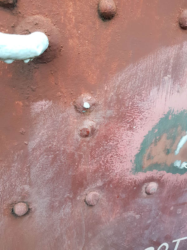 Once these were fitted Nick and Jake turned to the ends.  Due to two large holes being drilled in each end this has allowed years of rust to accumulate.  This was removed and plates manufactured to fill the voids.  Again due to our welding inability theses plates were bolted in position and once better weather arrives will be filled.  Until then they have been redoxided along with the hoops fitted.