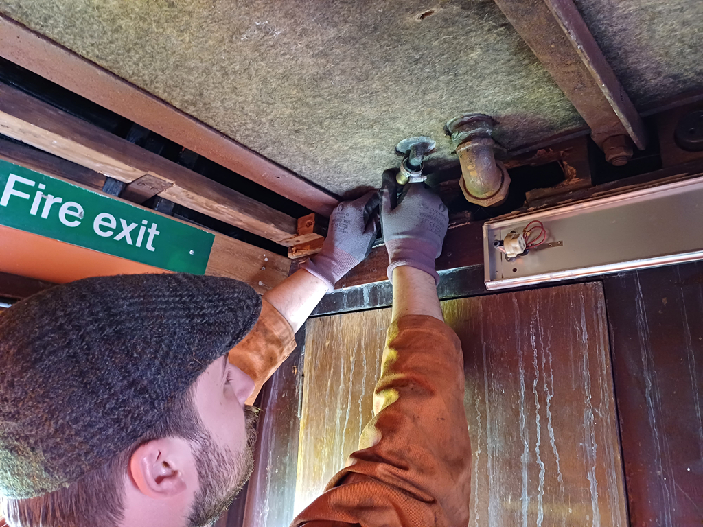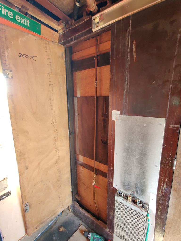 I then got stuck into a fact finding mission in the mess coach, ADB977107. For as long as we’ve been based at Quorn, we’ve used water carriers for our water. We’re now looking at re-commisioning part of the water system to be able to have a hand wash basin and the kitchen tap to be able to be used for cold water only. I started by removing some ceiling panels down the corridor and outside the toilets to have a look at what was already there.