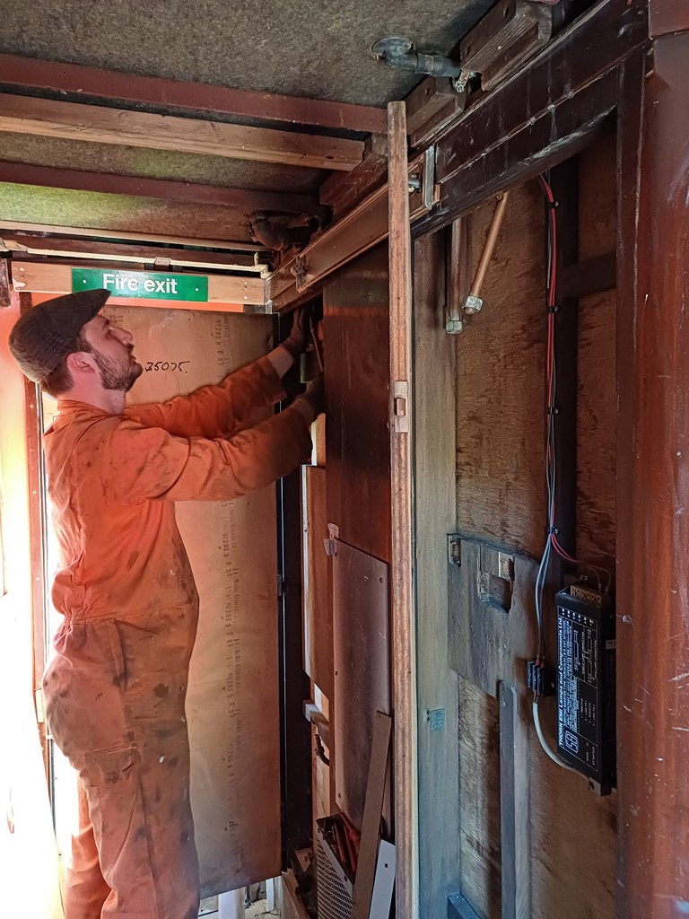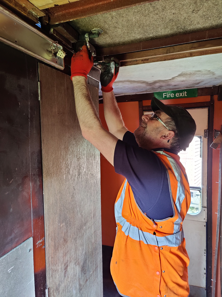 Nick and Charlie went off to Rothley with the black paint to paint the replacement axleboxes and part of the Coal Hopper. Dave came to assist me in the coach, we found a long length of rubber hose used as a balance pipe between the first class water tank and the tank at the other end of the coach. This is a feature not normally found on Mk1s, and is a part of its converison to a mess coach. This got cut at a convenient point and bunged as it was found that the north end tank is unserviceable. While above the ceiling I also tidied a few loose lighting cables.