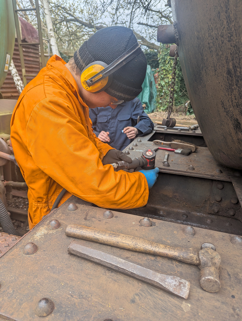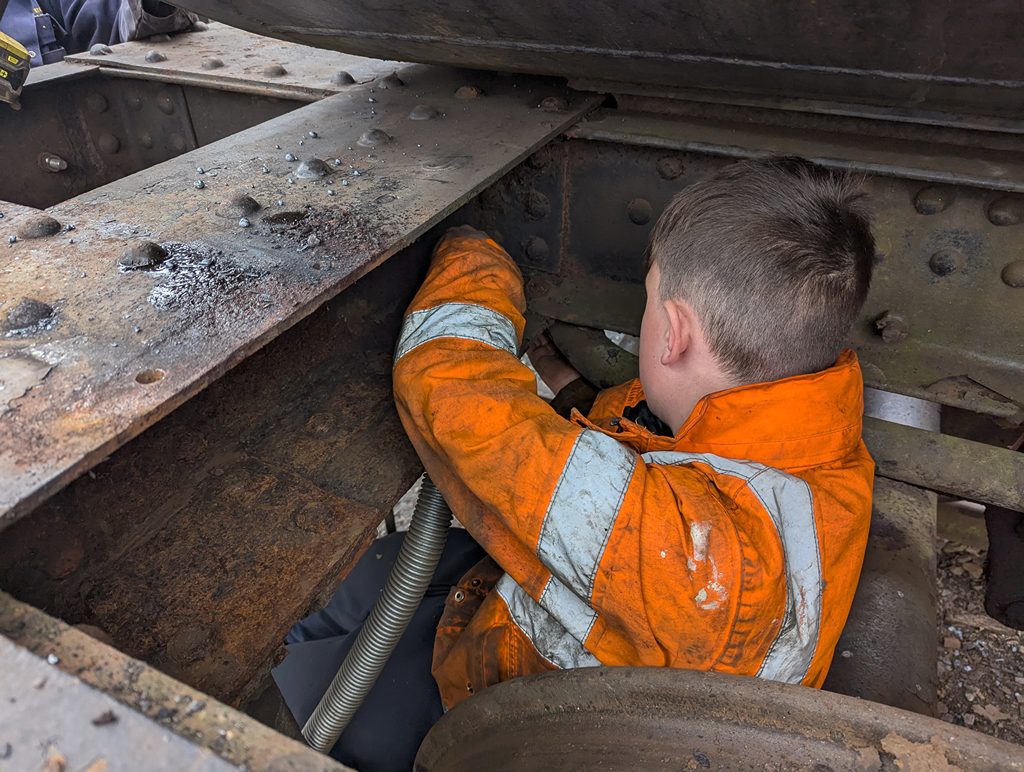 Ernie removed the last two splash guard plates from 3621, which opened up the area around the wheels for cleaning down and hoovering. Nick set about straightening these with his most favourite tool to get them flat after the rust build up had bowed them at each end. Two of them require a weld repair due to corrosion.