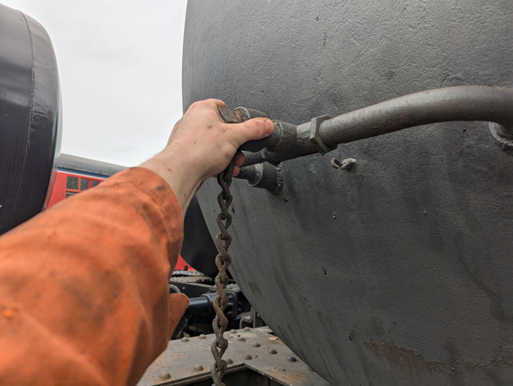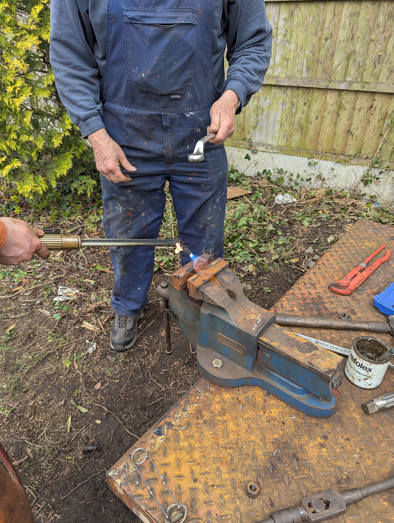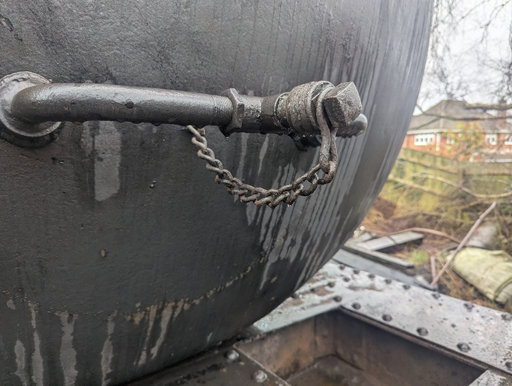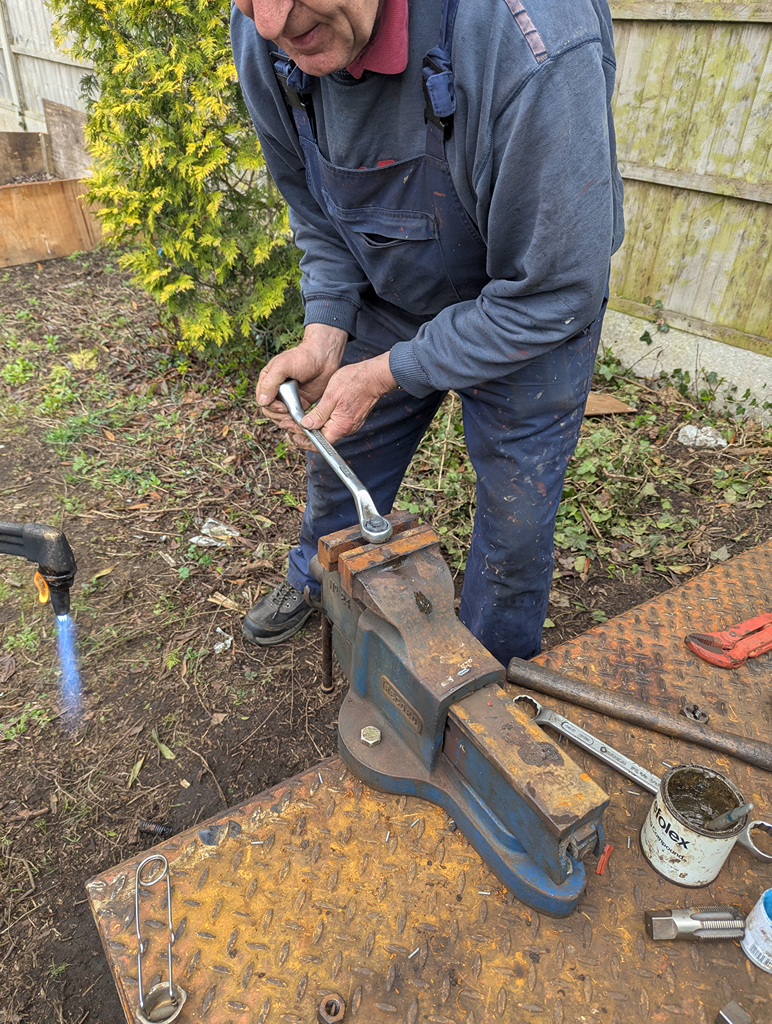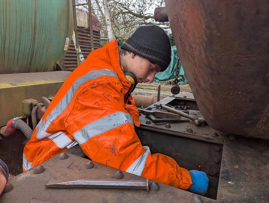 Harry, Charlie and new starter Dan continued the laborious job of cleaning and de-scaling the end pockets and the chassis of the Esso tank. While they did this, Ernie and I removed the heating coil end plug from the wagon to clean out the threads and refit it.