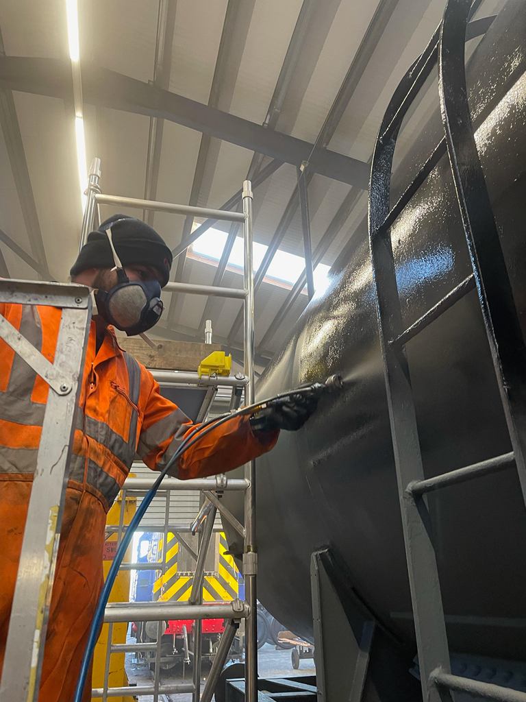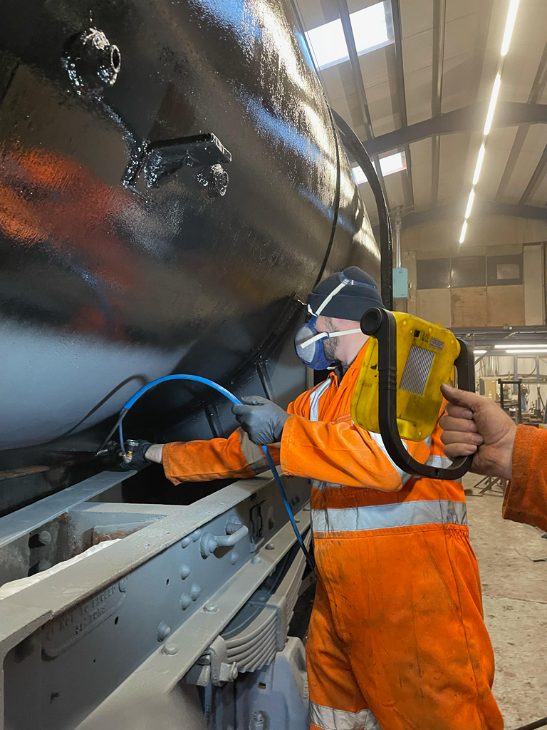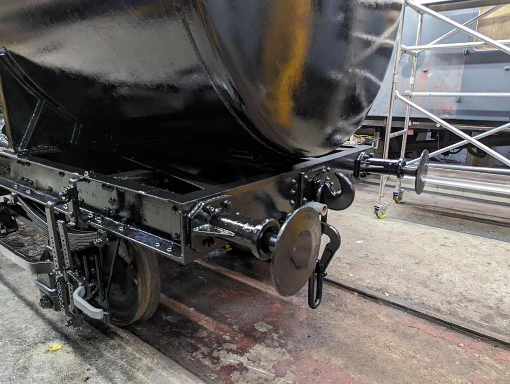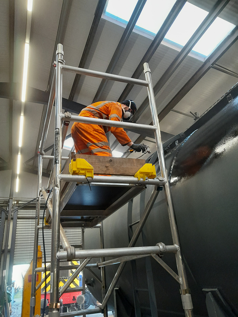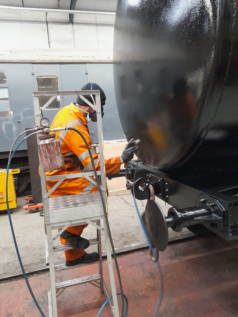 On Sunday, Nick and I continued starting by finishing the east side underframe, and then a second coat all over the tank.