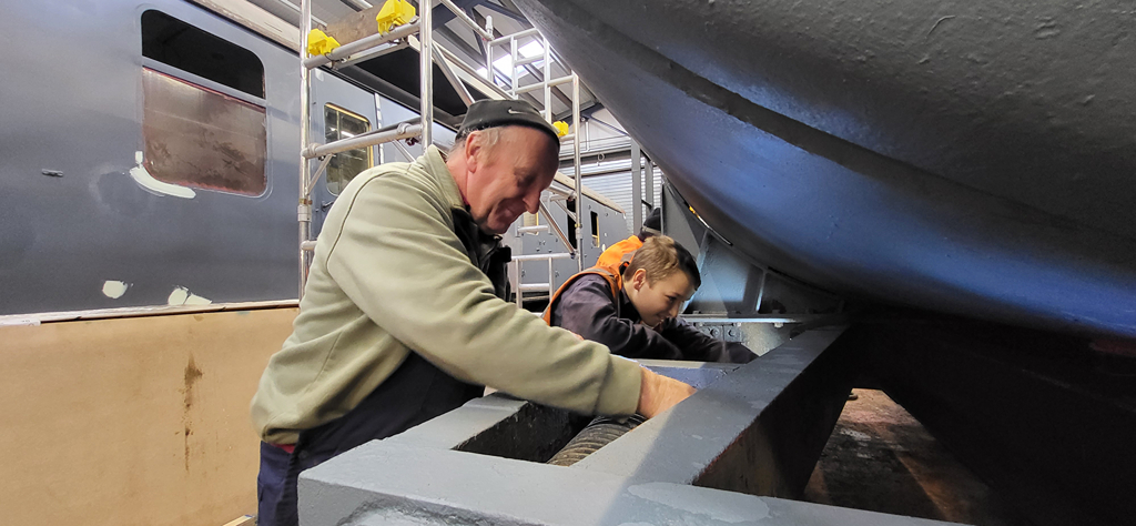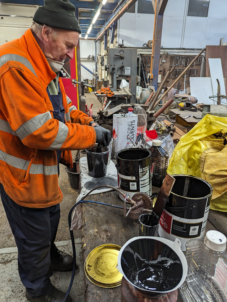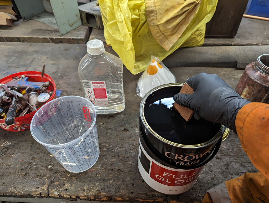 A little bit of cleaning down was done on the underframe by the four of us until after tea when the black gloss came out for the first coat.