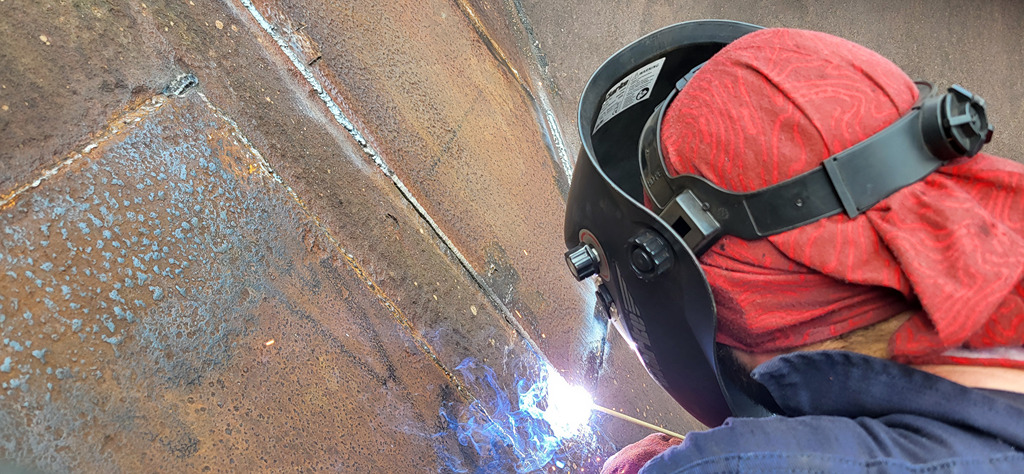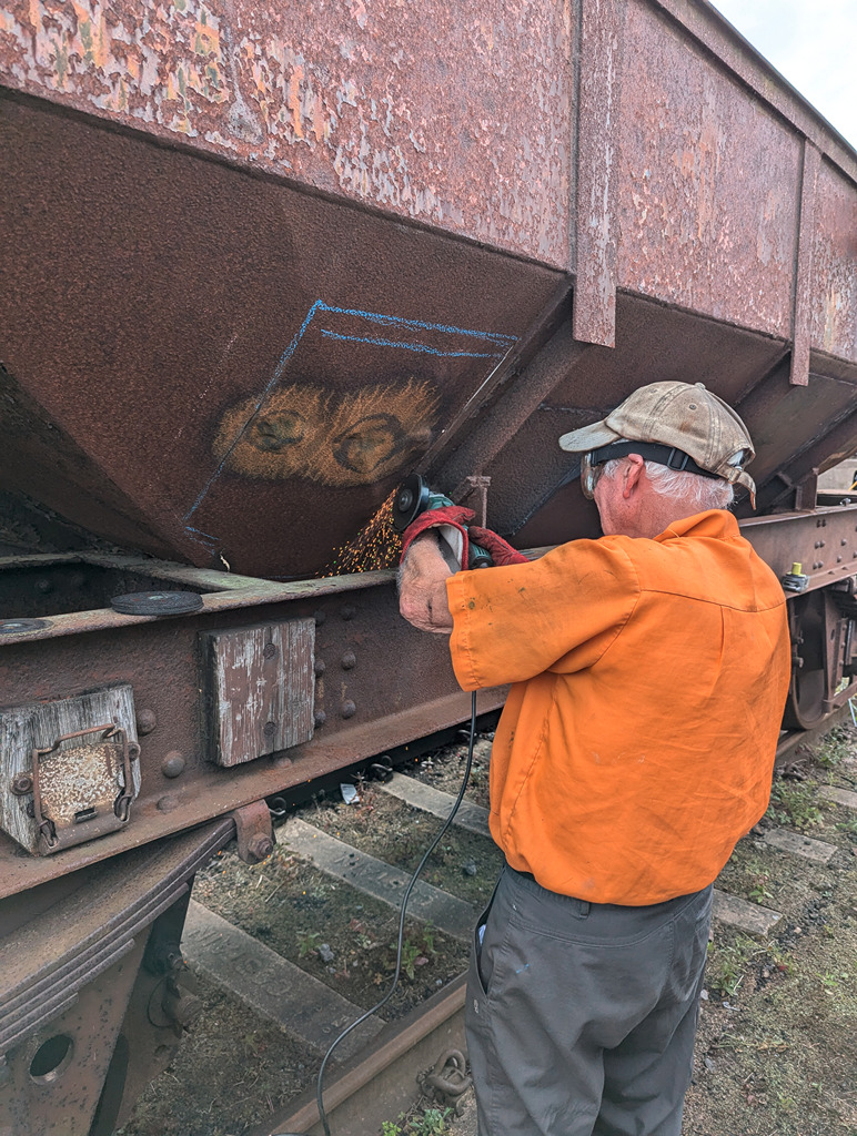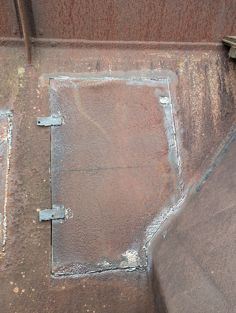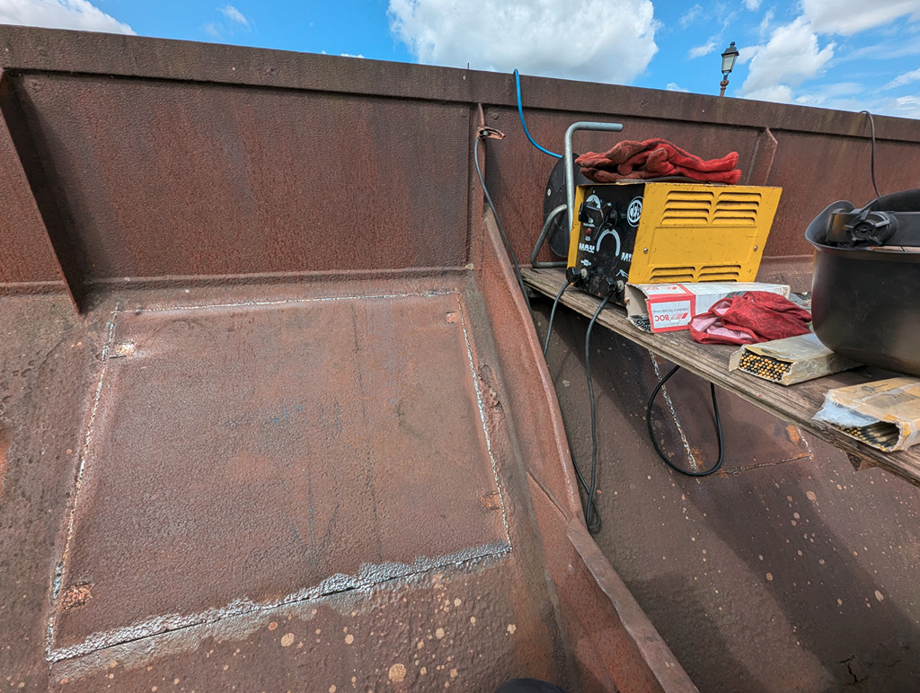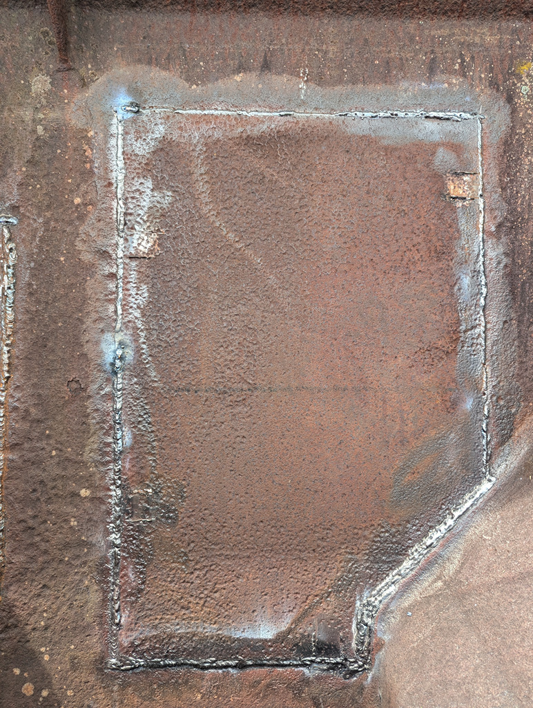 I began by finishing the big patch from last week which hadn’t been welded across the bottom joint. While I was doing that Ernie started cutting out the last patch on the East side, on the end under the hopper door control wheel.