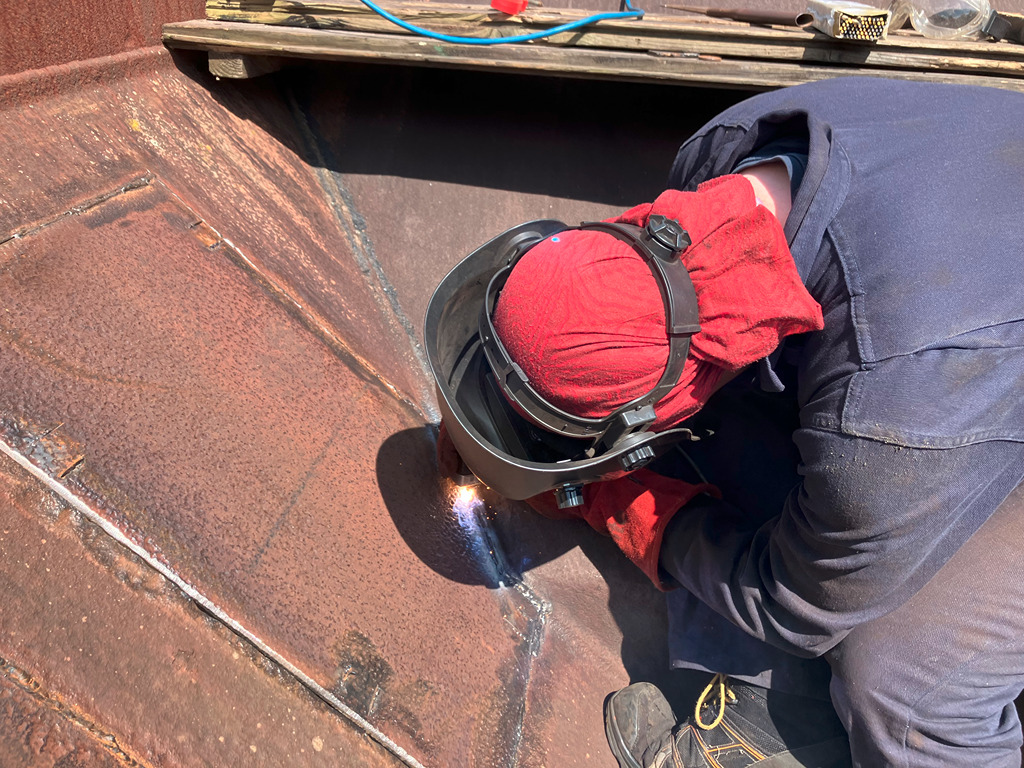 Ernie had got the plate cut out for the patch, which we fettled to fit the hole and got tacked into place.
