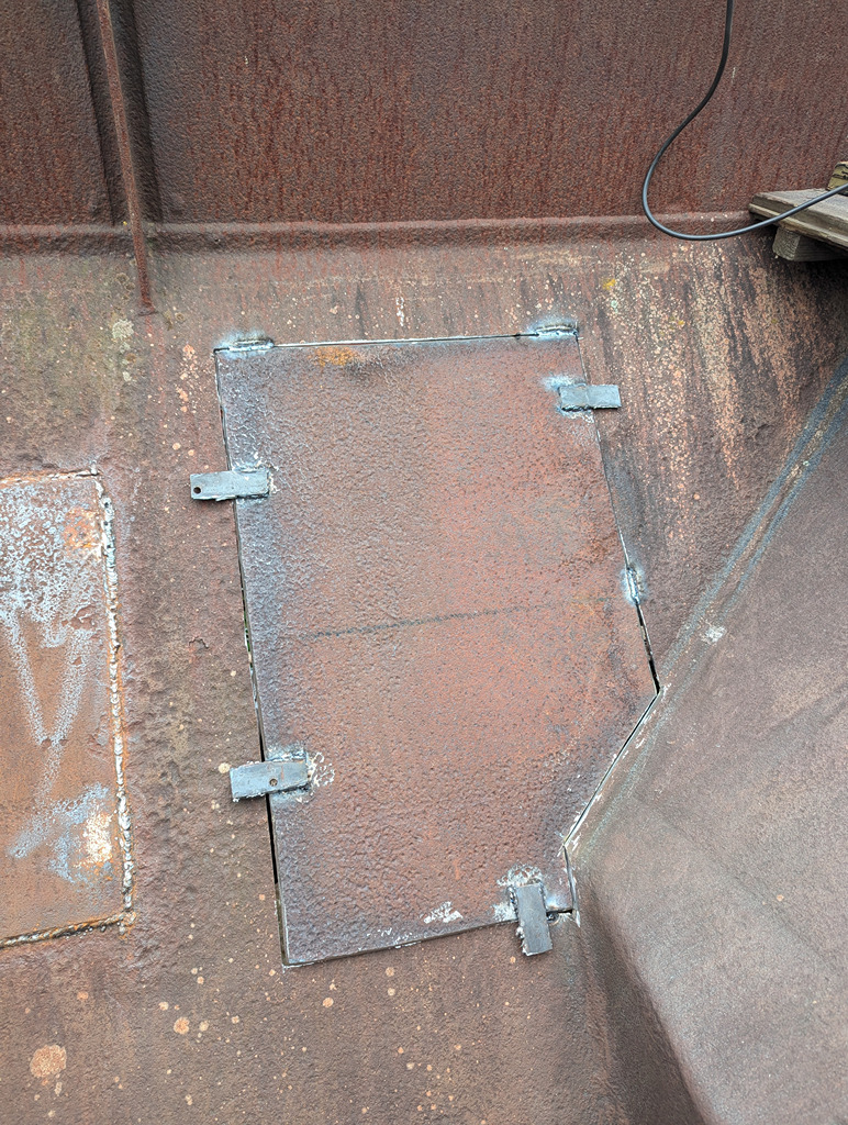 Once this once done, I got back on with the welding on the Catfish. The plate was welded around its perimeter and into the corner of the hopper. After a fantastic barbeque lunch (and time to let the welder cool down) I welded the last twelve inches on the side of the plate and Dan opened the door and swept out the bottom of the hopper. The access boards were removed now that the welding is finished on the inside of the hopper. Just the outside of the hopper to go!