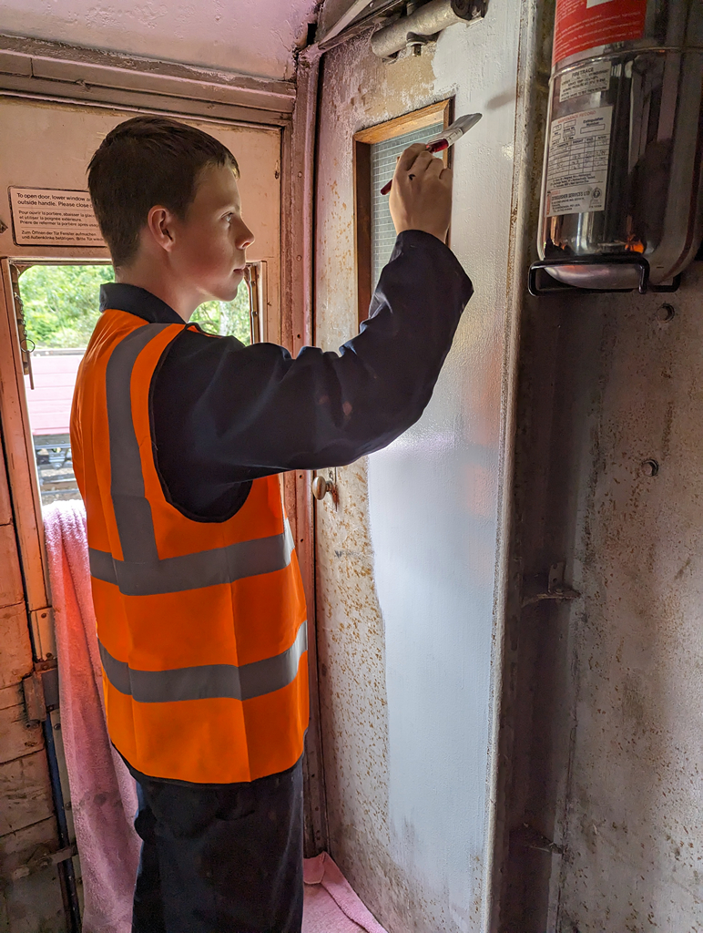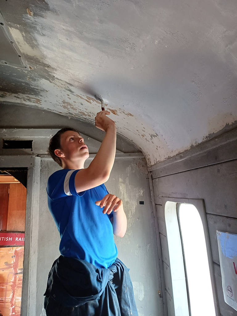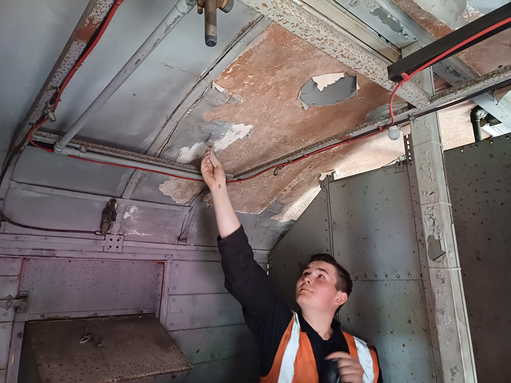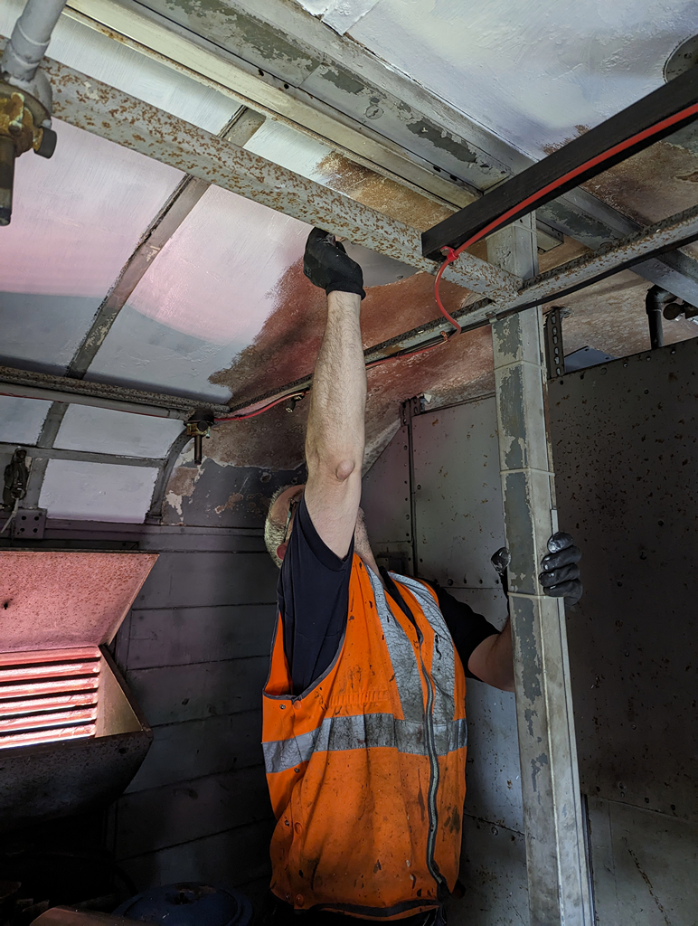 Come the weekend, Dave assisted by Thomas and Tom tidied the inside of the Test Car, even scraping the flaking paint from the generator compartment roof to then give it a fresh coat of white primer.