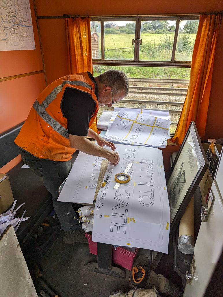 After the last few bits of bauxite gloss was applied to the PipeNick moved onto details on the wagon, those being the usual swan-necks, hand brake ends and lamp brackets while the lads painted the inside of the wagon with some wood preserver as an experiment. Dave also got a chance to start the signwriting, applying the vacuum relase chord stars and assembling the templates for the bodyside writing.