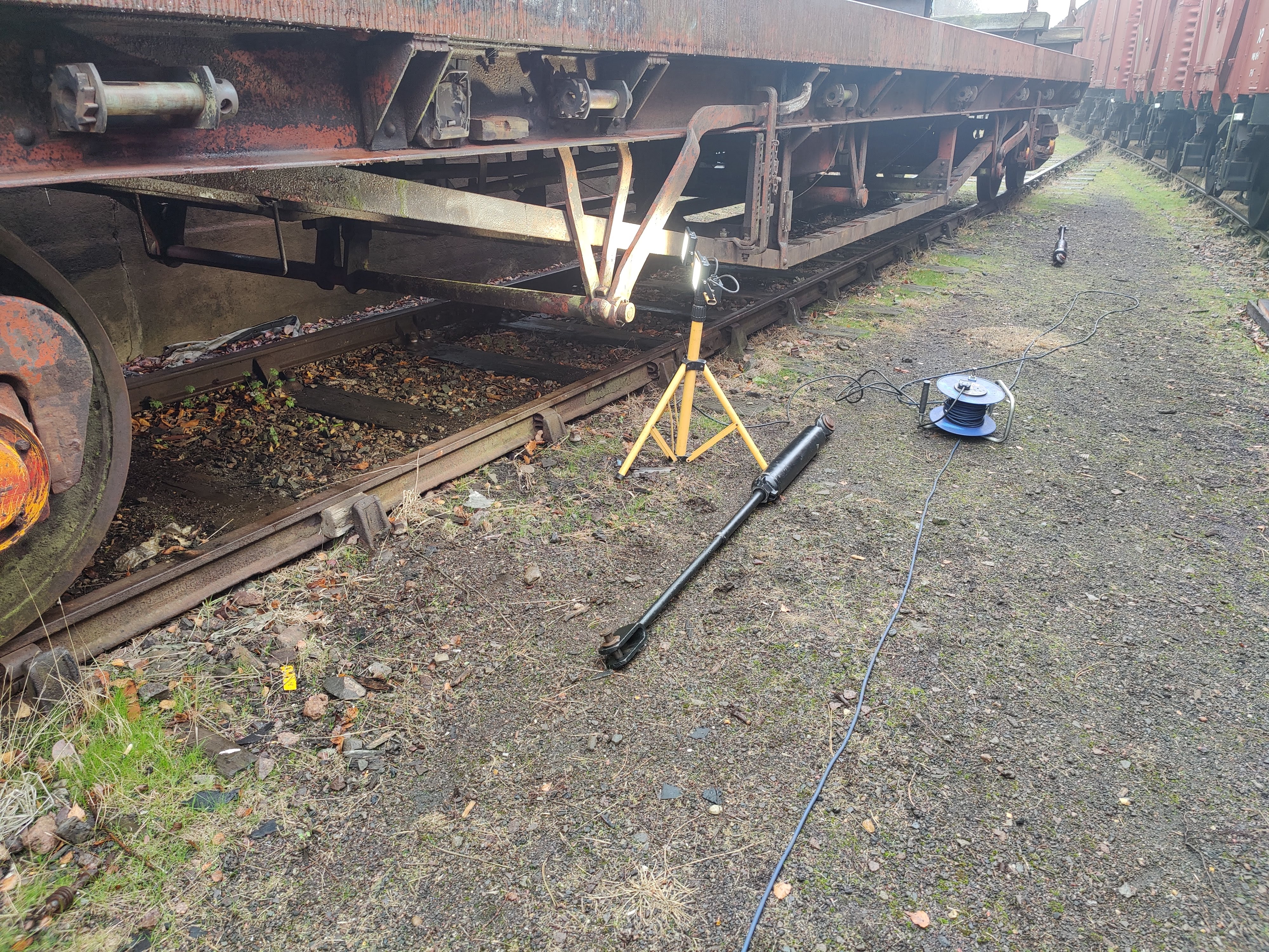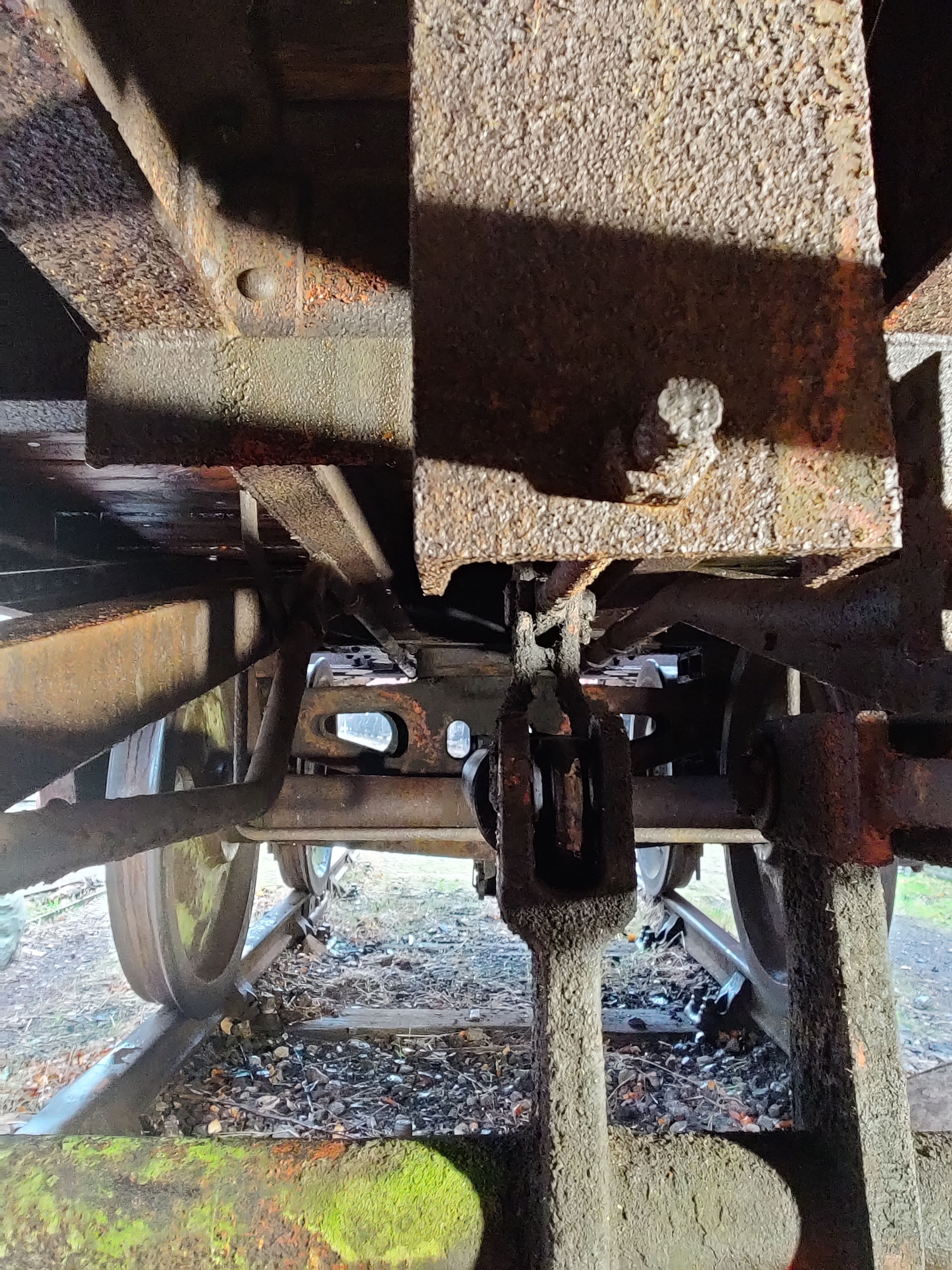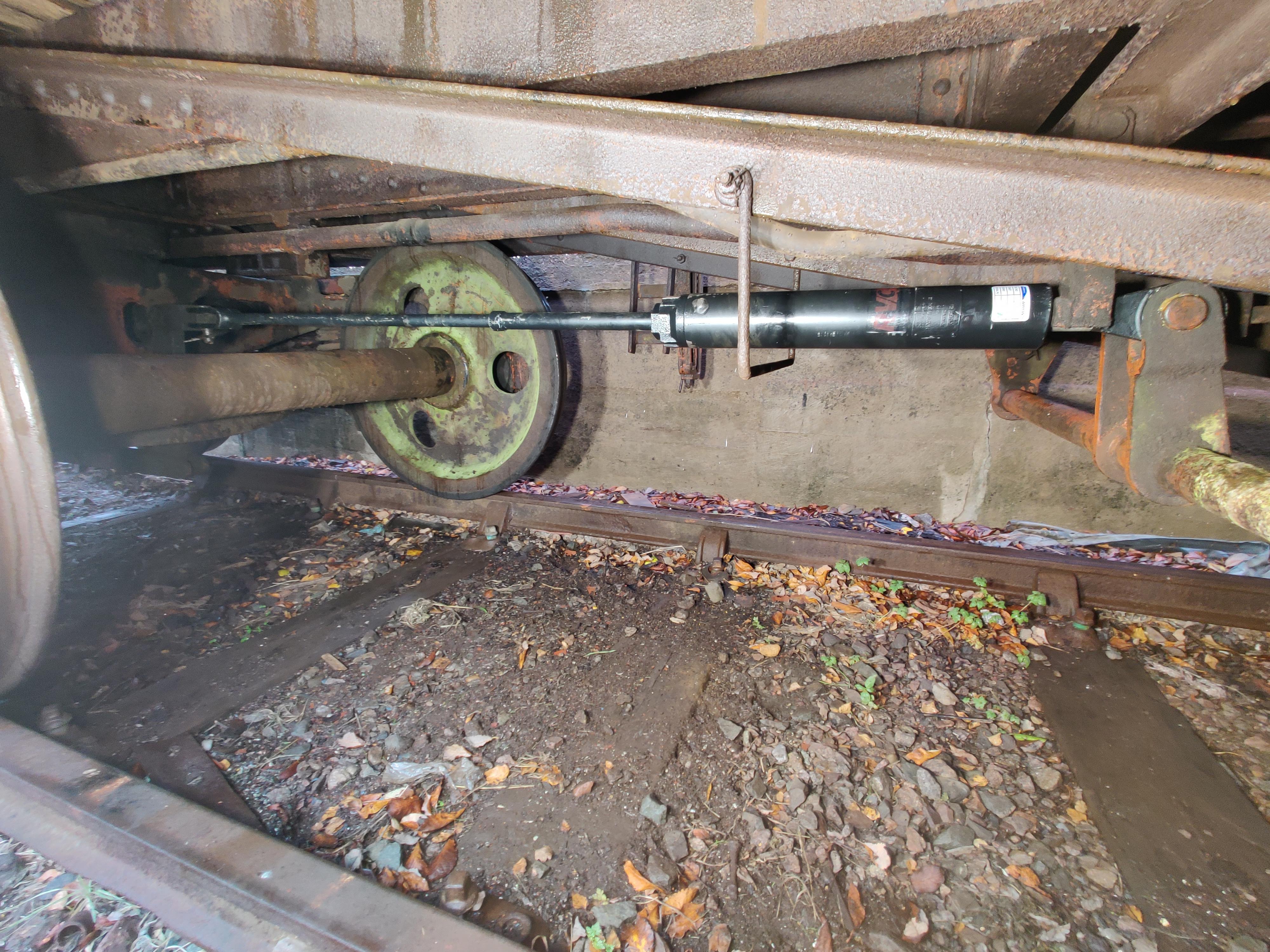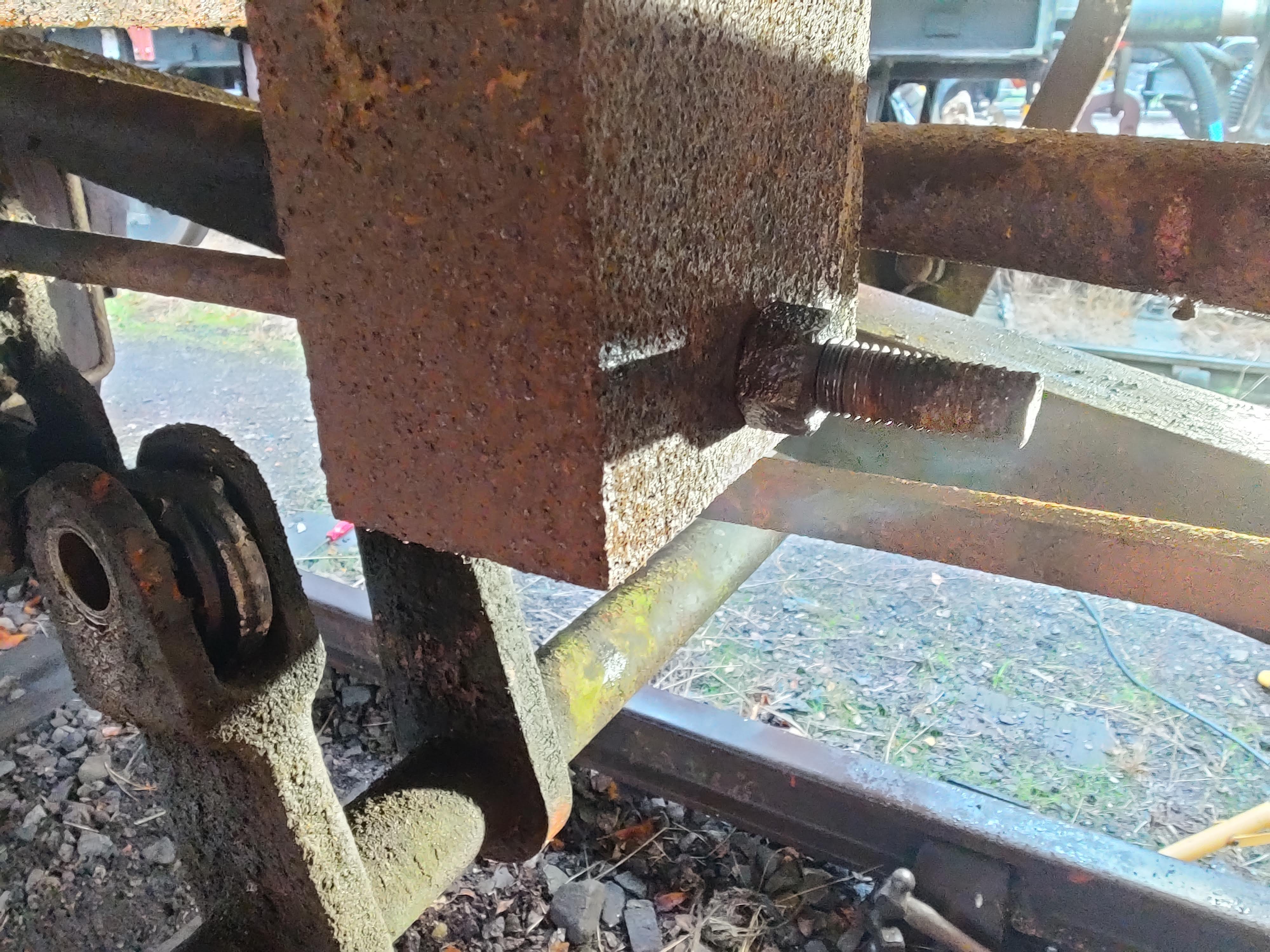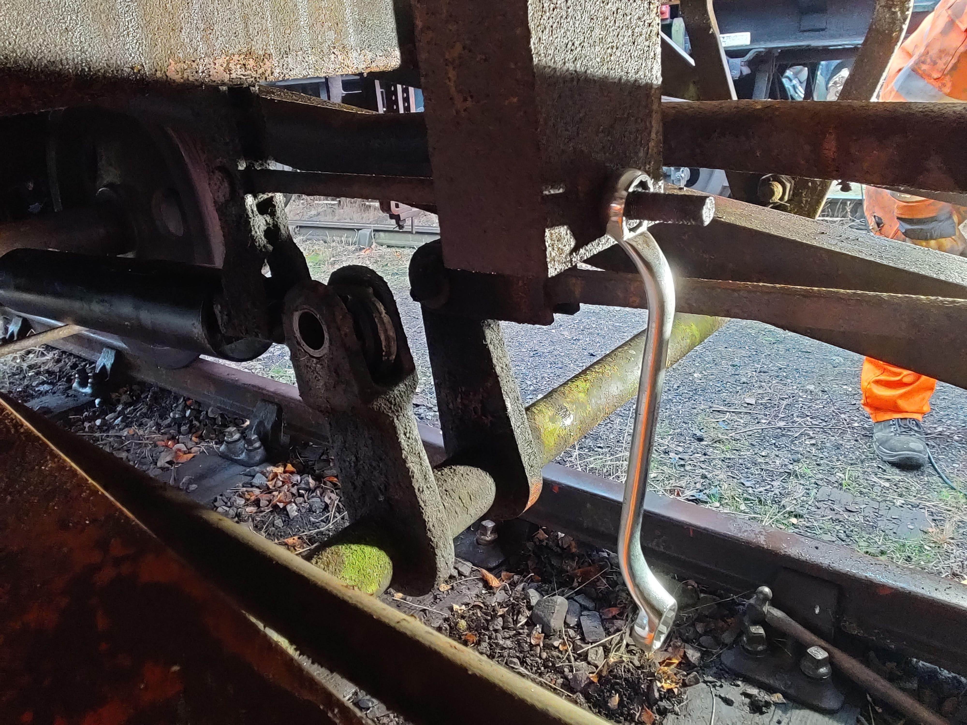 Starting at the North end, the slack adjuster was carefully lifted underneath and slotted into its safety loop and connected to the cross shaft. this was pinned up and the slack adjuster rotated to extend it to meet up with the correct linkage on the bogie. This was back together and pinned up within half an hour. Time for another cuppa, then to tackle the south end.