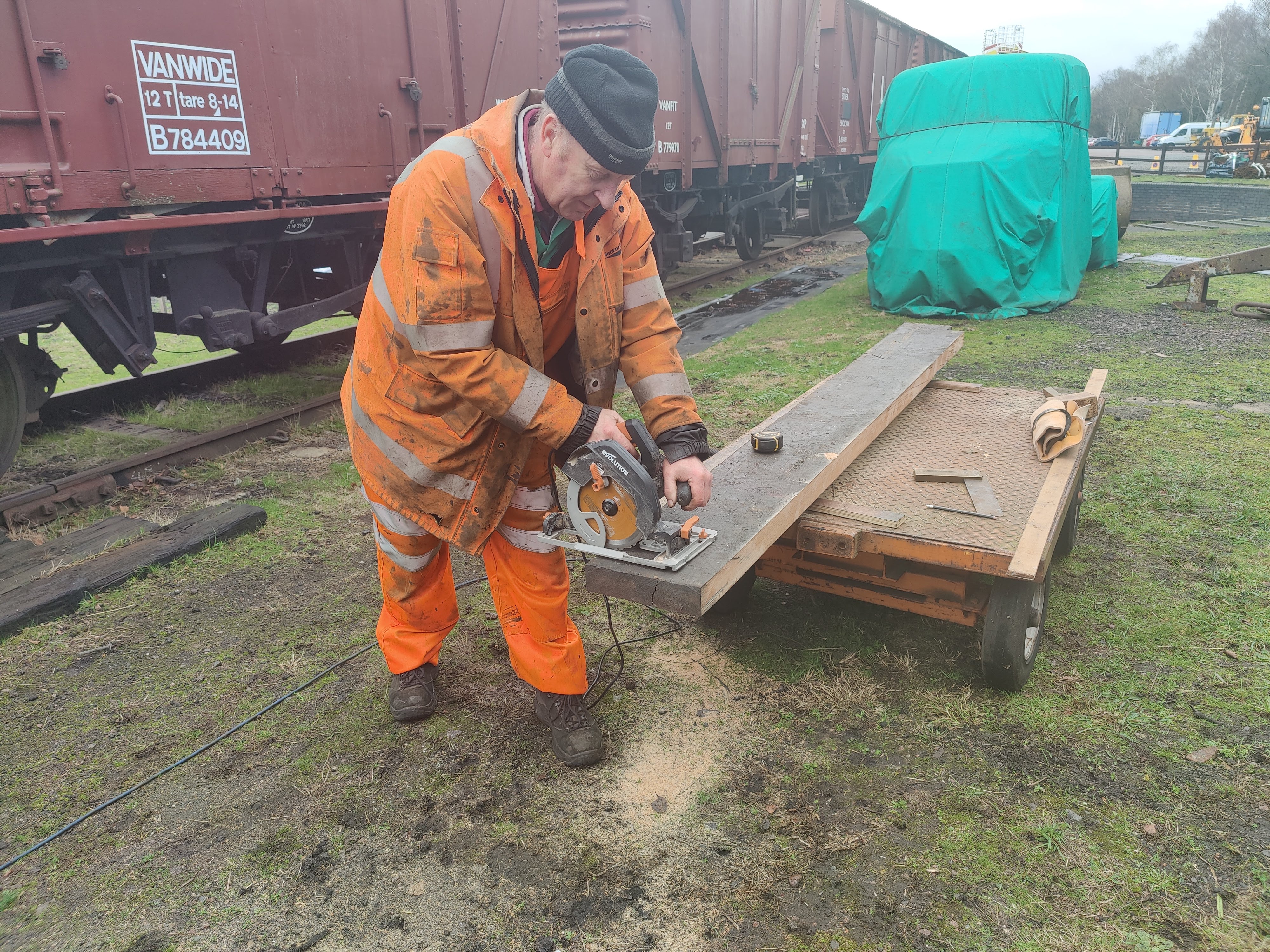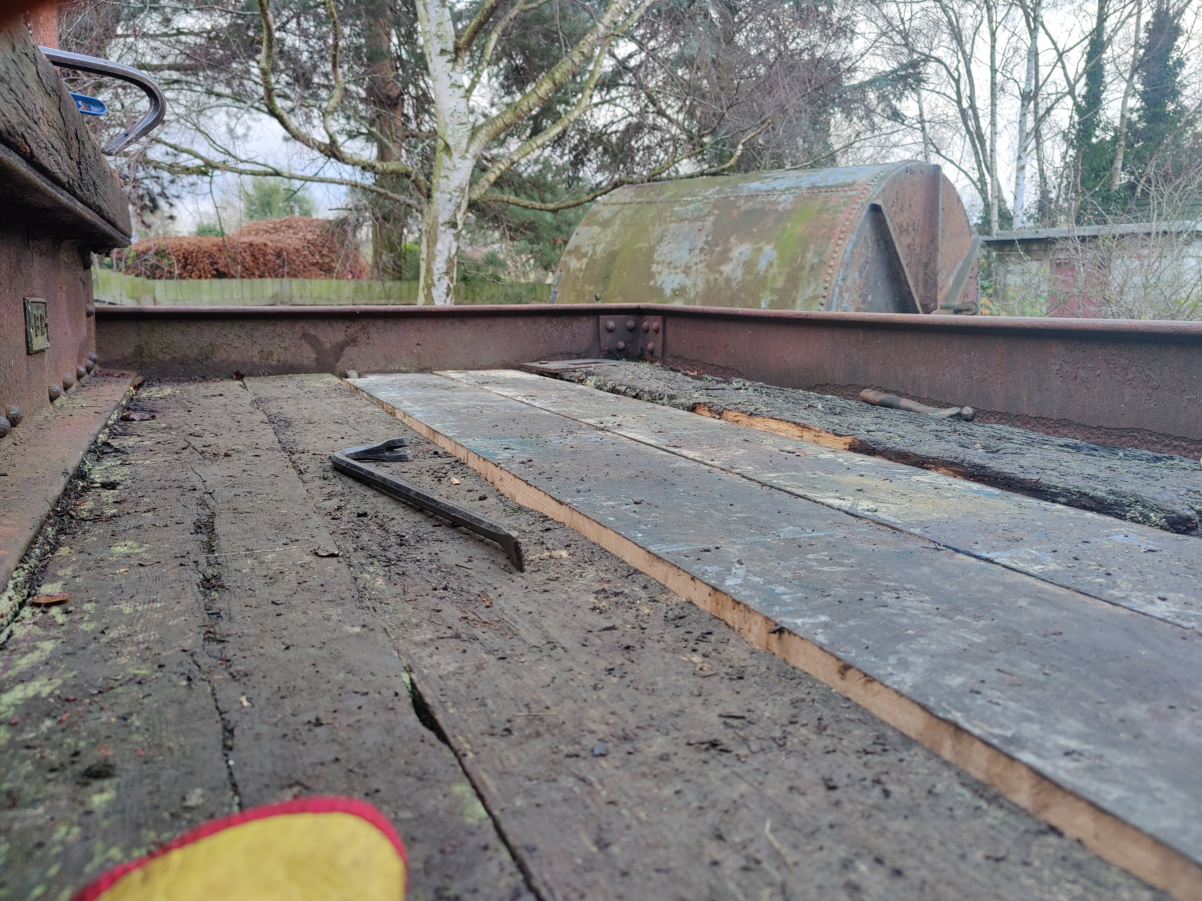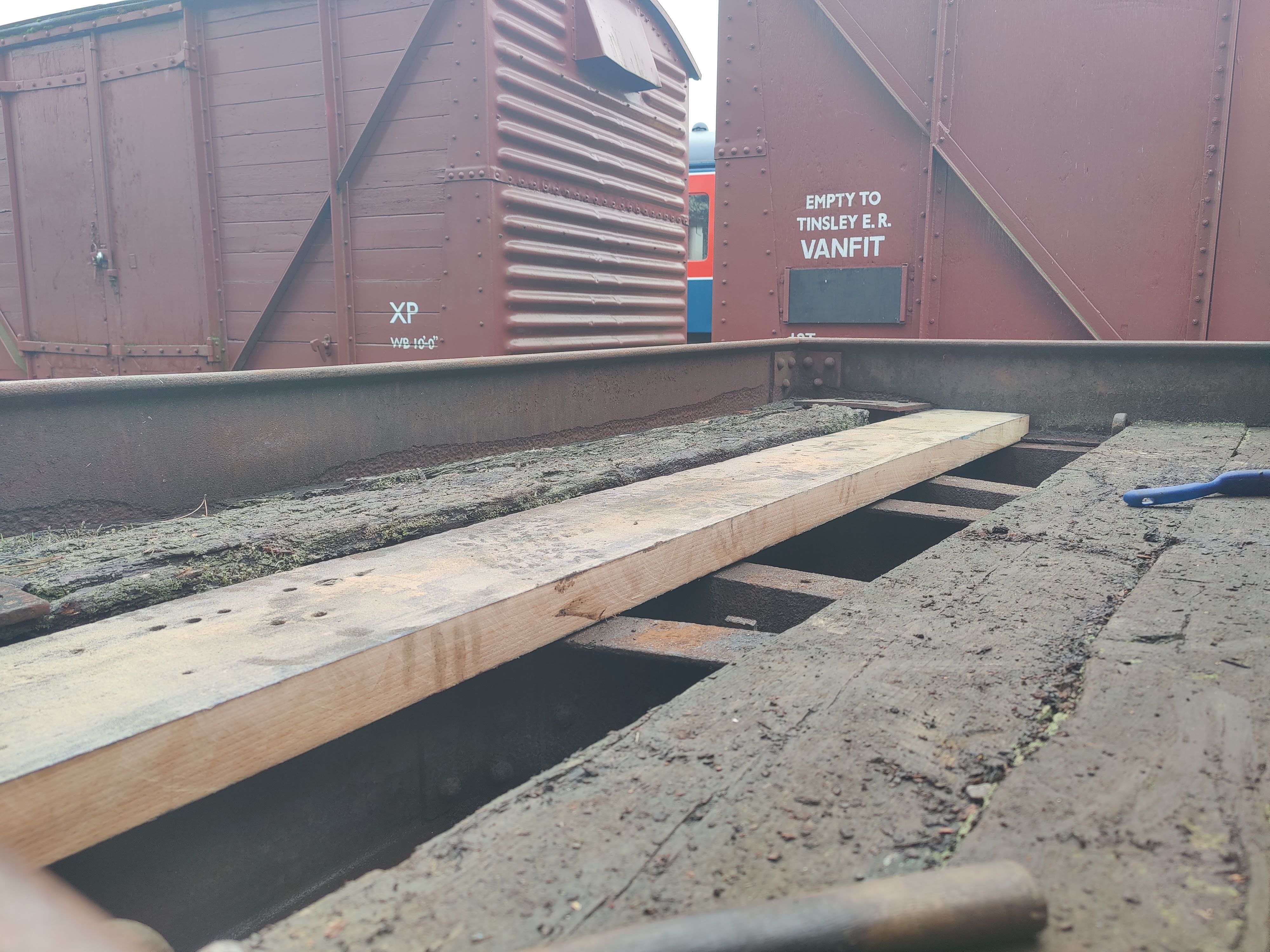 Today, in between rain showers, we sorted out 2 replacement floor planks for the south end of the wagon. Cut from an old workbench top, the two ‘planks’ were adjusted to suit their positions and fitted to the wagon.