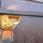 One of the doors had a hole straight through it. The top hinge was unbolted, loose fibreglass removed. Tape was applied to the inside and again the void filled and taped over